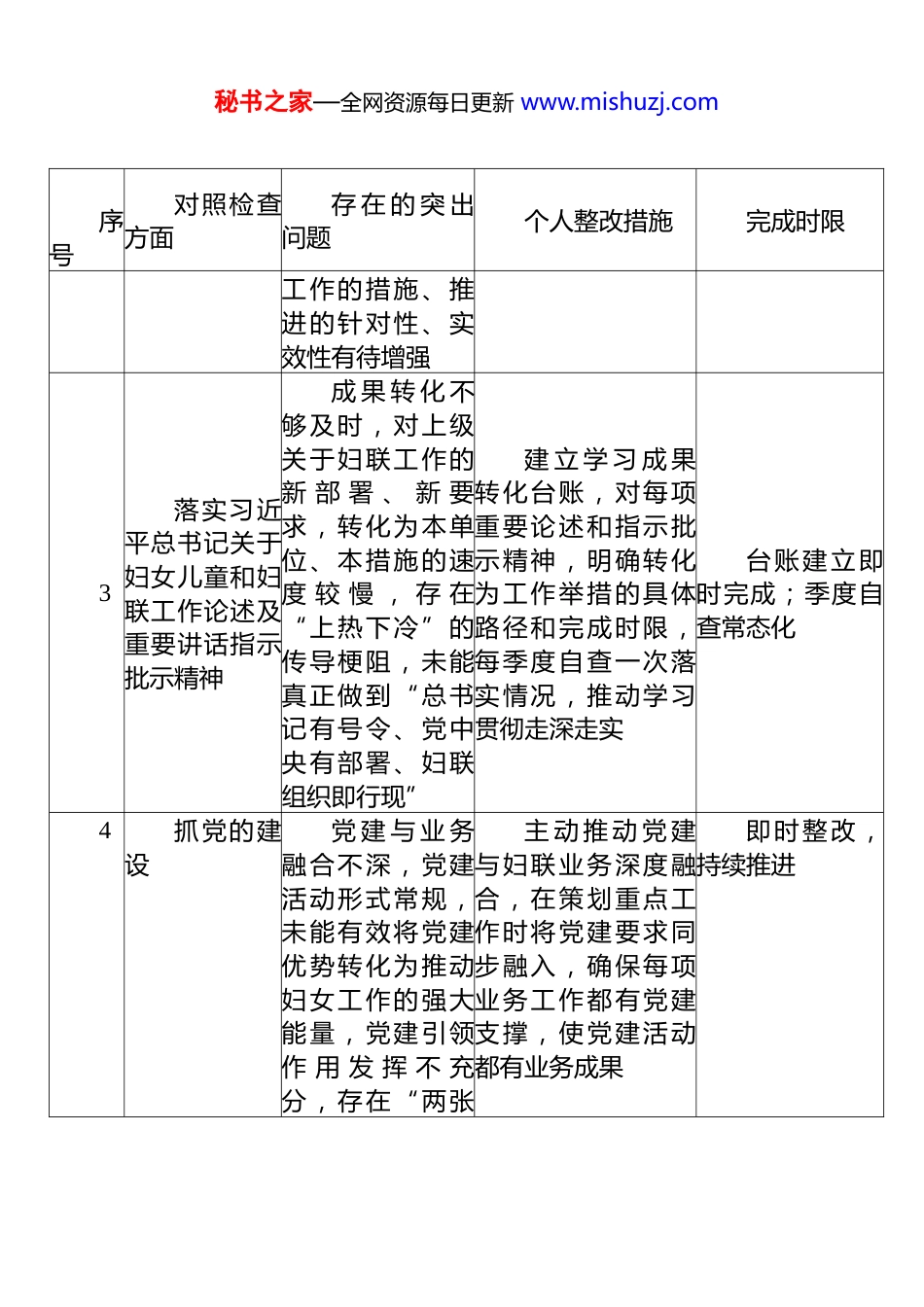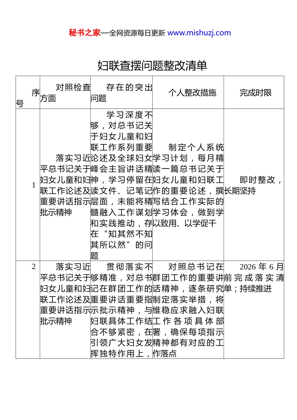 秘书之家—全网资源每日更新 www.mishuzj.com妇联查摆问题整改清单 序号对照检查方面存 在 的 突 出问题个人整改措施完成时限1落实习近平总书记关于妇女儿童和妇联工作论述及重要讲话指示批示精神学 习 深 度 不够,对总书记关于妇女儿童和妇联工作系列重要论述及全球妇女峰会主旨讲话精神,学习停留在读文件、记笔记层面,未能将精髓融入工作谋划和实践推动,存在“知其然不知其所以然”的问题制 定 个 人 系 统学习计划,每月精读一篇总书记关于妇女儿童和妇联工作的重要论述,撰写结合工作实际的学习体会,做到学以致用、以学促干即时整改,长期坚持2落实习近平总书记关于妇女儿童和妇联工作论述及重要讲话指示批示精神贯 彻 落 实 不够精准,对总书记在群团工作的重要讲话重要指示批示精神,与妇联具体工作结合不够紧密,在引领广大妇女发挥独特作用上,对 照 总 书 记 在群团工作的重要讲话精神,逐条研究制定落实举措,将维稳应求融入妇联工 作 各 项 具 体 部署,确保每项指示精神都有对应的工作落点2026 年 6 月前 完 成 落 实 清单;持续推进秘书之家—全网资源每日更新 www.mishuzj.com序号对照检查方面存 在 的 突 出问题个人整改措施完成时限工作的措施、推进的针对性、实效性有待增强3落实习近平总书记关于妇女儿童和妇联工作论述及重要讲话指示批示精神成 果 转 化 不够及时,对上级关于妇联工作的新 部 署 、 新 要求,转化为本单位、本措施的速度 较 慢 , 存 在“上热下冷”的传导梗阻,未能真正做到“总书记有号令、党中央有部署、妇联组织即行现”建 立 学 习 成 果转化台账,对每项重要论述和指示批示精神,明确转化为工作举措的具体路径和完成时限,每季度自查一次落实情况,推动学习贯彻走深走实台账建立即时完成;季度自查常态化4抓党的建设党 建 与 业 务融合不深,党建活动形式常规,未能有效将党建优势转化为推动妇女工作的强大能量,党建引领作 用 发 挥 不 充分,存在“两张主 动 推 动 党 建与妇联业务深度融合,在策划重点工作时将党建要求同步融入,确保每项业务工作都有党建支撑,使党建活动都有业务成果即时整改,持续推进秘书之家—全网资源每日更新 www.mishuzj.com序号对照检查方面存 在 的 突 出问题个人整改措施完成时限皮”现象5抓党的建设“三会一课”质量有待提升,组织生活在内容设 计 上 创 新 不足,有时存在程序化倾向,党员的思想碰撞和理论武装效果不够理想,组织生活的“熔炉”功能发挥不充分改 进 组 织 生 活方式,增加专题研讨、案例分析等互动环节,每次“三会一课”前认真备课,确保内容有深度、有温度;主动就工作中的难点问题在组织生活中开展讨论,提升党员教育实效即时整改,持续推进6抓党的建设党 风 廉 政 建设压力传导不够有 力 , 在 推 动“一岗双责”落实方面,落实开展廉政教育、下发提醒通知等常规动作,对各岗位廉政风险的精准防控和常态化督促力度不足改 变 “ 通 知式 ” 廉 政 教 育 惯性,主动与各岗位负责人开展“一对一”廉洁谈话,亲自督促其履行廉政责任;对发现的苗头 性 、 倾 向 性 问题 , 做 到 当 面 指出、当日记录,不拖延、不回避即时整改;每季度约谈督促不少于一次7坚持人民至上、践行为困 境 家 庭 精准 帮 扶 不 够 到主 动 开 展 困 境妇女专项摸排,建摸 排 台 账2026 年 6 月前建秘书之家—全网资源每日更新 www.mishuzj.com序号对照检查方面存 在 的 突 出问题个人整改措施完成时限民 服 务 宗 旨(困境家庭精准帮扶)位,对辖区内困境妇女家庭底数掌握不够全面,帮 扶 措 施 偏 于“输血”式,在激发妇女自我发展内生动力上办法不多,帮扶的精准性和可持续性有待增强立精准帮扶台账,推行“一户一策”帮扶模式;对长期困难家庭,亲自研究制定个性化帮扶方案,定期跟踪帮扶效果,确保帮扶措施真正解决实际问题立;帮扶方案长期跟进8坚持人民至上、践行为民 服 务 宗 旨(妇女创业发展扶持)妇 女 创 业 发展...