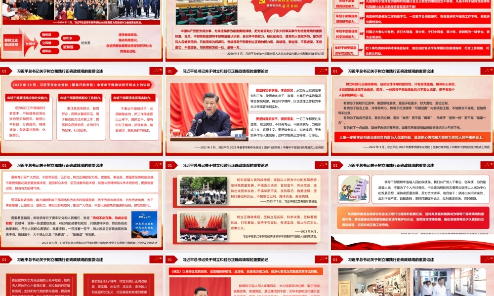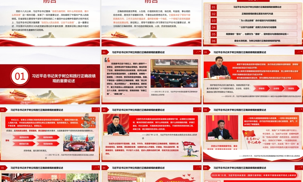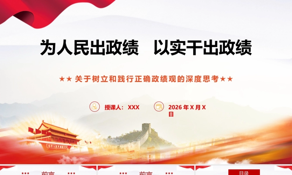 为人民出政绩 以实干出政绩授课人: XXX2026 年 X 月 X日★ ★ 关 于 树 立 和 践 行 正 确 政 绩 观 的 深 度 思 考 ★ ★党的十八大以来,习近平总书记围绕“政绩为谁而树、树什么样的政绩、靠什么树政绩”这一根本问题,发表了一系列重要论述,深刻阐明了中国共产党人的政绩观。在省部级主要领导干部学习贯彻党的二十届四中全会精神专题研讨班开班式上,习近平总书记再次强调要“自觉为人民出政绩、以实干出政绩”。这一重要论述,不仅是对马克思主义执政党建设理论的丰富和发展,更是新征程上推进中国式现代化建设的根本遵循和行动指南。前言正确政绩观是世界观、人生观、价值观和权力观、地位观、利益观、事业观的综合体现,是党员干部履职尽责、干事创业的思想总开关。它直接决定了领导干部的施政方向、工作方法和价值追求,最终影响着一个地区、一个领域乃至党和国家事业的发展全局。新征程上,领导干部要深入学习贯彻习近平总书记重要论述,树立和践行正确政绩观,努力创造经得起实践、人民、历史检验的实绩。前言目录01习近平总书记关于树立和践行正确政绩观的重要论述02正确政绩观的理论源流与时代内涵03“ 为人民出政绩”的价值旨归与实践路径04“ 以实干出政绩”的努力方向与行动指南05既要做好“显功”,也要甘为“潜绩”,坚持显功与潜绩的辩证统一06健全长效机制,为树立和践行正确政绩观保驾护航习近平总书记关于树立和践行正确政绩观的重要论述01 习近平总书记关于树立和践行正确政绩观的重要论述01——2015 年 1 月 12 日,习近平在中央党校县委书记研修班学员座谈会上的讲话在县委书记这个岗位上,很多人都想干一番事业,这种想法和干劲是必须有的。我当年到了正定,看到老百姓生活比较贫困、经济社会发展水平比较落后的情形,心里很着急,的确有一股激情、一种志向,想尽快改变这种面貌。但是,干事创业一定要树立正确政绩观,做到“民之所好好之,民之所恶恶之”。要求真务实、真抓实干,做工作自觉从人民利益出发,决不能为了树立个人形象,搞华而不实、劳民伤财的“形象工程”、“政绩工程”。 习近平总书记关于树立和践行正确政绩观的重要论述01保护那些作风正派又敢作敢为、锐意进取的干部,最大限度调动广大干部的积极性、主动性、创造性,激励他们更好带领群众干事创业。要把干部在推进改革中因缺乏经验、先行先试出现的失误和错误,同明知故犯的违纪违法行为区分开来;把上级尚无明确限制的探索性试验中的失误和错误,同上级明令禁止后依然我行我素的违纪违法行为区分开来;把为推动发展的无意过失,同为谋取私利的违纪违法行为区分开来 ;积极性主动性创造性——2016 年 1 月,习近平在省部级主要领导干部学习贯彻党的十八届五中全会精神专题研讨班开班式的讲话 习近平总书记关于树立和践行正确政绩观的重要论述01——2017 年 12 月,习近平在中共中央政治局民主生活会上的讲话形式主义、官僚主义同我们党的性质宗旨和优良作风格格不入,是我们党的大敌、人民的大敌。中央政治局的同志必须带头树立正确政绩观,始终做老实人、说老实话、干老实事,自觉反对形式主义、官僚主义。抓落实,是党的政治路线、思想路线、群众路线的根本要求,也是衡量领导干部党性和政绩观的重要标志。抓铁有痕、踏石留印抓落实。真抓的实劲敢抓的狠劲善抓的巧劲常抓的韧劲要有 习近平总书记关于树立和践行正确政绩观的重要论述01——2017 年 12 月,习近平在中共中央政治局民主生活会上的讲话大家作为中央委员会的成员和省部级主要领导干部,必须树立正确政绩观,解决好政绩为谁而树、树什么样的政绩、靠什么树政绩的问题,多做打基础、利长远的事,不搞脱离实际的盲目攀比,不搞劳民伤财的形象工程、政绩工程,真正做到对历史和人民负责。功成不必在我并不是消极、怠政、不作为,而是要牢固树立正确政绩观,既要做让老百姓看得见、摸得着、得实惠的实事,也要做为后人作铺垫、打基础、利长远的好事,既要做显功,也要做潜功,不计较个人功名,追求人民群众的好口碑、历史沉淀之后真正的评价。 习近平总书记关于树立和践行...