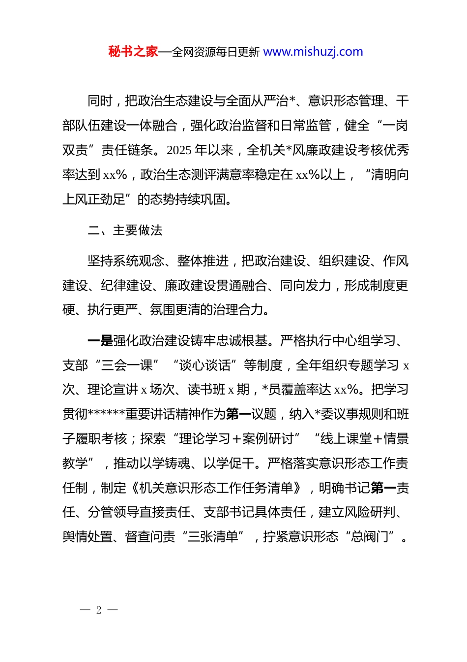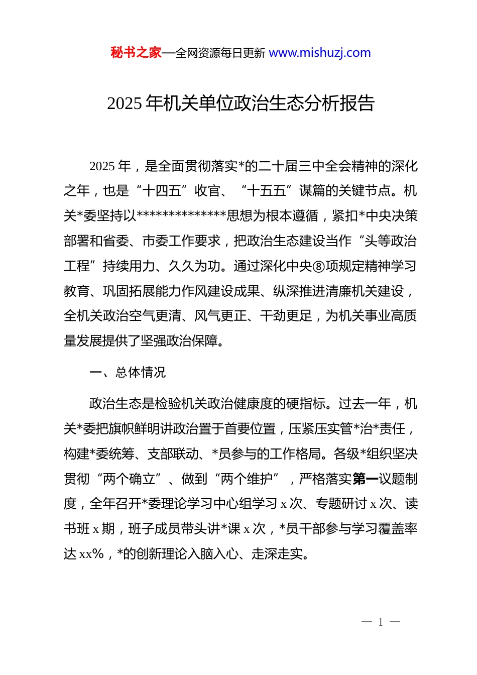 秘书之家—全网资源每日更新 www.mishuzj.com2025 年机关单位政治生态分析报告2025 年,是全面贯彻落实*的二十届三中全会精神的深化之年,也是“十四五”收官、“十五五”谋篇的关键节点。机关*委坚持以**************思想为根本遵循,紧扣*中央决策部署和省委、市委工作要求,把政治生态建设当作“头等政治工程”持续用力、久久为功。通过深化中央⑧项规定精神学习教育、巩固拓展能力作风建设成果、纵深推进清廉机关建设,全机关政治空气更清、风气更正、干劲更足,为机关事业高质量发展提供了坚强政治保障。一、总体情况政治生态是检验机关政治健康度的硬指标。过去一年,机关*委把旗帜鲜明讲政治置于首要位置,压紧压实管*治*责任,构建*委统筹、支部联动、*员参与的工作格局。各级*组织坚决贯彻“两个确立”、做到“两个维护”,严格落实第一议题制度,全年召开*委理论学习中心组学习 x 次、专题研讨 x 次、读书班 x 期,班子成员带头讲*课 x 次,*员干部参与学习覆盖率达 xx%,*的创新理论入脑入心、走深走实。— 1 —秘书之家—全网资源每日更新 www.mishuzj.com同时,把政治生态建设与全面从严治*、意识形态管理、干部队伍建设一体融合,强化政治监督和日常监管,健全“一岗双责”责任链条。2025 年以来,全机关*风廉政建设考核优秀率达到 xx%,政治生态测评满意率稳定在 xx%以上,“清明向上风正劲足”的态势持续巩固。二、主要做法坚持系统观念、整体推进,把政治建设、组织建设、作风建设、纪律建设、廉政建设贯通融合、同向发力,形成制度更硬、执行更严、氛围更清的治理合力。一是强化政治建设铸牢忠诚根基。严格执行中心组学习、支部“三会一课”“谈心谈话”等制度,全年组织专题学习 x次、理论宣讲 x 场次、读书班 x 期,*员覆盖率达 xx%。把学习贯彻******重要讲话精神作为第一议题,纳入*委议事规则和班子履职考核;探索“理论学习+案例研讨”“线上课堂+情景教学”,推动以学铸魂、以学促干。严格落实意识形态工作责任制,制定《机关意识形态工作任务清单》,明确书记第一责任、分管领导直接责任、支部书记具体责任,建立风险研判、舆情处置、督查问责“三张清单”,拧紧意识形态“总阀门”。— 2 —秘书之家—全网资源每日更新 www.mishuzj.com二是突出 dj 引领提升组织动能。坚持 dj 与中心工作同谋划、同部署、同考核,全年召开民主生活会 x 次、组织生活会 x 次,整改问题 xx 项、整改率 100%。推行“dj+业务+服务”闭环机制,落实 dj 工作责任清单,形成“书记抓、支部建、*员带”的责任体系。创建“清廉机关·红色支部”,打造*员先锋岗 x个、*员责任区 x 个,评选先进*支部 x 个、优秀共产*员 x 名;实施“达标评星”,xx%以上支部达到“示范型”。建立 dj 工作季度通报、排名通报、约谈提醒、整改销号机制,压实 dj“硬约束”。三是加强干部监督优化选用生态。坚持德才兼备、以德为先,把政治标准放在第一位。全年对拟提拔干部开展政治素质考察 x 人次、监督谈话 x 人次,发现苗头性问题 x 个并及时纠偏。探索“政治素质纪实档案”,做实组织、人事、纪检“三线联动”。深化年轻干部培养,推行“青蓝结对、轮岗锻炼、挂职交流”,选派 x 人赴重点岗位历练,举办专题培训班 x 期、参训 x 人次,健全能上能下、优进绌退的用人生态。四是筑牢廉政防线深化清廉建设。常态化开展廉政与警示教育,组织观看廉政教育片 x 场次、廉政基地教学 x 次、廉洁谈话 x 人次。印发《廉政风险防控清单》,动态梳理重点领域— 3 —秘书之家—全网资源每日更新 www.mishuzj.com风险点 x 个、制定防控措施 x 条,形成“岗位找风险、部门建台账、纪委常监督”的闭环。聚焦违规公款吃喝、公车私用、公款送礼等顽疾,明察暗访 x 次、发现问题 x 项、整改率100%。推进廉洁文化进机关、进支部、进家庭,组织“廉韵机关”“清风伴我行”等活动,营造崇廉尚廉的浓厚氛围。五是完善制度体系规范权力运行。修订完善《*委议事规则》《机关财务管理办法》《三重一大事项决策实施细则》《干部监督管理办...