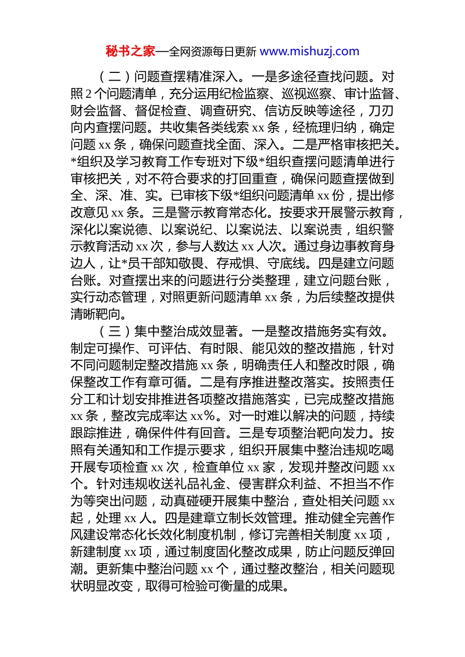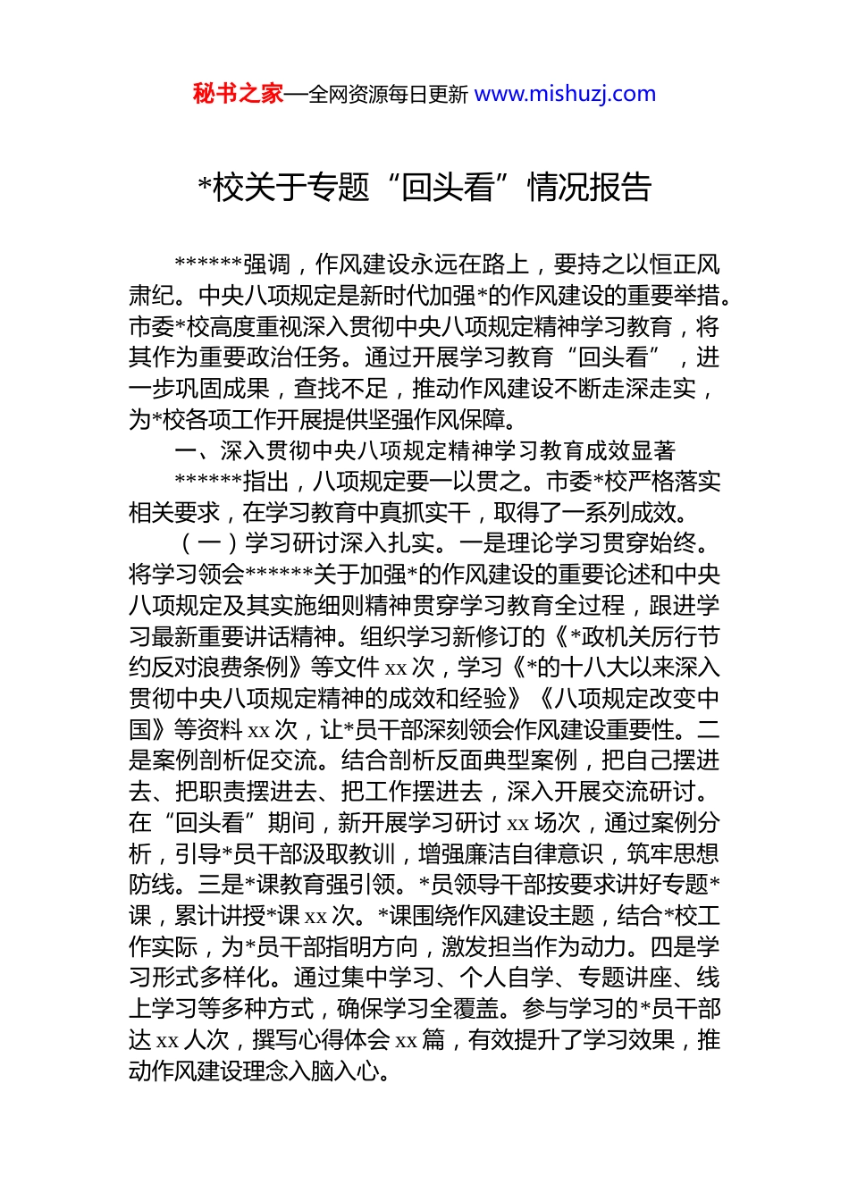 秘书之家—全网资源每日更新 www.mishuzj.com*校关于专题“回头看”情况报告******强调,作风建设永远在路上,要持之以恒正风肃纪。中央八项规定是新时代加强*的作风建设的重要举措。市委*校高度重视深入贯彻中央八项规定精神学习教育,将其作为重要政治任务。通过开展学习教育“回头看”,进一步巩固成果,查找不足,推动作风建设不断走深走实,为*校各项工作开展提供坚强作风保障。一、深入贯彻中央八项规定精神学习教育成效显著******指出,八项规定要一以贯之。市委*校严格落实相关要求,在学习教育中真抓实干,取得了一系列成效。(一)学习研讨深入扎实。一是理论学习贯穿始终。将学习领会******关于加强*的作风建设的重要论述和中央八项规定及其实施细则精神贯穿学习教育全过程,跟进学习最新重要讲话精神。组织学习新修订的《*政机关厉行节约反对浪费条例》等文件 xx 次,学习《*的十八大以来深入贯彻中央八项规定精神的成效和经验》《八项规定改变中国》等资料 xx 次,让*员干部深刻领会作风建设重要性。二是案例剖析促交流。结合剖析反面典型案例,把自己摆进去、把职责摆进去、把工作摆进去,深入开展交流研讨。在“回头看”期间,新开展学习研讨 xx 场次,通过案例分析,引导*员干部汲取教训,增强廉洁自律意识,筑牢思想防线。三是*课教育强引领。*员领导干部按要求讲好专题*课,累计讲授*课 xx 次。*课围绕作风建设主题,结合*校工作实际,为*员干部指明方向,激发担当作为动力。四是学习形式多样化。通过集中学习、个人自学、专题讲座、线上学习等多种方式,确保学习全覆盖。参与学习的*员干部达 xx 人次,撰写心得体会 xx 篇,有效提升了学习效果,推动作风建设理念入脑入心。秘书之家—全网资源每日更新 www.mishuzj.com(二)问题查摆精准深入。一是多途径查找问题。对照 2 个问题清单,充分运用纪检监察、巡视巡察、审计监督、财会监督、督促检查、调查研究、信访反映等途径,刀刃向内查摆问题。共收集各类线索 xx 条,经梳理归纳,确定问题 xx 条,确保问题查找全面、深入。二是严格审核把关。*组织及学习教育工作专班对下级*组织查摆问题清单进行审核把关,对不符合要求的打回重查,确保问题查摆做到全、深、准、实。已审核下级*组织问题清单 xx 份,提出修改意见 xx 条。三是警示教育常态化。按要求开展警示教育,深化以案说德、以案说纪、以案说法、以案说责,组织警示教育活动 xx 次,参与人数达 xx 人次。通过身边事教育身边人,让*员干部知敬畏、存戒惧、守底线。四是建立问题台账。对查摆出来的问题进行分类整理,建立问题台账,实行动态管理,对照更新问题清单 xx 条,为后续整改提供清晰靶向。(三)集中整治成效显著。一是整改措施务实有效。制定可操作、可评估、有时限、能见效的整改措施,针对不同问题制定整改措施 xx 条,明确责任人和整改时限,确保整改工作有章可循。二是有序推进整改落实。按照责任分工和计划安排推进各项整改措施落实,已完成整改措施xx 条,整改完成率达 xx%。对一时难以解决的问题,持续跟踪推进,确保件件有回音。三是专项整治靶向发力。按照有关通知和工作提示要求,组织开展集中整治违规吃喝开展专项检查 xx 次,检查单位 xx 家,发现并整改问题 xx个。针对违规收送礼品礼金、侵害群众利益、不担当不作为等突出问题,动真碰硬开展集中整治,查处相关问题 xx起,处理 xx 人。四是建章立制长效管理。推动健全完善作风建设常态化长效化制度机制,修订完善相关制度 xx 项,新建制度 xx 项,通过制度固化整改成果,防止问题反弹回潮。更新集中整治问题 xx 个,通过整改整治,相关问题现状明显改变,取得可检验可衡量的成果。秘书之家—全网资源每日更新 www.mishuzj.com(四)开门教育成效凸显。一是情况通报公开透明。领导班子立行立改、集中整治等情况向*员、群众通报,各*委(*组)采取召开内部会议、公示等适当方式,向*员、群众通报领导班子立行立改、集中整治等情况 xx 次,接受群众监督,增强群众信任。二是解决难题贴近群众。领导干部带头走好新时代*的群众路...