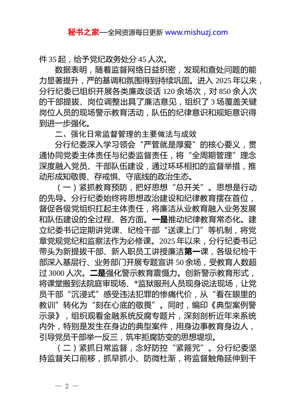 秘书之家—全网资源每日更新 www.mishuzj.com关于银行分行党员、干部队伍建设情况的分析研判报告为深入贯彻落实习近平总书记关于全面从严治党、加强干部队伍管理监督的重要论述,根据上级行党委和纪委的统一部署,*分行纪委坚持严管与厚爱相结合,以“全周期管理”理念为指引,持续强化对全行党组织、党员和干部队伍的日常监督管理。通过构建常态化、多维度、深层次的监督体系,及时掌握队伍建设动态,精准“画像”,为推动分行高质量发展提供坚实的纪律保障和组织基础。现将有关情况分析研判如下。一、党员、干部队伍基本情况与监督管理概况(一)队伍基本构成截至 2025 年第三季度,*分行全辖共有在职员工约 3500 人。其中,中共党员 2150 名,占员工总数的 61.4%,党员队伍结构持续优化,先锋模范作用在各条线日益凸显。全行共有科级及以上干部 850 名,其中处级及以上干部 150 名,形成了一支年富力强、专业精干的管理骨干力量。干部队伍平均年龄 42 岁,大学本科及以上学历占比达到 95%,专业结构与我行业务发展需求匹配度较高。(二)日常监督管理数据分行纪委始终把纪律和规矩挺在前面,监督执纪力度逐年增强。近三年来,日常监督检查与执纪问责情况如下:2022 年度,开展各类监督检查 1500 余次,立案审查违纪案件 25 起,给予党纪政务处分 32 人次。2023 年度,开展各类监督检查 1850 余次,立案审查违纪案件 31 起,给予党纪政务处分 40 人次。2024 年度,开展各类监督检查 2100 余次,立案审查违纪案— 1 —秘书之家—全网资源每日更新 www.mishuzj.com件 35 起,给予党纪政务处分 45 人次。数据表明,随着监督网络日益织密,发现和查处问题的能力显著提升,严的基调和氛围得到持续巩固。进入 2025 年以来,分行纪委已组织开展各类廉政谈话 120 余场次,对 850 余人次的干部提拔、岗位调整出具了廉洁意见,组织了 3 场覆盖关键岗位人员的现场警示教育活动,队伍的纪律意识和规矩意识得到进一步强化。二、强化日常监督管理的主要做法与成效分行纪委深入学习领会“严管就是厚爱”的核心要义,贯通协同党委主体责任与纪委监督责任,将“全周期管理”理念深度融入党员、干部队伍建设,通过环环相扣的监督举措,推动形成知敬畏、存戒惧、守底线的政治生态。(一)紧抓教育预防,把好思想“总开关”。思想是行动的先导。分行纪委始终将思想政治建设和纪律教育摆在首位,督促各级党组织扛起主体责任,将廉洁从业教育融入业务发展和队伍建设的全过程、各方面。一是推动纪律教育常态化。建立纪委书记定期讲党课、纪检干部“送课上门”等机制,将党章党规党纪和监察法作为必修课。2025 年以来,分行纪委书记带头为新提拔干部、新入职员工讲授廉洁第一课,各级纪检干部深入基层行、业务部门开展专题宣讲 50 余场,受教育人数超过 3000 人次。二是强化警示教育震慑力。创新警示教育形式,将课堂搬到法院庭审现场、*监狱服刑人员现身说法现场,让党员干部“沉浸式”感受违法犯罪的惨痛代价,从“看在眼里的教训”转化为“刻在心底的敬畏”。同时,编印《典型案例警示录》,组织观看金融系统反腐专题片,深刻剖析近年来系统内外,特别是发生在身边的典型案件,用身边事教育身边人,引导党员干部举一反三,筑牢拒腐防变的思想堤坝。(二)紧抓日常监督,念好防控“紧箍咒”。分行纪委坚持监督关口前移,抓早抓小、防微杜渐,将监督触角延伸到干— 2 —秘书之家—全网资源每日更新 www.mishuzj.com部日常工作和生活的方方面面,让干部时刻感受到监督的存在。一是聚焦“关键少数”和关键环节。严格落实干部廉洁监督“八项措施”,形成了一套行之有效的组合拳。每年向各级行“一把手”签发年度倡廉“一封信”,压实其管党治党第一责任人责任;组织新提拔干部进行廉洁宣誓并签订承诺书,答好任前“一张卷”;向干部家属发出廉洁齐家“一封信”,倡导良好家风;通过集体或个别廉政谈话,为新入职、新提拔、新调整的干部打好“预防针”。二是做实政治监督和职能监督。推动政治监督具体化、常态化,将贯彻落实党中央重大决策部署、服...