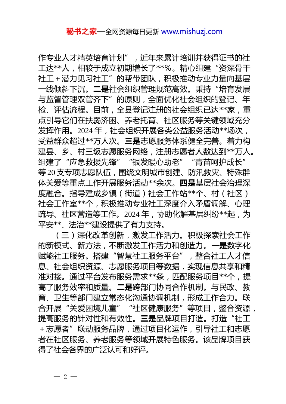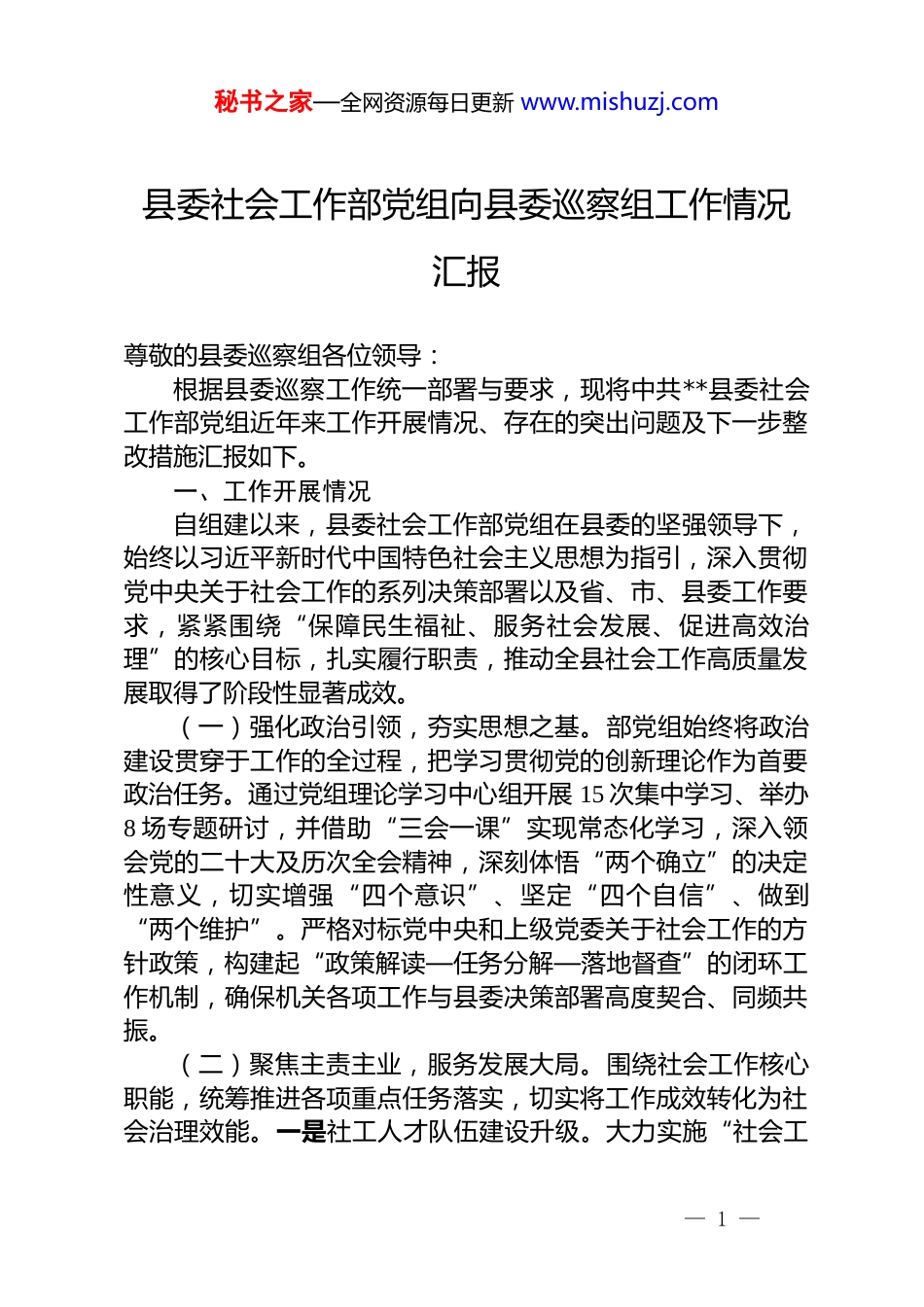 秘书之家—全网资源每日更新 www.mishuzj.com县委社会工作部党组向县委巡察组工作情况汇报尊敬的县委巡察组各位领导:根据县委巡察工作统一部署与要求,现将中共**县委社会工作部党组近年来工作开展情况、存在的突出问题及下一步整改措施汇报如下。一、工作开展情况自组建以来,县委社会工作部党组在县委的坚强领导下,始终以习近平新时代中国特色社会主义思想为指引,深入贯彻党中央关于社会工作的系列决策部署以及省、市、县委工作要求,紧紧围绕“保障民生福祉、服务社会发展、促进高效治理”的核心目标,扎实履行职责,推动全县社会工作高质量发展取得了阶段性显著成效。(一)强化政治引领,夯实思想之基。部党组始终将政治建设贯穿于工作的全过程,把学习贯彻党的创新理论作为首要政治任务。通过党组理论学习中心组开展 15 次集中学习、举办8 场专题研讨,并借助“三会一课”实现常态化学习,深入领会党的二十大及历次全会精神,深刻体悟“两个确立”的决定性意义,切实增强“四个意识”、坚定“四个自信”、做到“两个维护”。严格对标党中央和上级党委关于社会工作的方针政策,构建起“政策解读—任务分解—落地督查”的闭环工作机制,确保机关各项工作与县委决策部署高度契合、同频共振。(二)聚焦主责主业,服务发展大局。围绕社会工作核心职能,统筹推进各项重点任务落实,切实将工作成效转化为社会治理效能。一是社工人才队伍建设升级。大力实施“社会工— 1 —秘书之家—全网资源每日更新 www.mishuzj.com作专业人才精英培育计划”,近年来累计培训并获得证书的社工达**人,相较于成立初期增长了**%。精心组建“资深骨干社工+潜力见习社工”的帮带团队,积极推动专业力量向基层一线倾斜下沉。二是社会组织管理规范高效。秉持“培育发展与监督管理双管齐下”的原则,全面优化社会组织的登记、年检、评估流程。目前,全县登记注册的社会组织已达**家,重点引导它们在扶弱济困、养老托育、社区服务等关键领域充分发挥作用。2024 年,社会组织开展各类公益服务活动**场次,受益群众超过**万人次。三是志愿服务体系健全完善。着力构建县、乡、村三级志愿服务网络,注册志愿者人数达到**万人。组建了“应急救援先锋”“银发暖心助老”“青苗呵护成长”等 20 支专项志愿队伍,围绕文明城市创建、防汛救灾、特殊群体关爱等重点工作开展服务活动**余次。四是基层社会治理深度融合。指导建成乡镇(街道)社会工作站**个、村(社区)社会工作室**个,积极推动专业社工深度介入矛盾调解、心理疏导、社区营造等工作。2024 年,协助化解基层纠纷**起,为平安**、法治**建设提供了有力支持。(三)深化改革创新,激发工作活力。积极探索社会工作的新模式、新方法,不断激发工作活力和创造力。一是数字化赋能社工服务。搭建“智慧社工服务平台”,整合社工人才信息、社会组织资源、志愿服务项目等数据,实现信息共享和精准对接。通过平台发布服务需求**条,匹配服务项目**个,提高了服务效率和质量。二是跨部门协同合作机制。与民政、教育、卫生等部门建立常态化沟通协调机制,形成工作合力。联合开展“关爱困境儿童”“社区健康服务”等项目,整合资源,提高服务的针对性和有效性。三是品牌项目打造。打造“社工+志愿者”联动服务品牌,通过项目化运作,引导社工和志愿者在社区服务、养老服务等领域开展特色服务。该品牌项目获得了社会各界的广泛认可和好评。— 2 —秘书之家—全网资源每日更新 www.mishuzj.com(四)加强自身建设,提升工作效能。注重加强部党组自身建设,提高干部队伍的综合素质和工作能力。一是干部教育培训。制定年度干部教育培训计划,开展政治理论、业务知识、法律法规等方面的培训**次,培训干部**人次,提高了干部的政治素养和业务水平。二是党风廉政建设。严格落实党风廉政建设主体责任,签订廉政责任书,加强廉政教育和监督检查。开展廉政风险排查,制定防控措施,确保干部廉洁从政。三是工作作风改进。深入开展作风建设专项整治活动,坚决反对形式主义、官僚主义,树立务实高效的工作作风。加强工作纪律管理,提高工作执行力。二、存在...