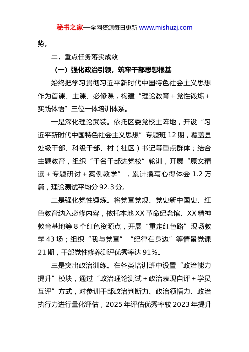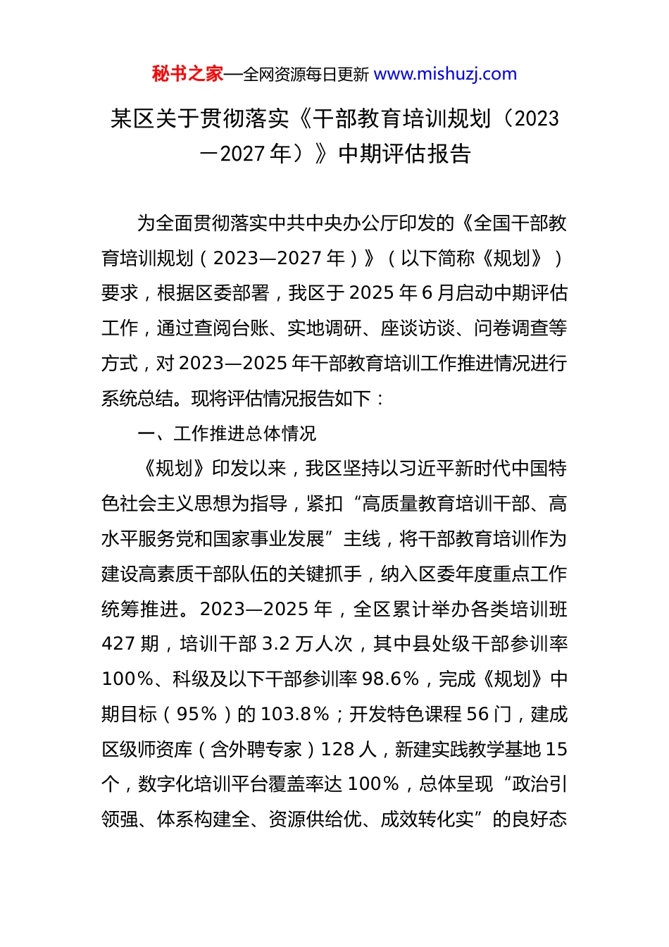 秘书之家—全网资源每日更新 www.mishuzj.com某区关于贯彻落实《干部教育培训规划(2023-2027 年)》中期评估报告 为全面贯彻落实中共中央办公厅印发的《全国干部教育培训规划(2023—2027 年)》(以下简称《规划》)要求,根据区委部署,我区于 2025 年 6 月启动中期评估工作,通过查阅台账、实地调研、座谈访谈、问卷调查等方式,对 2023—2025 年干部教育培训工作推进情况进行系统总结。现将评估情况报告如下:一、工作推进总体情况《规划》印发以来,我区坚持以习近平新时代中国特色社会主义思想为指导,紧扣“高质量教育培训干部、高水平服务党和国家事业发展”主线,将干部教育培训作为建设高素质干部队伍的关键抓手,纳入区委年度重点工作统筹推进。2023—2025 年,全区累计举办各类培训班427 期,培训干部 3.2 万人次,其中县处级干部参训率100%、科级及以下干部参训率 98.6%,完成《规划》中期目标(95%)的 103.8%;开发特色课程 56 门,建成区级师资库(含外聘专家)128 人,新建实践教学基地 15个,数字化培训平台覆盖率达 100%,总体呈现“政治引领强、体系构建全、资源供给优、成效转化实”的良好态秘书之家—全网资源每日更新 www.mishuzj.com势。二、重点任务落实成效(一)强化政治引领,筑牢干部思想根基始终把学习贯彻习近平新时代中国特色社会主义思想作为首课、主课、必修课,构建“理论教育+党性锻炼+实践体悟”三位一体培训体系。一是深化理论武装。依托区委党校主阵地,开设“习近平新时代中国特色社会主义思想”专题班 12 期,覆盖县处级干部、科级干部、村(社区)书记等重点群体;结合主题教育,组织“千名干部进党校”轮训,开展“原文精读+专题研讨+案例教学”,累计撰写心得体会 1.2 万篇,理论测试平均分 92.3 分。二是强化党性锤炼。将党章党规、党史新中国史、红色教育纳入必修内容,依托本地 XX 革命纪念馆、XX 精神教育基地等 8 个红色资源点,开展“重走红色路”现场教学 43 场;组织“我与党章”“纪律在身边”等情景党课21 期,干部党性修养测评优秀率达 91%。三是突出政治训练。在各类培训班中设置“政治能力提升”模块,通过“政治理论测试+政治表现自评+学员互评”方式,对参训干部政治判断力、政治领悟力、政治执行力进行量化评估,2025 年评估优秀率较 2023 年提升秘书之家—全网资源每日更新 www.mishuzj.com15 个百分点。(二)聚焦中心大局,提升干部专业能力坚持“干什么学什么、缺什么补什么”,围绕区委“十四五”规划重点任务,精准设计培训内容,推动干部能力与发展需求同频共振。一是服务产业升级。针对“2+3”现代产业体系(新能源、数字经济+高端装备、生物医药、现代农业),联合XX 大学、XX 研究院开设“产业链专班”,组织干部赴长三角、珠三角考察学习 17 次,推动“干部进企业”实践锻炼,促成“新能源产业政策包”“数字经济园区管理规范”等 12 项成果转化。二是强化基层治理。针对城乡融合发展中的矛盾问题,举办“基层治理能力提升”专题班 28 期,重点培训矛盾调解、网格管理、数字赋能等内容;组织“社区书记擂台赛”“乡村振兴大比武”,推动“积分制管理”“物业党建融合”等 23 项创新经验在全区推广。三是锤炼应急处突能力。聚焦防汛抗旱、安全生产、网络舆情等领域,联合应急管理局、消防大队开展“情景模拟+实战演练”培训 19 场,覆盖干部 2100 人次;建立“应急专家库”,邀请国家、省级专家开展“案例复盘+对策研讨”12 次,干部应急处置满意度从 85%提升至秘书之家—全网资源每日更新 www.mishuzj.com94%。(三)优化资源供给,夯实培训基础保障坚持问题导向,着力破解资源分散、师资薄弱、方式单一等瓶颈,构建“上下贯通、内外联动、数字赋能”的培训支撑体系。一是建强主阵地。投入 2800 万元完成区委党校扩建工程,新增教学用房 5000㎡、学员宿舍 120 间,可同时容纳300 人脱产培训;推动“党校+部门”联合办学,与区发改委、科工局等 11 个部门共建“产业发展”“科技创新”等特色教研室,开发“案例...