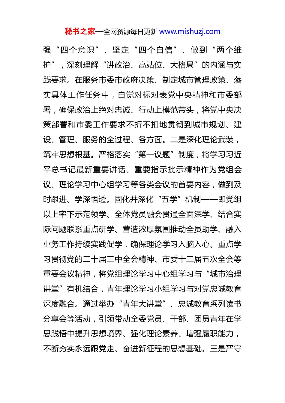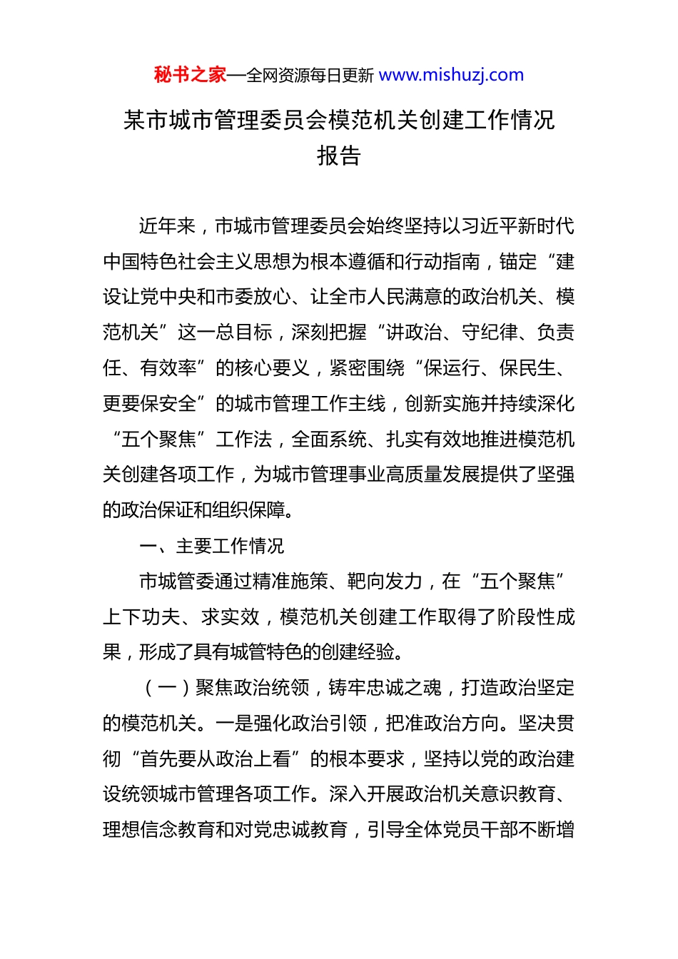 秘书之家—全网资源每日更新 www.mishuzj.com某市城市管理委员会模范机关创建工作情况报告 近年来,市城市管理委员会始终坚持以习近平新时代中国特色社会主义思想为根本遵循和行动指南,锚定“建设让党中央和市委放心、让全市人民满意的政治机关、模范机关”这一总目标,深刻把握“讲政治、守纪律、负责任、有效率”的核心要义,紧密围绕“保运行、保民生、更要保安全”的城市管理工作主线,创新实施并持续深化“五个聚焦”工作法,全面系统、扎实有效地推进模范机关创建各项工作,为城市管理事业高质量发展提供了坚强的政治保证和组织保障。一、主要工作情况市城管委通过精准施策、靶向发力,在“五个聚焦”上下功夫、求实效,模范机关创建工作取得了阶段性成果,形成了具有城管特色的创建经验。(一)聚焦政治统领,铸牢忠诚之魂,打造政治坚定的模范机关。一是强化政治引领,把准政治方向。坚决贯彻“首先要从政治上看”的根本要求,坚持以党的政治建设统领城市管理各项工作。深入开展政治机关意识教育、理想信念教育和对党忠诚教育,引导全体党员干部不断增秘书之家—全网资源每日更新 www.mishuzj.com强“四个意识”、坚定“四个自信”、做到“两个维护”,深刻理解“讲政治、高站位、大格局”的内涵与实践要求。在服务市委市政府决策、制定城市管理政策、落实具体工作任务中,自觉对标对表党中央精神和市委部署,确保政治上绝对忠诚、行动上模范带头,将党中央决策部署和市委工作要求不折不扣地贯彻到城市规划、建设、管理、服务的全过程、各方面。二是深化理论武装,筑牢思想根基。严格落实“第一议题”制度,将学习习近平总书记最新重要讲话、重要指示批示精神作为党组会议、理论学习中心组学习等各类会议的首要内容,做到及时跟进、学深悟透。固化并深化“五学”机制——即党组以上率下示范领学、全体党员融会贯通全面深学、结合实际问题联系重点研学、营造浓厚氛围推动全员助学、融入业务工作持续实践促学,确保理论学习入脑入心。重点学习贯彻党的二十届三中全会精神、市委十三届五次全会等重要会议精神,将党组理论学习中心组学习与“城市治理讲堂”有机结合,青年理论学习小组学习与对党忠诚教育深度融合。通过举办“青年大讲堂”、忠诚教育系列读书分享会等活动,引领带动全委党员、干部、团员青年在学思践悟中提升思想境界、强化理论素养、增强履职能力,不断夯实永远跟党走、奋进新征程的思想基础。三是严守秘书之家—全网资源每日更新 www.mishuzj.com政治纪律,涵养政治生态。严格执行重大事项请示报告制度,确保政令畅通、令行禁止。将习近平总书记重要讲话和指示批示作为“第一政治要件”,构建起“传达学习—研究部署—跟踪督办—落实反馈”的全流程闭环工作机制,确保每一项重要指示批示都能办实办好办到位。严格落实形势报告制度,认真执行党章和党内政治生活准则,高质量开好民主生活会和组织生活会。创新性推进开展“政治家访”活动,加强对党员干部的经常性政治体检,及时发现和纠正苗头性、倾向性问题,积极营造风清气正的党内政治文化和健康向上的政治生态。(二)聚焦强基固本,夯实组织之基,打造提升组织力的模范机关。一是规范组织建设,提升支部战斗力。将“第一议题”制度延伸深化到各党支部,坚持“周四理论学习日”机制,每月编发理论学习资料,确保理论武装直达基层“神经末梢”。常态长效抓深抓实“三会一课”、组织生活会、民主评议党员等基本制度,不断提升组织生活的政治性、时代性、原则性、战斗性。以建设政治强、组织强、能力强、作风强的“四强”党支部为目标,组织实施基层党组织建设质量提升专项行动。定期对党支部建设情况进行“过筛子”式检查评估,实行台账式管理、个性化督导,形成“布置—落实—检查—反馈—整改”的闭秘书之家—全网资源每日更新 www.mishuzj.com环工作机制,有效推动党支部标准化规范化建设水平显著提升。二是建强骨干队伍,激发干事创业活力。严把发展党员入口关,确保新发展党员质量。严格落实基层党组织换届选举程序,选优配强基层党组织书记和班子成员,把政治标准放在首位,注重选拔政治强、业务...