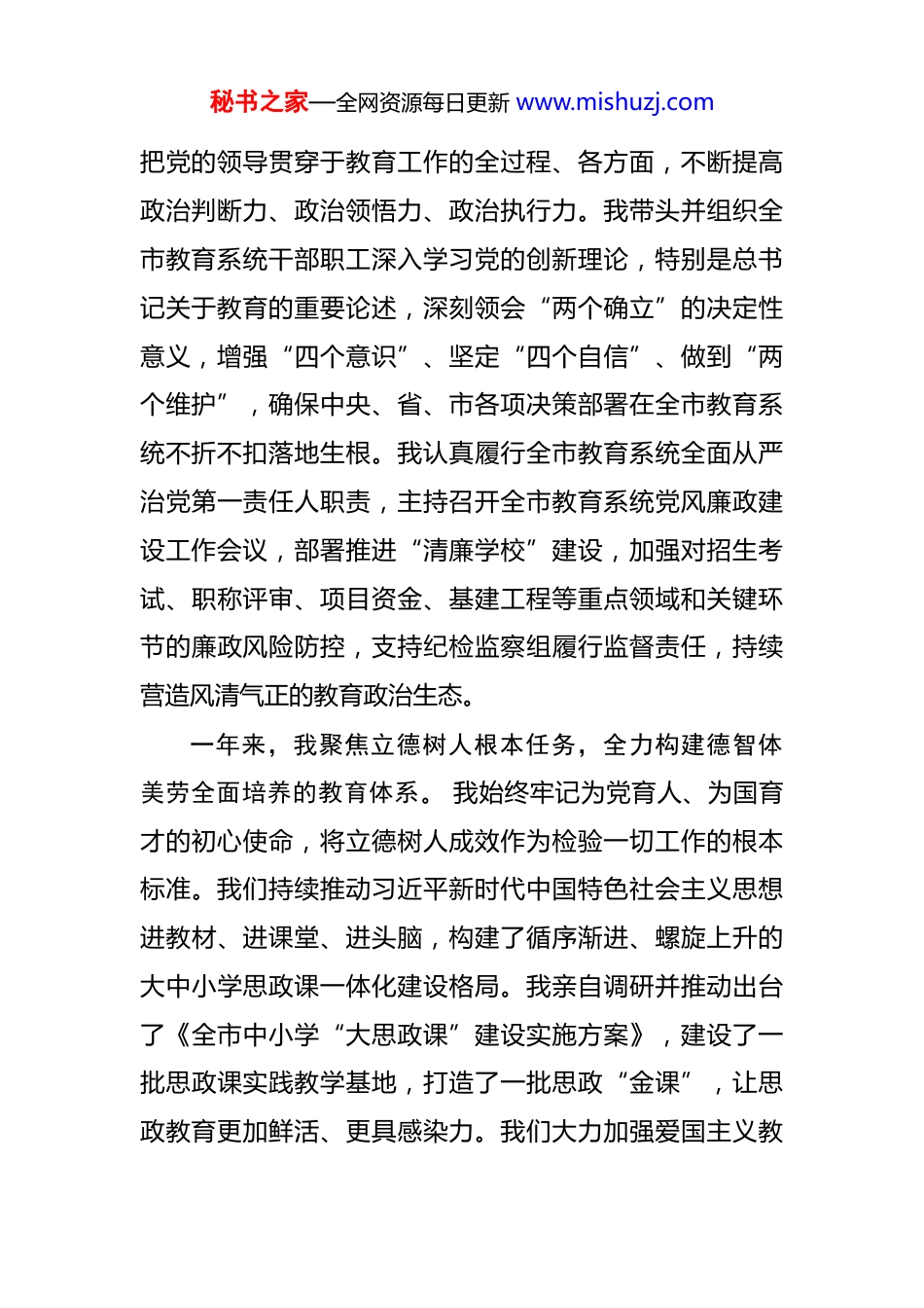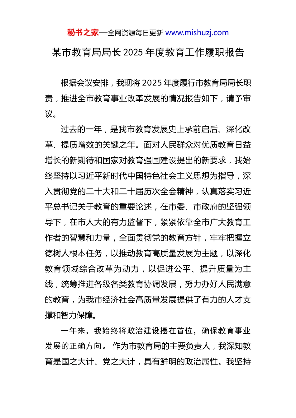 秘书之家—全网资源每日更新 www.mishuzj.com某市教育局局长 2025 年度教育工作履职报告 根据会议安排,我现将 2025 年度履行市教育局局长职责,推进全市教育事业改革发展的情况报告如下,请予审议。过去的一年,是我市教育发展史上承前启后、深化改革、提质增效的关键之年。面对人民群众对优质教育日益增长的新期待和国家对教育强国建设提出的新要求,我始终坚持以习近平新时代中国特色社会主义思想为指导,深入贯彻党的二十大和二十届历次全会精神,认真落实习近平总书记关于教育的重要论述,在市委、市政府的坚强领导下,在市人大的有力监督下,紧紧依靠全市广大教育工作者的智慧和力量,全面贯彻党的教育方针,牢牢把握立德树人根本任务,以推动教育高质量发展为主题,以深化教育领域综合改革为动力,以促进公平、提升质量为主线,统筹推进各级各类教育协调发展,努力办好人民满意的教育,为我市经济社会高质量发展提供了有力的人才支撑和智力保障。一年来,我始终将政治建设摆在首位,确保教育事业发展的正确方向。 作为市教育局的主要负责人,我深知教育是国之大计、党之大计,具有鲜明的政治属性。我坚持秘书之家—全网资源每日更新 www.mishuzj.com把党的领导贯穿于教育工作的全过程、各方面,不断提高政治判断力、政治领悟力、政治执行力。我带头并组织全市教育系统干部职工深入学习党的创新理论,特别是总书记关于教育的重要论述,深刻领会“两个确立”的决定性意义,增强“四个意识”、坚定“四个自信”、做到“两个维护”,确保中央、省、市各项决策部署在全市教育系统不折不扣落地生根。我认真履行全市教育系统全面从严治党第一责任人职责,主持召开全市教育系统党风廉政建设工作会议,部署推进“清廉学校”建设,加强对招生考试、职称评审、项目资金、基建工程等重点领域和关键环节的廉政风险防控,支持纪检监察组履行监督责任,持续营造风清气正的教育政治生态。一年来,我聚焦立德树人根本任务,全力构建德智体美劳全面培养的教育体系。 我始终牢记为党育人、为国育才的初心使命,将立德树人成效作为检验一切工作的根本标准。我们持续推动习近平新时代中国特色社会主义思想进教材、进课堂、进头脑,构建了循序渐进、螺旋上升的大中小学思政课一体化建设格局。我亲自调研并推动出台了《全市中小学“大思政课”建设实施方案》,建设了一批思政课实践教学基地,打造了一批思政“金课”,让思政教育更加鲜活、更具感染力。我们大力加强爱国主义教秘书之家—全网资源每日更新 www.mishuzj.com育、理想信念教育和社会主义核心价值观教育,深入挖掘本地红色教育资源,将其融入教育教学各环节。针对青少年身心健康,我牵头制定了《全面加强和改进新时代学校体育美育工作的若干措施》,确保开齐开足体育、美育课程,广泛开展校园普及性体育运动和艺术实践活动,学生体质健康达标率稳步提升。我们高度重视劳动教育的独特育人价值,推动建设了一批校内外劳动教育实践基地,将劳动习惯、劳动品质的养成教育融入日常学习生活。同时,我们持续强化心理健康教育,配齐配强专兼职心理健康教师,建好用好学校心理咨询室,建立健全学生心理危机预警与干预机制,为学生的健康成长保驾护航。一年来,我致力于促进教育公平,努力让每一个孩子都能享有公平而有质量的教育。 教育公平是社会公平的重要基石。我始终将促进公平作为教育政策制定的基本价值取向。我们大力推进学前教育普惠优质发展,通过新建、改扩建公办园、扶持普惠性民办园等方式,持续增加普惠性学位供给,2025 年全市普惠性幼儿园覆盖率保持在*%以上,有效缓解了“入园难、入园贵”问题。我们着力推动义务教育优质均衡发展,深入实施义务教育薄弱环节改善与能力提升项目,加大对农村学校和薄弱学校的投入力度,改善办学条件。我重点推动并深化了“学区制管理”秘书之家—全网资源每日更新 www.mishuzj.com和“集团化办学”改革,组建了*个优质教育集团,覆盖了*所成员校,通过骨干教师交流、教研科研联动、课程资源共享等方式,有效扩大了优质教育资源的覆盖面,校际差距、城乡差距进一步缩小。我们特别关注...