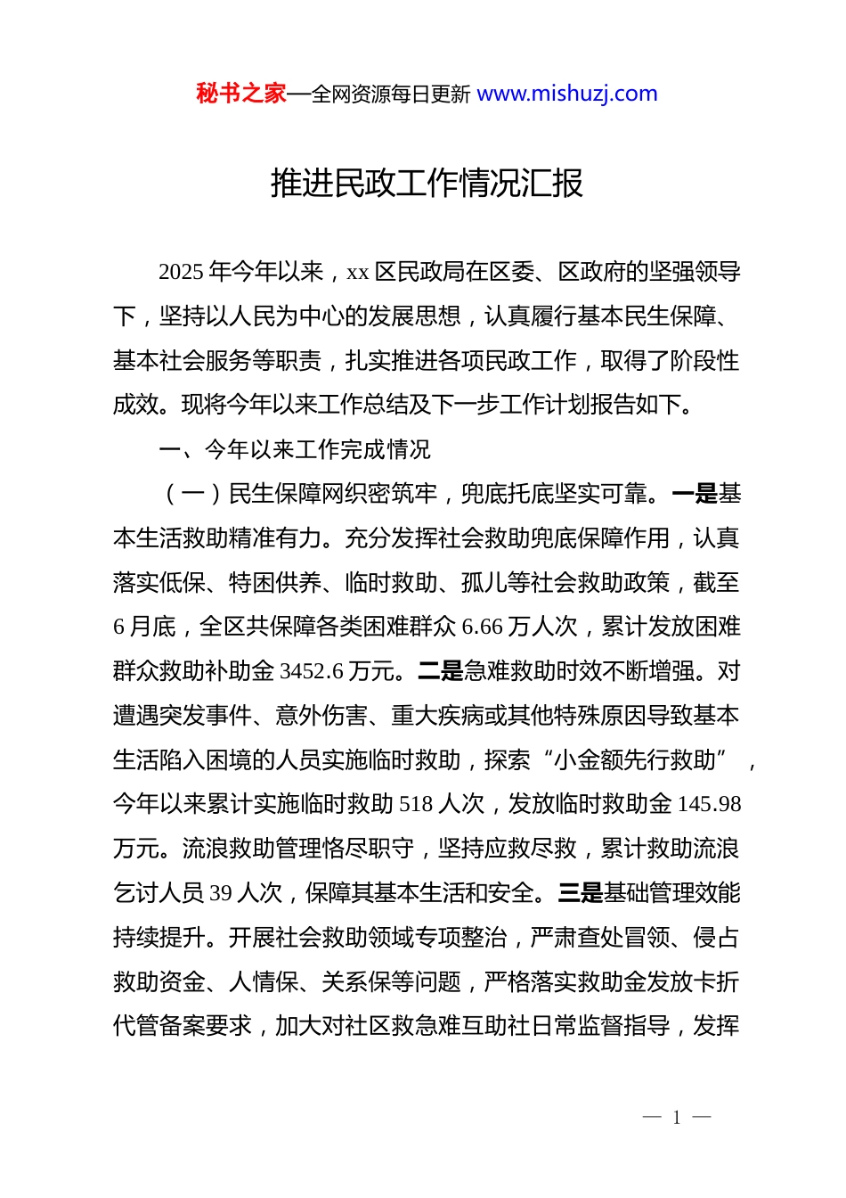 秘书之家—全网资源每日更新 www.mishuzj.com推进民政工作情况汇报2025 年今年以来,xx 区民政局在区委、区政府的坚强领导下,坚持以人民为中心的发展思想,认真履行基本民生保障、基本社会服务等职责,扎实推进各项民政工作,取得了阶段性成效。现将今年以来工作总结及下一步工作计划报告如下。一、今年以来工作完成情况(一)民生保障网织密筑牢,兜底托底坚实可靠。一是基本生活救助精准有力。充分发挥社会救助兜底保障作用,认真落实低保、特困供养、临时救助、孤儿等社会救助政策,截至6 月底,全区共保障各类困难群众 6.66 万人次,累计发放困难群众救助补助金 3452.6 万元。二是急难救助时效不断增强。对遭遇突发事件、意外伤害、重大疾病或其他特殊原因导致基本生活陷入困境的人员实施临时救助,探索“小金额先行救助”,今年以来累计实施临时救助 518 人次,发放临时救助金 145.98万元。流浪救助管理恪尽职守,坚持应救尽救,累计救助流浪乞讨人员 39 人次,保障其基本生活和安全。三是基础管理效能持续提升。开展社会救助领域专项整治,严肃查处冒领、侵占救助资金、人情保、关系保等问题,严格落实救助金发放卡折代管备案要求,加大对社区救急难互助社日常监督指导,发挥— 1 —秘书之家—全网资源每日更新 www.mishuzj.com救急难作用,合规使用互助社资金。四是分层分类救助体系不断完善。做好“政府救助+慈善救助”有效衔接,开展“2025年宝业‘两节情暖百名特困群众’捐赠”等慈善救助活动,筹集 20 万爱心资金,惠及困难群众 100 人次;申请财政资金 xx万元用于困难群众春节慰问,惠及困难群众 2487 户。全力做好服务类救助全省试点工作,争取 xx 万元财政资金指导街镇结合“两项服务”开展项目,按困难群众需求开展分类帮扶,使困难群众求助有门,有求必应。(二)养老服务供给优化升级,银龄关怀日益彰显。一是持续推进医养结合创新发展试点工作。采取“养老机构+医疗服务”、“医疗机构+养老服务”双向服务模式,以合肥市第二人民医院、合肥静安养亲春晖养护院和九久夕阳红护理院为代表,建成 5 家医养结合机构。7 家养老机构通过内设医务室或与医疗机构协议合作方式开展医养结合服务,全区养老机构与医疗机构签约率 100%。二是深化助餐服务模式创新。创新提出“区—街镇—社区—企事业单位”四级助餐体系,实现社区老年助餐全覆盖。根据老年人服务需求,今年以来新增 1 家街道社区大食堂、对 11 家老年助餐机构进行优化调整,截至目前,累计服务 1.5 万人次。三是贯通养老服务形态。居家端创新支持方式,今年以来全区开展特殊困难老年人周探访关爱服务— 2 —秘书之家—全网资源每日更新 www.mishuzj.com8000 余人次,提供家政、助餐、康复保健等服务 27.48 万余人次,积极落实高龄津贴动态管理,全区享受高龄津贴老人18893 名,截至目前发放津贴 1590.057 万元。社区端强化依托作用,截至目前,已建成 7 家“智慧+康养”综合为老服务中心、64 个社区居家养老服务站,采取“委托运营+医养结合”模式,为老人提供专业的康养服务。机构端发挥专业支撑作用,全区备案养老床位 1726 张,护理型床位占比达 76.8%。开展 25场养老护理员培训,参训人员 378 人次。四是强化养老机构安全监管。严格落实部门监管职责,全面开展养老服务机构安全隐患大排查、大整治行动,今年以来累计开展消防知识培训和应急演练活动 15 次,召开全区养老机构安全生产及防汛专题部署会议 2 次,开展各类安全生产督查检查 55 次、部门联合检查15 次、夜查 10 次,全区 12 名院长查房 181 次,坚决筑牢养老服务安全防线。(三)儿童关爱体系日益健全,护苗成长用心用情。扎实推进 xx 区孤儿事实无人抚养儿童等困境儿童和流动留守儿童关爱服务质量提升专项行动,对 7 名散居孤儿和 60 名事实无人抚养儿童,每月及时足额发放孤儿保障费,今年以来共发放106.07 万元,儿童主任按月走访了解生活教育情况。实施“阳光少年”困境儿童关爱保护项目、琥珀社区流动儿童关爱保护— 3 —秘书之家—全网资源每日更新 www.mi...