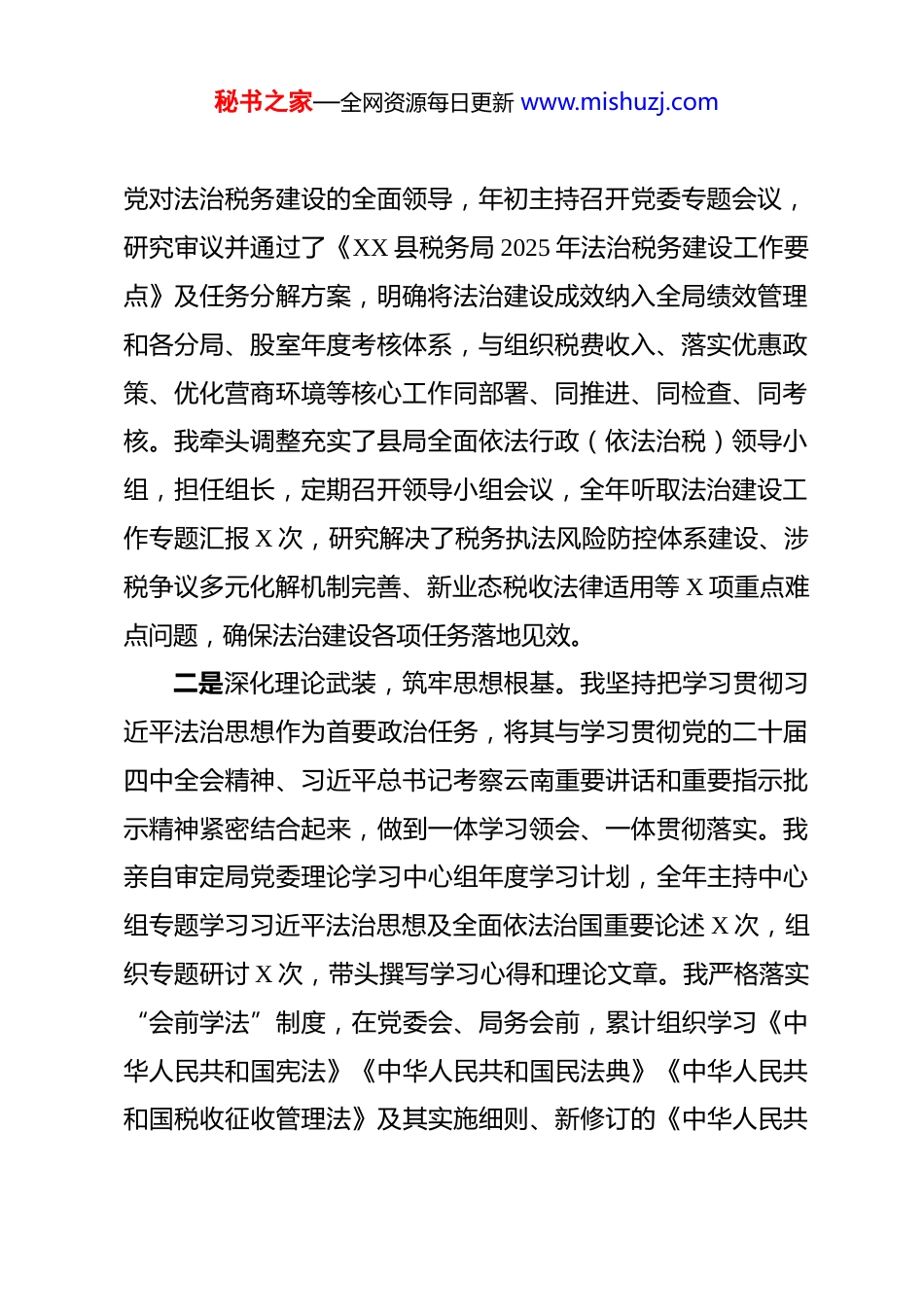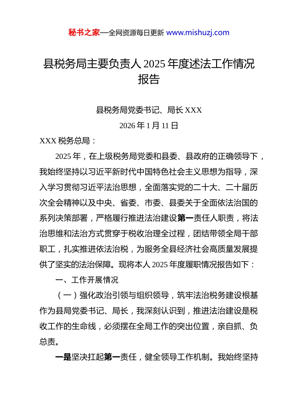 秘书之家—全网资源每日更新 www.mishuzj.com县税务局主要负责人 2025 年度述法工作情况报告县税务局党委书记、局长 XXX2026 年 1 月 11 日XXX 税务总局:2025 年,在上级税务局党委和县委、县政府的正确领导下,我始终坚持以习近平新时代中国特色社会主义思想为指导,深入学习贯彻习近平法治思想,全面落实党的二十大、二十届历次全会精神以及中央、省委、市委、县委关于全面依法治国的系列决策部署,严格履行推进法治建设第一责任人职责,将法治思维和法治方式贯穿于税收治理全过程,团结带领全局干部职工,扎实推进依法治税,为服务全县经济社会高质量发展提供了坚实的法治保障。现将本人 2025 年度履职情况报告如下:一、工作开展情况(一)强化政治引领与组织领导,筑牢法治税务建设根基作为县局党委书记、局长,我深刻认识到,推进法治建设是税收工作的生命线,必须摆在全局工作的突出位置,亲自抓、负总责。一是坚决扛起第一责任,健全领导工作机制。我始终坚持秘书之家—全网资源每日更新 www.mishuzj.com党对法治税务建设的全面领导,年初主持召开党委专题会议,研究审议并通过了《XX 县税务局 2025 年法治税务建设工作要点》及任务分解方案,明确将法治建设成效纳入全局绩效管理和各分局、股室年度考核体系,与组织税费收入、落实优惠政策、优化营商环境等核心工作同部署、同推进、同检查、同考核。我牵头调整充实了县局全面依法行政(依法治税)领导小组,担任组长,定期召开领导小组会议,全年听取法治建设工作专题汇报 X 次,研究解决了税务执法风险防控体系建设、涉税争议多元化解机制完善、新业态税收法律适用等 X 项重点难点问题,确保法治建设各项任务落地见效。二是深化理论武装,筑牢思想根基。我坚持把学习贯彻习近平法治思想作为首要政治任务,将其与学习贯彻党的二十届四中全会精神、习近平总书记考察云南重要讲话和重要指示批示精神紧密结合起来,做到一体学习领会、一体贯彻落实。我亲自审定局党委理论学习中心组年度学习计划,全年主持中心组专题学习习近平法治思想及全面依法治国重要论述 X 次,组织专题研讨 X 次,带头撰写学习心得和理论文章。我严格落实“会前学法”制度,在党委会、局务会前,累计组织学习《中华人民共和国宪法》《中华人民共和国民法典》《中华人民共和国税收征收管理法》及其实施细则、新修订的《中华人民共秘书之家—全网资源每日更新 www.mishuzj.com和国行政复议法》《中华人民共和国行政处罚法》以及各项税费法律法规和政策文件 X 次,推动领导干部先学一步、学深一层,带动全局形成尊法学法守法用法的浓厚氛围。三是自觉接受监督,规范权力运行。我始终牢记权力来自人民,必须自觉接受监督。年内,我牵头高质量办理人大代表建议 X 件、政协委员提案 X 件,实现办结率、沟通率、满意率三个 100%。我持续深化政务公开,依法及时公开税费政策、执法信息、行政许可与行政处罚结果、财政预决算等,畅通纳税人缴费人监督渠道。我坚决支持县监委、法院、检察院依法独立行使监察权、审判权、检察权,严格落实行政机关负责人出庭应诉制度,年内我局涉及的 X 起行政诉讼案件,均按规定出庭应诉并尊重法院裁判。我带头并严格要求领导班子其他成员及各部门负责人,不得以任何形式干预司法活动、插手具体案件处理,确保税收执法司法活动公正独立。(二)健全决策机制与规范执法行为,提升依法行政能力水平。我坚持将依法决策、规范执法作为推进法治税务建设的核心环节,着力构建权责明晰、程序严密、运行规范的权力运行机制。一是严格依法依规决策。我带头严格执行民主集中制和党委工作规则,凡属“三重一大”事项,均提交党委会议集体讨秘书之家—全网资源每日更新 www.mishuzj.com论决定,全年共主持召开党委会 X 次,研究重大决策事项 X 项,均形成规范纪要并督促落实。我大力推动健全并严格落实合法性审查制度,明确要求所有重大行政决策、对外签订的重要合同协议、制发的规范性文件,必须经过法制部门或法律顾问的合法性审查。年内,我局配备专职法制审核人员 X 名,聘请专业律师事务所担...