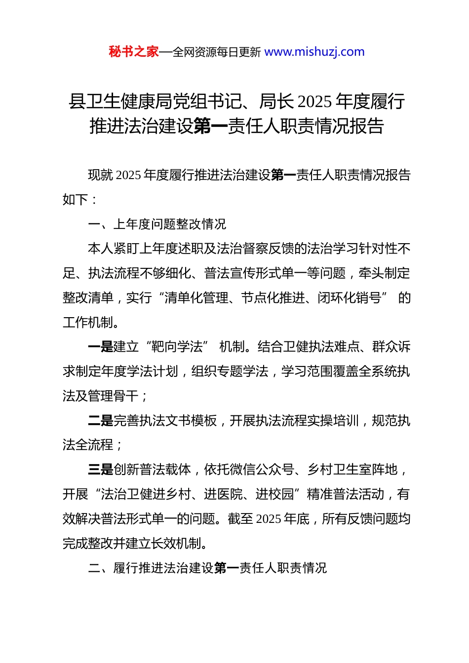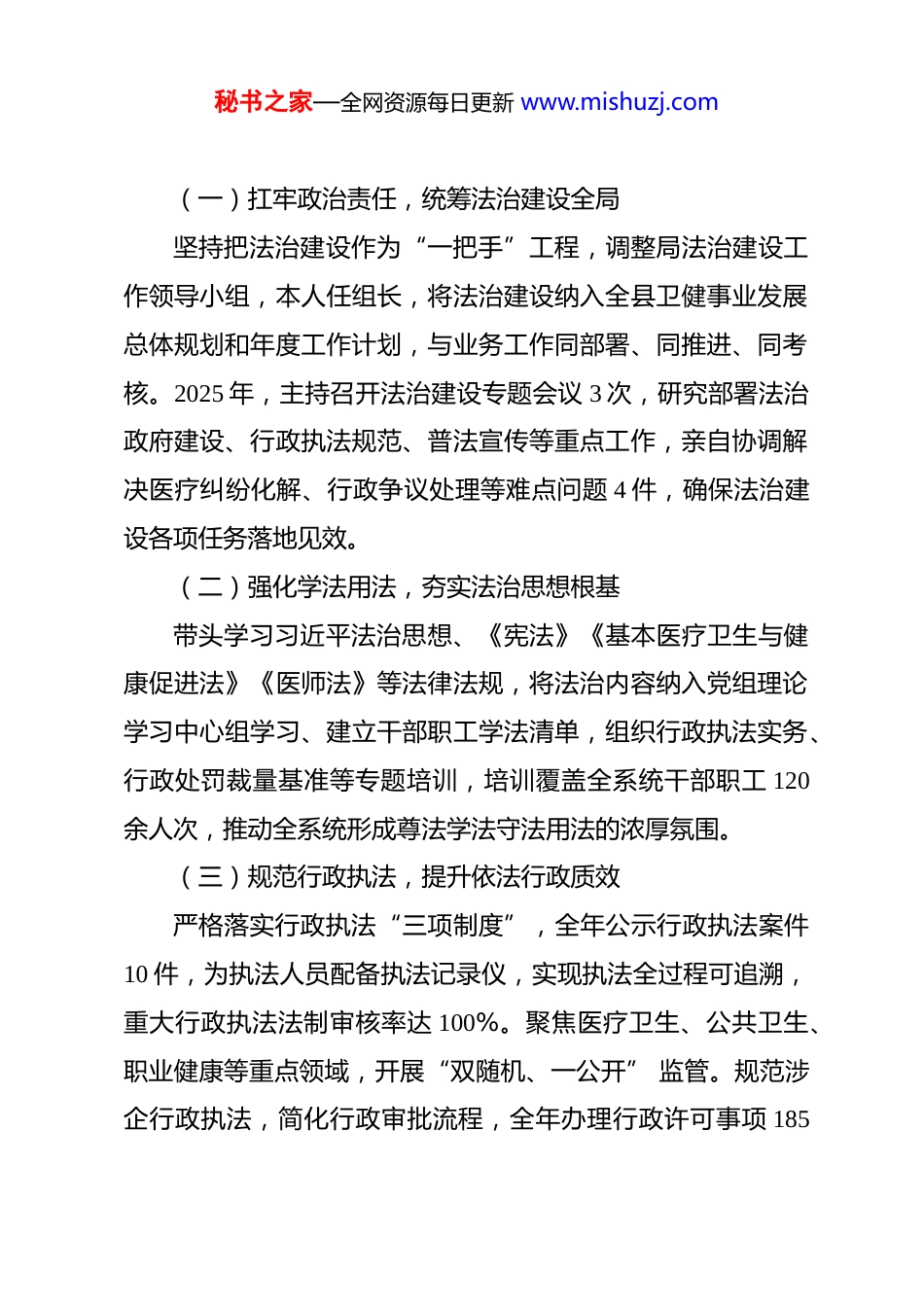 秘书之家—全网资源每日更新 www.mishuzj.com县卫生健康局党组书记、局长 2025 年度履行推进法治建设第一责任人职责情况报告现就 2025 年度履行推进法治建设第一责任人职责情况报告如下:一、上年度问题整改情况本人紧盯上年度述职及法治督察反馈的法治学习针对性不足、执法流程不够细化、普法宣传形式单一等问题,牵头制定整改清单,实行“清单化管理、节点化推进、闭环化销号” 的工作机制。一是建立“靶向学法” 机制。结合卫健执法难点、群众诉求制定年度学法计划,组织专题学法,学习范围覆盖全系统执法及管理骨干;二是完善执法文书模板,开展执法流程实操培训,规范执法全流程;三是创新普法载体,依托微信公众号、乡村卫生室阵地,开展“法治卫健进乡村、进医院、进校园”精准普法活动,有效解决普法形式单一的问题。截至 2025 年底,所有反馈问题均完成整改并建立长效机制。二、履行推进法治建设第一责任人职责情况秘书之家—全网资源每日更新 www.mishuzj.com(一)扛牢政治责任,统筹法治建设全局坚持把法治建设作为“一把手”工程,调整局法治建设工作领导小组,本人任组长,将法治建设纳入全县卫健事业发展总体规划和年度工作计划,与业务工作同部署、同推进、同考核。2025 年,主持召开法治建设专题会议 3 次,研究部署法治政府建设、行政执法规范、普法宣传等重点工作,亲自协调解决医疗纠纷化解、行政争议处理等难点问题 4 件,确保法治建设各项任务落地见效。(二)强化学法用法,夯实法治思想根基带头学习习近平法治思想、《宪法》《基本医疗卫生与健康促进法》《医师法》等法律法规,将法治内容纳入党组理论学习中心组学习、建立干部职工学法清单,组织行政执法实务、行政处罚裁量基准等专题培训,培训覆盖全系统干部职工 120余人次,推动全系统形成尊法学法守法用法的浓厚氛围。(三)规范行政执法,提升依法行政质效严格落实行政执法“三项制度”,全年公示行政执法案件10 件,为执法人员配备执法记录仪,实现执法全过程可追溯,重大行政执法法制审核率达 100%。聚焦医疗卫生、公共卫生、职业健康等重点领域,开展“双随机、一公开” 监管。规范涉企行政执法,简化行政审批流程,全年办理行政许可事项 185秘书之家—全网资源每日更新 www.mishuzj.com件,按时办结率 100%。(四)化解矛盾纠纷,维护社会和谐稳定践行新时代“枫桥经验”,健全医疗纠纷人民调解机制,加强与县综治中心、司法部门协作,全年化解医疗纠纷 18 起,行政争议实质性化解率达 96%。畅通 12320 卫生热线、12345政务服务便民热线等求助投诉渠道,全年办理群众诉求 169 件,办结率 100%,切实维护了群众合法权益。三、存在的问题(一)法治学习深度仍有不足部分干部职工对卫生健康法律法规学习不够系统,运用法治思维和法治方式解决复杂医患矛盾、应对突发公共卫生事件的能力有待提升,存在重业务、轻法治的倾向。(二)执法规范化水平有待提高少数执法人员执法程序不够严谨,执法文书制作不够规范执法监督的精细化程度不足,对基层卫生监督员的指导不足。(三)普法宣传实效性有待增强新媒体普法的创新性、吸引力不足,针对老年人、青少年等重点群体的精准普法力度有待加强。四、下一步工作打算(一)强化理论武装,提升法治素养秘书之家—全网资源每日更新 www.mishuzj.com持续深入学习习近平法治思想,完善会前学法、专题学法制度,加大干部职工法治培训培训力度,推动法治学习常态化、制度化,切实提升全系统依法履职能力。(二)规范执法行为,提升执法质效严格落实行政执法“三项制度”,加强执法全过程监督,规范执法流程和文书制作,加大重点领域执法力度,严厉打击违法违规行为,维护医疗服务市场秩序。(三)创新普法形式,增强宣传实效依托短视频、直播等新媒体平台,开展形式多样的法治宣传活动,针对不同群体开展精准普法,提升普法针对性和实效性,营造全社会关心支持卫生健康法治建设的良好氛围。(四)健全工作机制,压实工作责任进一步完善法治建设考核评价体系,强化督查督导,压实各级责任,推动法治建设与卫生健康业务工作深度融合,为西和县卫生健康事业高质量发展提供坚实法治保障。