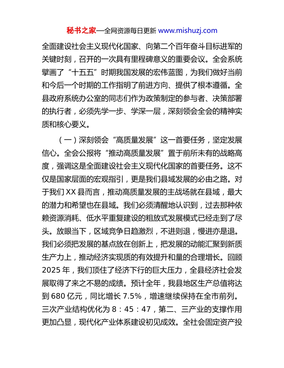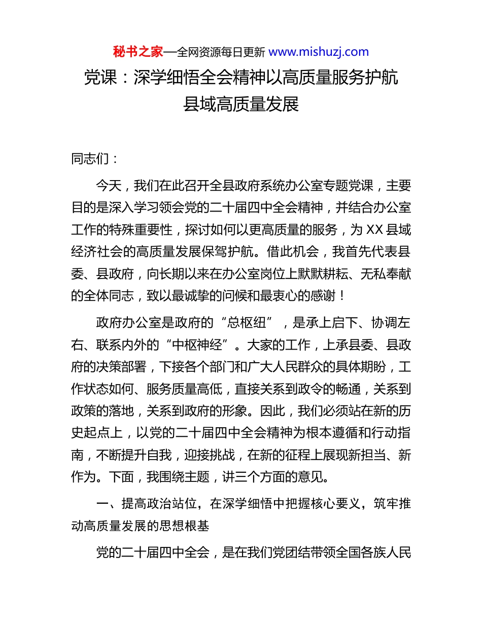 秘书之家—全网资源每日更新 www.mishuzj.com党课:深学细悟全会精神以高质量服务护航县域高质量发展同志们:今天,我们在此召开全县政府系统办公室专题党课,主要目的是深入学习领会党的二十届四中全会精神,并结合办公室工作的特殊重要性,探讨如何以更高质量的服务,为 XX 县域经济社会的高质量发展保驾护航。借此机会,我首先代表县委、县政府,向长期以来在办公室岗位上默默耕耘、无私奉献的全体同志,致以最诚挚的问候和最衷心的感谢!政府办公室是政府的“总枢纽”,是承上启下、协调左右、联系内外的“中枢神经”。大家的工作,上承县委、县政府的决策部署,下接各个部门和广大人民群众的具体期盼,工作状态如何、服务质量高低,直接关系到政令的畅通,关系到政策的落地,关系到政府的形象。因此,我们必须站在新的历史起点上,以党的二十届四中全会精神为根本遵循和行动指南,不断提升自我,迎接挑战,在新的征程上展现新担当、新作为。下面,我围绕主题,讲三个方面的意见。一、提高政治站位,在深学细悟中把握核心要义,筑牢推动高质量发展的思想根基党的二十届四中全会,是在我们党团结带领全国各族人民秘书之家—全网资源每日更新 www.mishuzj.com全面建设社会主义现代化国家、向第二个百年奋斗目标进军的关键时刻,召开的一次具有里程碑意义的重要会议。全会系统擘画了“十五五”时期我国发展的宏伟蓝图,为我们做好当前和今后一个时期的工作指明了前进方向、提供了根本遵循。全县政府系统办公室的同志们作为政策制定的参与者、决策部署的执行者,必须先学一步、学深一层,深刻领会全会的精神实质和核心要义。(一)深刻领会“高质量发展”这一首要任务,坚定发展信心。全会公报将“推动高质量发展”置于前所未有的战略高度,强调这是全面建设社会主义现代化国家的首要任务。这不仅是国家层面的宏观指引,更是我们县域发展的必由之路。对于我们 XX 县而言,推动高质量发展的主战场就在县域,最大的潜力和希望也在县域。我们必须清醒地认识到,过去那种依赖资源消耗、低水平重复建设的粗放式发展模式已经走到了尽头。放眼当下,区域竞争日趋激烈,不进则退,慢进亦是退。我们必须把发展的基点放在创新上,把发展的动能汇聚到新质生产力上,推动经济实现质的有效提升和量的合理增长。回顾2025 年,我们顶住了经济下行的巨大压力,全县经济社会发展取得了来之不易的成绩。预计全年,我县地区生产总值将达到 680 亿元,同比增长 7.5%,增速继续保持在全市前列。三次产业结构优化为 8:45:47,第二、三产业的支撑作用更加凸显,现代化产业体系建设初见成效。全社会固定资产投秘书之家—全网资源每日更新 www.mishuzj.com资完成 450 亿元,一批关乎长远发展的重大项目,如 XX 新能源电池材料一体化项目、XX 智能制造产业园等,正在加速推进。城镇新增就业超过 9000 人,城乡居民人均可支配收入稳步增长。这些成绩,是全县上下共同奋斗的结果,也为我们迈向更高质量的发展阶段奠定了坚实基础。但我们更要看到,发展不平衡不充分的问题依然存在,传统产业转型升级任务艰巨,科技创新能力仍需加强,民生领域还有不少短板。因此,我们必须将全会精神转化为推动 XX 发展的强大动力,聚焦产业升级、乡村振兴、生态环保、民生改善等关键领域,拿出实招硬招,奋力谱写 XX 县高质量发展的新篇章。(二)深刻领会“改革创新”这一根本动力,勇于攻坚克难。全会强调,要坚定不移深化改革扩大开放,为高质量发展注入强大动力。发展出题目,改革做文章。当前,我们面临的许多发展难题,深层次原因在于体制机制的障碍。办公室作为政府的参谋助手,必须具备强烈的改革意识和创新精神。我们要敢于直面发展中的堵点、痛点、难点问题,围绕优化营商环境、深化“放管服”改革、盘活要素资源等方面,深入调研,大胆建言,为县委、县政府科学决策提供有价值的参考。要破除思维定势,不能总是用老眼光看待新问题,用老办法应对新挑战。要善于学习借鉴先进地区的成功经验,但绝不能照搬照抄,必须结合 XX 县的实际,创造性地开展工作,推动各项改革举措精准落地,真正把...