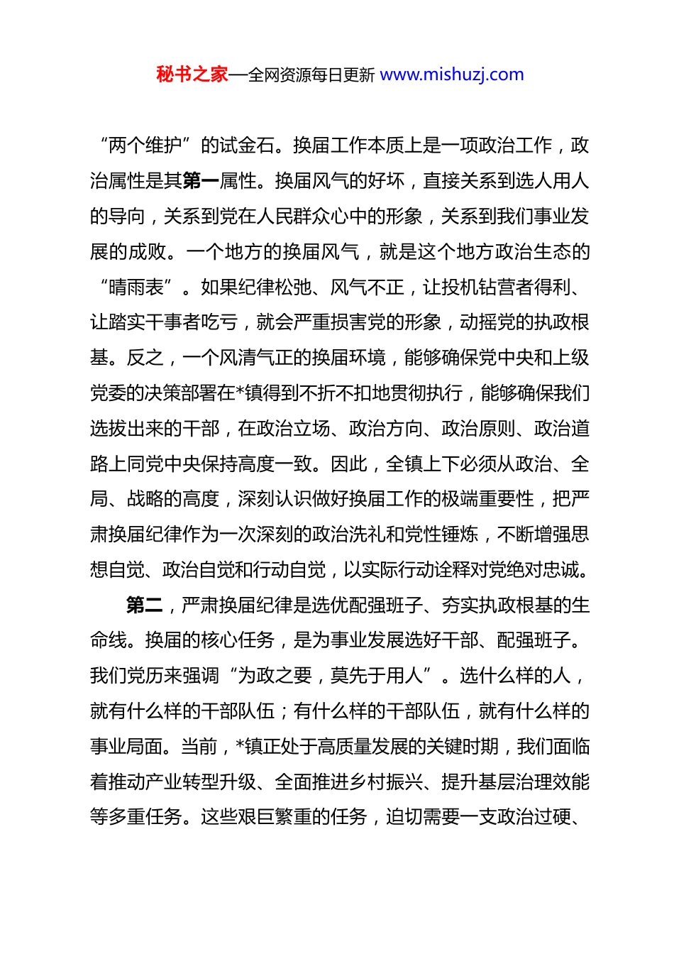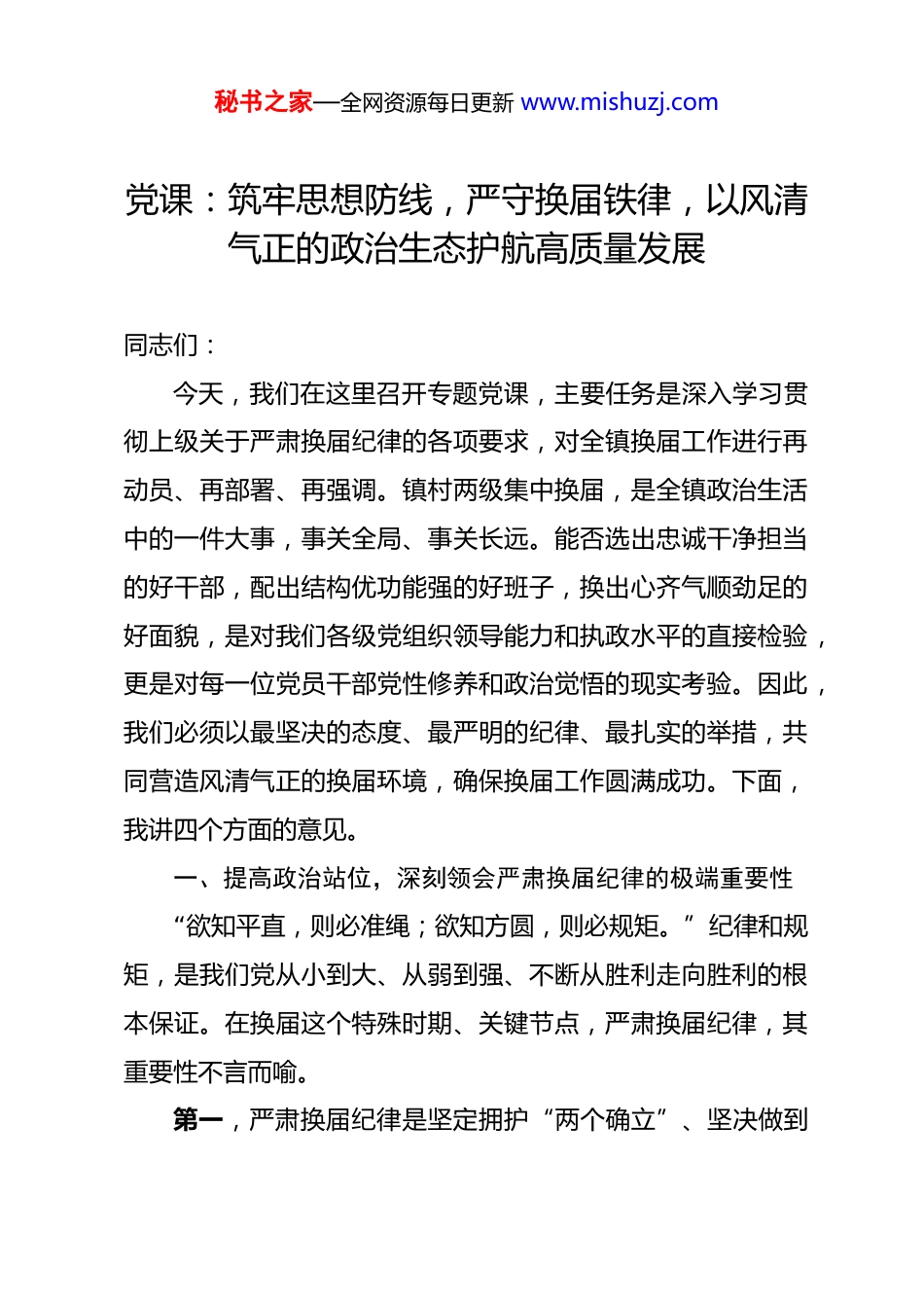 秘书之家—全网资源每日更新 www.mishuzj.com党课:筑牢思想防线,严守换届铁律,以风清气正的政治生态护航高质量发展 同志们:今天,我们在这里召开专题党课,主要任务是深入学习贯彻上级关于严肃换届纪律的各项要求,对全镇换届工作进行再动员、再部署、再强调。镇村两级集中换届,是全镇政治生活中的一件大事,事关全局、事关长远。能否选出忠诚干净担当的好干部,配出结构优功能强的好班子,换出心齐气顺劲足的好面貌,是对我们各级党组织领导能力和执政水平的直接检验,更是对每一位党员干部党性修养和政治觉悟的现实考验。因此,我们必须以最坚决的态度、最严明的纪律、最扎实的举措,共同营造风清气正的换届环境,确保换届工作圆满成功。下面,我讲四个方面的意见。一、提高政治站位,深刻领会严肃换届纪律的极端重要性“欲知平直,则必准绳;欲知方圆,则必规矩。”纪律和规矩,是我们党从小到大、从弱到强、不断从胜利走向胜利的根本保证。在换届这个特殊时期、关键节点,严肃换届纪律,其重要性不言而喻。第一,严肃换届纪律是坚定拥护“两个确立”、坚决做到秘书之家—全网资源每日更新 www.mishuzj.com“两个维护”的试金石。换届工作本质上是一项政治工作,政治属性是其第一属性。换届风气的好坏,直接关系到选人用人的导向,关系到党在人民群众心中的形象,关系到我们事业发展的成败。一个地方的换届风气,就是这个地方政治生态的“晴雨表”。如果纪律松弛、风气不正,让投机钻营者得利、让踏实干事者吃亏,就会严重损害党的形象,动摇党的执政根基。反之,一个风清气正的换届环境,能够确保党中央和上级党委的决策部署在*镇得到不折不扣地贯彻执行,能够确保我们选拔出来的干部,在政治立场、政治方向、政治原则、政治道路上同党中央保持高度一致。因此,全镇上下必须从政治、全局、战略的高度,深刻认识做好换届工作的极端重要性,把严肃换届纪律作为一次深刻的政治洗礼和党性锤炼,不断增强思想自觉、政治自觉和行动自觉,以实际行动诠释对党绝对忠诚。第二,严肃换届纪律是选优配强班子、夯实执政根基的生命线。换届的核心任务,是为事业发展选好干部、配强班子。我们党历来强调“为政之要,莫先于用人”。选什么样的人,就有什么样的干部队伍;有什么样的干部队伍,就有什么样的事业局面。当前,*镇正处于高质量发展的关键时期,我们面临着推动产业转型升级、全面推进乡村振兴、提升基层治理效能等多重任务。这些艰巨繁重的任务,迫切需要一支政治过硬、秘书之家—全网资源每日更新 www.mishuzj.com本领高强、作风优良的干部队伍来引领、来推动。严肃换届纪律,就是要树立起“有为者有位、能干者能上、优秀者优先”的鲜明导向,坚决防止和纠正选人用人上的不正之风,把那些真正想干事、能干事、干成事、不出事的优秀干部选拔到关键岗位上来。只有把纪律的“紧箍咒”念得更响,把制度的“笼子”扎得更紧,才能真正挡住歪风邪气,让德才兼备的干部脱颖而出,为我们“十五五”规划开好局、起好步提供坚强的组织保障。第三,严肃换届纪律是从严管党治党、净化政治生态的净化器。党的十八大以来,以习近平同志为核心的党中央以前所未有的决心和力度推进全面从严治党,政治生态为之一新,党心民心为之一振。换届是检验全面从严治党成果的重要契机,也是持续净化政治生态的关键环节。我们必须清醒地认识到,选人用人领域的腐败是最大的腐败,对政治生态的破坏力最强。一个干部“带病提拔”,就可能带坏一个单位的风气;一个地方换届风气不正,就可能污染整个区域的政治生态。因此,我们必须坚持“严”的主基调不动摇,以最坚决的态度同换届中的各种违纪违法行为作斗争。前段时间,我们镇党委组织各村(社区)党支部书记赴*红色教育基地开展了一次沉浸式党性教育,重温入党誓词,就是要提醒大家不忘初心、牢记使命,始秘书之家—全网资源每日更新 www.mishuzj.com终保持共产党人的政治本色。我们必须把这次换届作为纵深推进全面从严治党、一体推进“三不腐”的重要实践,通过严明纪律、严格监督、严肃查处,让纪律真正成为带电的“高压线”,让干部心有所畏、言有...