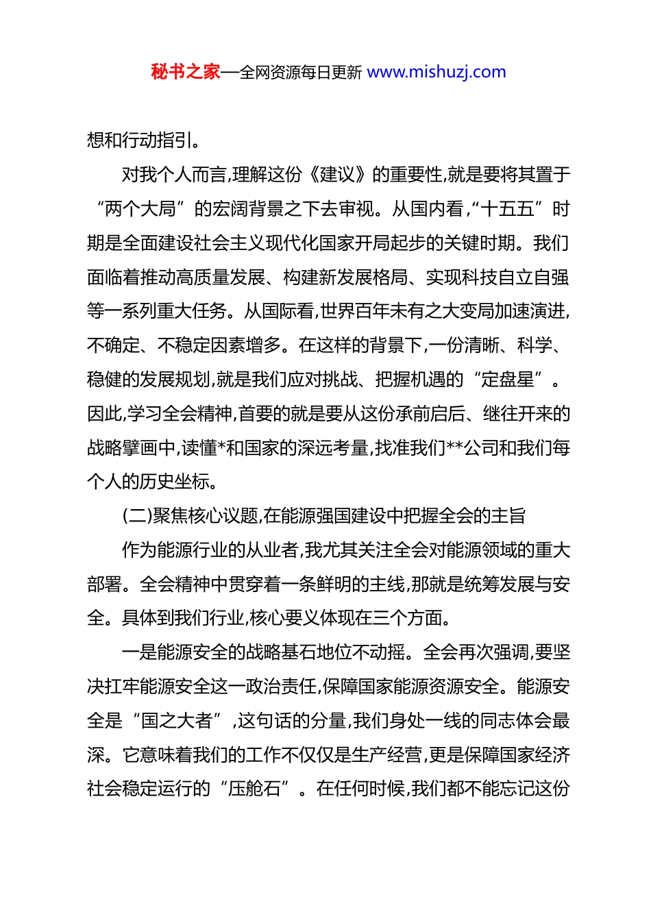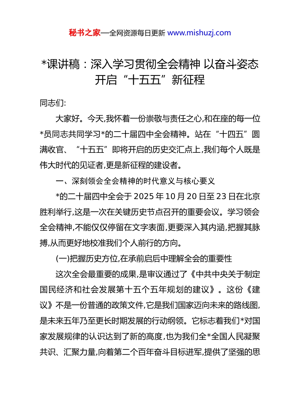 秘书之家—全网资源每日更新 www.mishuzj.com*课讲稿:深入学习贯彻全会精神 以奋斗姿态开启“十五五”新征程同志们:大家好。今天,我怀着一份崇敬与责任之心,和在座的每一位*员同志共同学习*的二十届四中全会精神。站在“十四五”圆满收官、“十五五”即将开启的历史交汇点上,我们每个人既是伟大时代的见证者,更是新征程的建设者。一、深刻领会全会精神的时代意义与核心要义*的二十届四中全会于 2025 年 10 月 20 日至 23 日在北京胜利举行,这是一次在关键历史节点召开的重要会议。学习领会全会精神,不能仅仅停留在文字表面,更要深入其内涵,把握其脉搏,从而更好地校准我们个人前行的方向。(一)把握历史方位,在承前启后中理解全会的重要性这次全会最重要的成果,是审议通过了《中共中央关于制定国民经济和社会发展第十五个五年规划的建议》。这份《建议》不是一份普通的政策文件,它是我们国家迈向未来的路线图,是未来五年乃至更长时期发展的行动纲领。它标志着我们*对国家发展规律的认识达到了新的高度,也为我们全*全国人民凝聚共识、汇聚力量,向着第二个百年奋斗目标进军,提供了坚强的思秘书之家—全网资源每日更新 www.mishuzj.com想和行动指引。对我个人而言,理解这份《建议》的重要性,就是要将其置于“两个大局”的宏阔背景之下去审视。从国内看,“十五五”时期是全面建设社会主义现代化国家开局起步的关键时期。我们面临着推动高质量发展、构建新发展格局、实现科技自立自强等一系列重大任务。从国际看,世界百年未有之大变局加速演进,不确定、不稳定因素增多。在这样的背景下,一份清晰、科学、稳健的发展规划,就是我们应对挑战、把握机遇的“定盘星”。因此,学习全会精神,首要的就是要从这份承前启后、继往开来的战略擘画中,读懂*和国家的深远考量,找准我们**公司和我们每个人的历史坐标。(二)聚焦核心议题,在能源强国建设中把握全会的主旨作为能源行业的从业者,我尤其关注全会对能源领域的重大部署。全会精神中贯穿着一条鲜明的主线,那就是统筹发展与安全。具体到我们行业,核心要义体现在三个方面。一是能源安全的战略基石地位不动摇。全会再次强调,要坚决扛牢能源安全这一政治责任,保障国家能源资源安全。能源安全是“国之大者”,这句话的分量,我们身处一线的同志体会最深。它意味着我们的工作不仅仅是生产经营,更是保障国家经济社会稳定运行的“压舱石”。在任何时候,我们都不能忘记这份秘书之家—全网资源每日更新 www.mishuzj.com沉甸甸的责任,必须将保障能源稳定供应作为一切工作的出发点和落脚点。二是绿色低碳转型的战略方向不动摇。全会明确指出,要加快经济社会发展全面绿色转型,建设美丽中国。这要求我们必须以更大的决心和力度,推动能源革命向纵深发展。这并非是要否定传统能源的价值,而是要用新的理念、新的技术去改造和提升传统能源,使其更清洁、更高效。同时,要大力发展非化石能源,加快建设一个清洁低碳、安全高效的新型能源体系。这种转型,对我们而言是挑战,更是前所未有的发展机遇。三是科技创新驱动的战略引擎不动摇。全会强调,要强化能源领域科技创新引领,提升能源科技创新的“硬实力”。在能源行业,核心技术的突破往往能带来颠覆性的变革。无论是传统能源的安全高效开采,还是新能源的规模化应用,都离不开强大的科技支撑。这就要求我们必须把创新摆在发展的核心位置,敢于向最前沿的技术领域进军,勇于攻克制约行业发展的“卡脖子”难题。二、回望“十四五”奋斗路,在坚实成就中汲取前行力量2025 年即将结束,“十四五”规划也即将画上圆满的句号。回首这五年,我与在座的许多同志一样,都是亲历者、参与者和奉献者。我们不是在讲述宏大的国家叙事,而是在分享我们共同经秘书之家—全网资源每日更新 www.mishuzj.com历的岁月和为之付出的努力。这些成就不是冰冷的数据,而是我们一步一个脚印走出来的坚实足迹,是我们展望“十五五”、开启新征程的底气和信心所在。(一)我亲历了能源结构的深刻变革这五年,我最直观的感受是身边的“绿色”越来越多了。国家大力推动可再生能源发展,其装机容量和发电量持续攀升。国家规划到 2030 年前,风电和太阳能发电装...