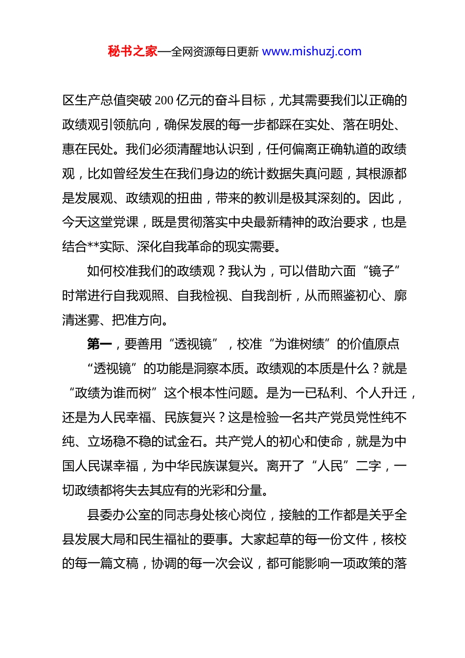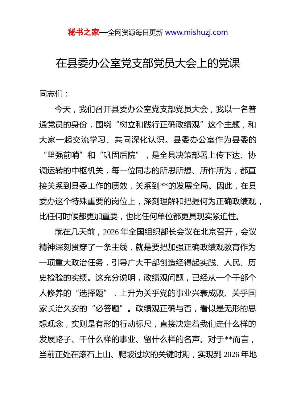 秘书之家—全网资源每日更新 www.mishuzj.com在县委办公室党支部党员大会上的党课 同志们:今天,我们召开县委办公室党支部党员大会,我以一名普通党员的身份,围绕“树立和践行正确政绩观”这个主题,和大家一起交流学习、共同深化认识。县委办公室作为县委的“坚强前哨”和“巩固后院”,是全县决策部署上传下达、协调运转的中枢机关,每一位同志的所思所想、所作所为,都直接关系到县委工作的质效,关系到**的发展全局。因此,在县委办这个特殊重要的岗位上,深刻理解和把握何为正确政绩观,比任何时候都更加重要,也比任何单位都更具现实紧迫性。就在几天前,2026 年全国组织部长会议在北京召开,会议精神深刻贯穿了一条主线,就是要把加强正确政绩观教育作为一项重大政治任务,引导广大干部创造经得起实践、人民、历史检验的实绩。这充分说明,政绩观问题,已经从一个干部个人修养的“选择题”,上升为关乎党的事业兴衰成败、关乎国家长治久安的“必答题”。政绩观正确与否,看似是无形的思想观念,实则是有形的行动标尺,直接决定着我们走什么样的发展路子、干什么样的事业、留什么样的名声。对于**而言,当前正处在滚石上山、爬坡过坎的关键时期,实现到 2026 年地秘书之家—全网资源每日更新 www.mishuzj.com区生产总值突破 200 亿元的奋斗目标,尤其需要我们以正确的政绩观引领航向,确保发展的每一步都踩在实处、落在明处、惠在民处。我们必须清醒地认识到,任何偏离正确轨道的政绩观,比如曾经发生在我们身边的统计数据失真问题,其根源都是发展观、政绩观的扭曲,带来的教训是极其深刻的。因此,今天这堂党课,既是贯彻落实中央最新精神的政治要求,也是结合**实际、深化自我革命的现实需要。如何校准我们的政绩观?我认为,可以借助六面“镜子”时常进行自我观照、自我检视、自我剖析,从而照鉴初心、廓清迷雾、把准方向。第一,要善用“透视镜”,校准“为谁树绩”的价值原点“透视镜”的功能是洞察本质。政绩观的本质是什么?就是“政绩为谁而树”这个根本性问题。是为一已私利、个人升迁,还是为人民幸福、民族复兴?这是检验一名共产党员党性纯不纯、立场稳不稳的试金石。共产党人的初心和使命,就是为中国人民谋幸福,为中华民族谋复兴。离开了“人民”二字,一切政绩都将失去其应有的光彩和分量。县委办公室的同志身处核心岗位,接触的工作都是关乎全县发展大局和民生福祉的要事。大家起草的每一份文件,核校的每一篇文稿,协调的每一次会议,都可能影响一项政策的落秘书之家—全网资源每日更新 www.mishuzj.com地、一个项目的推进、一个群体的利益。在这个过程中,必须时刻用“透视镜”审视自己的内心,看看我们的出发点和落脚点,究竟是放在了“让领导满意”还是“让群众满意”上,是放在了“材料漂亮”还是“事情办好”上,是放在了“个人前途”还是“**前途”上。真正的政绩,从来不是写在纸上、挂在墙上、说在嘴上的,而是镌刻在群众的心坎里,体现在群众的笑脸上。过去几年,我们打赢了脱贫攻坚战,历史性地解决了绝对贫困问题,这不是哪一个人的功劳,而是全县上下始终坚持人民至上、践行初心使命的结果。再比如,我们持续推进农村饮水安全巩固提升工程,截至 2025 年底,全县农村自来水普及率达到了 98.35%,这背后是无数干部群众的辛勤付出,是把群众“盼的事”当成我们“干的事”的生动体现。这些看得见、摸得着的民生实事,才是我们最可宝贵、最值得骄傲的政绩。第二,要善用“望远镜”,锚定“着眼长远”的战略维度。“望远镜”的功能是看得远。一个地方的发展,如同一次长跑,既要有百米冲刺的速度,更要有马拉松的耐力。正确的政绩观,必然是立足当前、着眼长远,既抓“显绩”,更重“潜绩”。所谓“显绩”,是短期内能看到成果、容易出彩的工作;所谓“潜绩”,则是打基础、利长远、惠及后人的事业,短期秘书之家—全网资源每日更新 www.mishuzj.com内可能不显山不露水,甚至需要“前人栽树、后人乘凉”。现实中,一些干部急功近利,热衷于搞“短平快”的项目追求立竿见影的效果,对那些周期长、见效慢的基础性工作则缺乏热情和耐...