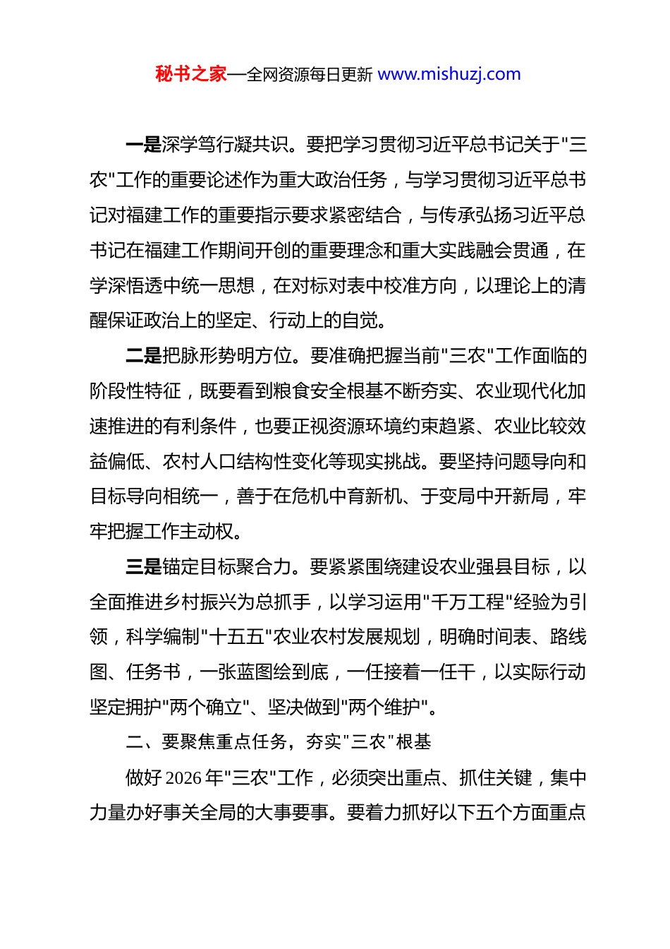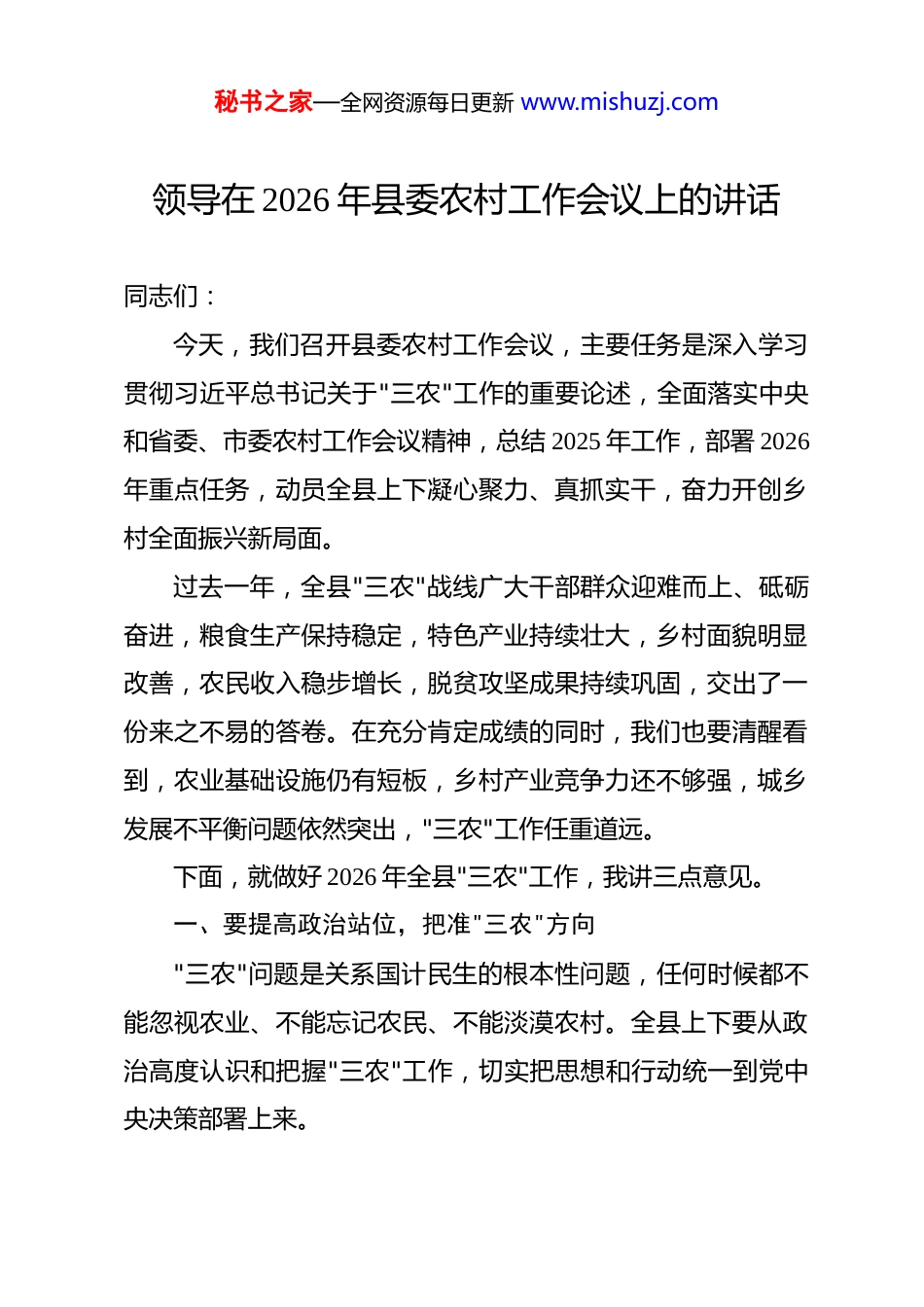 秘书之家—全网资源每日更新 www.mishuzj.com领导在 2026 年县委农村工作会议上的讲话 同志们:今天,我们召开县委农村工作会议,主要任务是深入学习贯彻习近平总书记关于"三农"工作的重要论述,全面落实中央和省委、市委农村工作会议精神,总结 2025 年工作,部署 2026年重点任务,动员全县上下凝心聚力、真抓实干,奋力开创乡村全面振兴新局面。过去一年,全县"三农"战线广大干部群众迎难而上、砥砺奋进,粮食生产保持稳定,特色产业持续壮大,乡村面貌明显改善,农民收入稳步增长,脱贫攻坚成果持续巩固,交出了一份来之不易的答卷。在充分肯定成绩的同时,我们也要清醒看到,农业基础设施仍有短板,乡村产业竞争力还不够强,城乡发展不平衡问题依然突出,"三农"工作任重道远。下面,就做好 2026 年全县"三农"工作,我讲三点意见。一、要提高政治站位,把准"三农"方向"三农"问题是关系国计民生的根本性问题,任何时候都不能忽视农业、不能忘记农民、不能淡漠农村。全县上下要从政治高度认识和把握"三农"工作,切实把思想和行动统一到党中央决策部署上来。秘书之家—全网资源每日更新 www.mishuzj.com一是深学笃行凝共识。要把学习贯彻习近平总书记关于"三农"工作的重要论述作为重大政治任务,与学习贯彻习近平总书记对福建工作的重要指示要求紧密结合,与传承弘扬习近平总书记在福建工作期间开创的重要理念和重大实践融会贯通,在学深悟透中统一思想,在对标对表中校准方向,以理论上的清醒保证政治上的坚定、行动上的自觉。二是把脉形势明方位。要准确把握当前"三农"工作面临的阶段性特征,既要看到粮食安全根基不断夯实、农业现代化加速推进的有利条件,也要正视资源环境约束趋紧、农业比较效益偏低、农村人口结构性变化等现实挑战。要坚持问题导向和目标导向相统一,善于在危机中育新机、于变局中开新局,牢牢把握工作主动权。三是锚定目标聚合力。要紧紧围绕建设农业强县目标,以全面推进乡村振兴为总抓手,以学习运用"千万工程"经验为引领,科学编制"十五五"农业农村发展规划,明确时间表、路线图、任务书,一张蓝图绘到底,一任接着一任干,以实际行动坚定拥护"两个确立"、坚决做到"两个维护"。二、要聚焦重点任务,夯实"三农"根基做好 2026 年"三农"工作,必须突出重点、抓住关键,集中力量办好事关全局的大事要事。要着力抓好以下五个方面重点秘书之家—全网资源每日更新 www.mishuzj.com工作。一是稳粮保供强根基。粮食安全是"国之大者",须臾不可放松。要严格落实粮食安全党政同责,坚决完成全年粮食播种面积和产量任务,确保粮食播种面积稳定在 XX 万亩以上、产量稳定在 XX 万吨以上。要大力推进高标准农田建设,2026 年新建和改造提升高标准农田 XX 万亩,同步完善灌排设施和田间道路,切实提升耕地质量。要强化农业科技支撑,深入实施种业振兴行动,加快推广优良品种和绿色高质高效技术,主要农作物良种覆盖率保持在 98%以上。要健全种粮农民收益保障机制,落实稻谷补贴、耕地地力保护补贴等惠农政策,让种粮农民有钱赚、得实惠,调动重农抓粮积极性。二是延链增值壮产业。产业振兴是乡村振兴的重中之重。要做优做强特色农业,围绕兰花、中药材、笋竹三大主导产业,实施产业链提升工程,着力打造三个百亿级产业集群,力争2026 年三大产业总产值突破 XX 亿元。要大力发展农产品精深加工,引进培育一批链主型龙头企业,推动产业链向上下游延伸,提高农产品附加值。要积极拓展农业多种功能,推进农文旅深度融合,培育休闲农业、乡村旅游、康养产业等新业态,打造一批精品乡村旅游线路和田园综合体。要前瞻布局农业新质生产力,大力发展低空经济在农业领域的应用,推广无人机秘书之家—全网资源每日更新 www.mishuzj.com植保、智慧农机、农业物联网等新技术新模式,以科技创新驱动农业高质量发展。要持续壮大新型农村集体经济,盘活闲置资源资产,探索多元化发展路径,力争 2026 年底全县村集体经营性收入 XX 万元以上的村占比达到 XX%。三是巩固成果守底线。巩固拓展脱贫攻坚成果是推进乡村全面振兴的底线任务,决不能出任何闪失。要健...