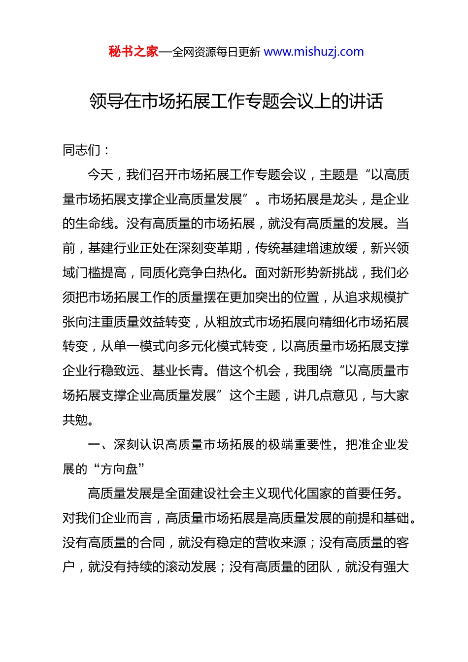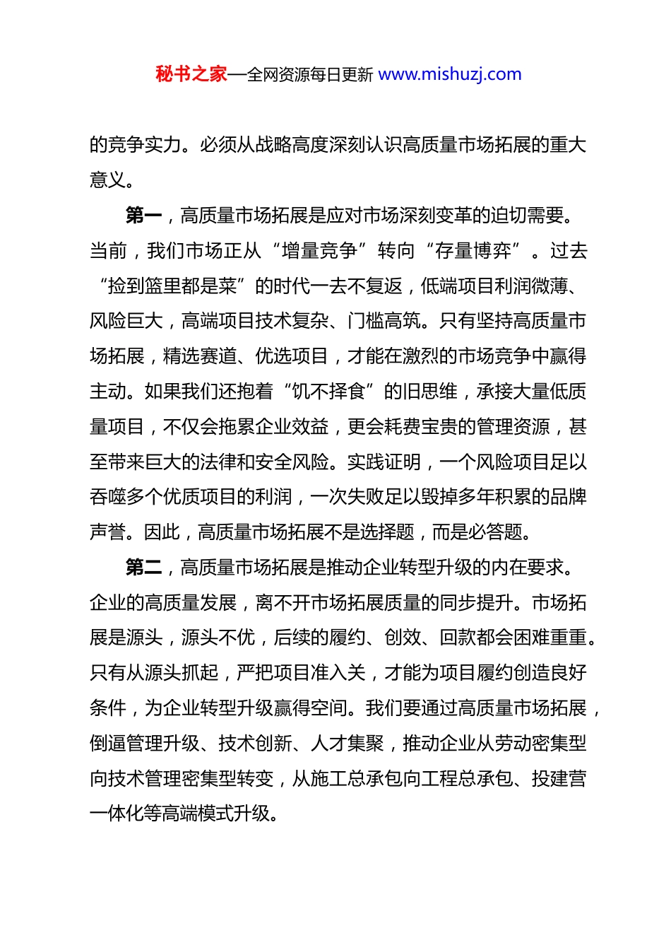 秘书之家—全网资源每日更新 www.mishuzj.com领导在市场拓展工作专题会议上的讲话 同志们:今天,我们召开市场拓展工作专题会议,主题是“以高质量市场拓展支撑企业高质量发展”。市场拓展是龙头,是企业的生命线。没有高质量的市场拓展,就没有高质量的发展。当前,基建行业正处在深刻变革期,传统基建增速放缓,新兴领域门槛提高,同质化竞争白热化。面对新形势新挑战,我们必须把市场拓展工作的质量摆在更加突出的位置,从追求规模扩张向注重质量效益转变,从粗放式市场拓展向精细化市场拓展转变,从单一模式向多元化模式转变,以高质量市场拓展支撑企业行稳致远、基业长青。借这个机会,我围绕“以高质量市场拓展支撑企业高质量发展”这个主题,讲几点意见,与大家共勉。一、深刻认识高质量市场拓展的极端重要性,把准企业发展的“方向盘”高质量发展是全面建设社会主义现代化国家的首要任务。对我们企业而言,高质量市场拓展是高质量发展的前提和基础。没有高质量的合同,就没有稳定的营收来源;没有高质量的客户,就没有持续的滚动发展;没有高质量的团队,就没有强大秘书之家—全网资源每日更新 www.mishuzj.com的竞争实力。必须从战略高度深刻认识高质量市场拓展的重大意义。第一,高质量市场拓展是应对市场深刻变革的迫切需要。 当前,我们市场正从“增量竞争”转向“存量博弈”。过去“捡到篮里都是菜”的时代一去不复返,低端项目利润微薄、风险巨大,高端项目技术复杂、门槛高筑。只有坚持高质量市场拓展,精选赛道、优选项目,才能在激烈的市场竞争中赢得主动。如果我们还抱着“饥不择食”的旧思维,承接大量低质量项目,不仅会拖累企业效益,更会耗费宝贵的管理资源,甚至带来巨大的法律和安全风险。实践证明,一个风险项目足以吞噬多个优质项目的利润,一次失败足以毁掉多年积累的品牌声誉。因此,高质量市场拓展不是选择题,而是必答题。第二,高质量市场拓展是推动企业转型升级的内在要求。 企业的高质量发展,离不开市场拓展质量的同步提升。市场拓展是源头,源头不优,后续的履约、创效、回款都会困难重重。只有从源头抓起,严把项目准入关,才能为项目履约创造良好条件,为企业转型升级赢得空间。我们要通过高质量市场拓展,倒逼管理升级、技术创新、人才集聚,推动企业从劳动密集型向技术管理密集型转变,从施工总承包向工程总承包、投建营一体化等高端模式升级。秘书之家—全网资源每日更新 www.mishuzj.com第三,高质量市场拓展是防范化解风险的重要屏障。 我们企业市场拓展风险点多面广,业主资信风险、合同条款风险、结算风险等交织叠加。很多风险是在市场拓展阶段埋下的隐患。例如,盲目承接资金不到位的项目,可能导致工程款拖欠;草率签订权利义务不对等的合同,可能陷入法律纠纷;轻信虚假承诺,可能落入陷阱。高质量市场拓展强调“有所为有所不为”,要求我们对项目进行全方位、多维度风险评估,从源头上规避风险,为企业行稳致远保驾护航。第四,高质量市场拓展是提升企业品牌价值的关键举措。 在我们市场,品牌就是竞争力。一个以高质量市场拓展著称的企业,更容易赢得高端客户的青睐,更容易获得优质项目的入场券,更容易在区域市场形成“马太效应”。相反,一个频频承接低端项目、纠纷不断的企业,形象必然受损,市场信任度必然下降。通过高质量市场拓展,我们可以树立“专业、诚信、卓越”的品牌形象,吸引更多优质客户,形成“优质项目—优质履约—品牌提升—更多优质项目”的良性循环。二、准确把握高质量市场拓展的内涵要求,树立“五个坚持”的鲜明导向高质量市场拓展不是一句空洞的口号,而是有着丰富内涵和明确要求的系统工程。要重点把握好“五个坚持”。秘书之家—全网资源每日更新 www.mishuzj.com第一,坚持战略引领,优化市场布局。 高质量市场拓展首先体现在战略方向上。要紧紧围绕国家重大战略和区域发展规划,精准布局、深耕细作。一是聚焦核心区域。要持续深耕华南、华东等传统优势市场,巩固根据地,提高市场占有率。要深入研究区域发展规划,提前介入、超前谋划,争取在重点城市、重点园区实现突破。二是拓展新兴领...