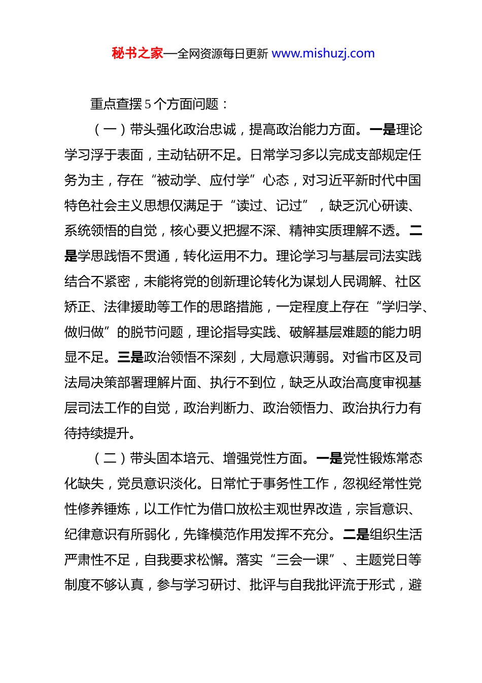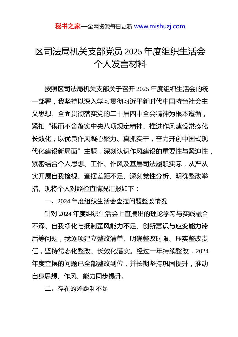 秘书之家—全网资源每日更新 www.mishuzj.com区司法局机关支部党员 2025 年度组织生活会个人发言材料 按照区司法局机关支部关于召开 2025 年度组织生活会的统一部署,我坚持以深入学习贯彻习近平新时代中国特色社会主义思想、全面贯彻落实党的二十届四中全会精神为根本遵循,紧扣“锲而不舍落实中央八项规定精神、推进作风建设常态化长效化,以优良作风凝心聚力、真抓实干,奋力开创中国式现代化建设新局面”主题,深刻认识作风建设的重要性与紧迫性,紧密结合个人思想、工作、作风及基层司法履职实际,从严从实开展自我检视、查摆差距不足、深刻党性分析、明确整改举措。现将个人对照检查情况汇报如下:一、2024 年度组织生活会查摆问题整改情况针对 2024 年度组织生活会上查摆出的理论学习与实践融合不深、自我净化与抵制歪风能力不足、创新意识与应变能力滞后等问题,我逐项建立整改清单、明确整改时限、压实整改责任,坚持常态化整改、长效化落实。经过一年持续整改,2024年度查摆的问题已全部整改到位,并长期坚持巩固提升,推动自身思想、作风、能力同步提升。二、存在的差距和不足秘书之家—全网资源每日更新 www.mishuzj.com重点查摆 5 个方面问题:(一)带头强化政治忠诚,提高政治能力方面。一是理论学习浮于表面,主动钻研不足。日常学习多以完成支部规定任务为主,存在“被动学、应付学”心态,对习近平新时代中国特色社会主义思想仅满足于“读过、记过”,缺乏沉心研读、系统领悟的自觉,核心要义把握不深、精神实质理解不透。二是学思践悟不贯通,转化运用不力。理论学习与基层司法实践结合不紧密,未能将党的创新理论转化为谋划人民调解、社区矫正、法律援助等工作的思路措施,一定程度上存在“学归学、做归做”的脱节问题,理论指导实践、破解基层难题的能力明显不足。三是政治领悟不深刻,大局意识薄弱。对省市区及司法局决策部署理解片面、执行不到位,缺乏从政治高度审视基层司法工作的自觉,政治判断力、政治领悟力、政治执行力有待持续提升。(二)带头固本培元、增强党性方面。一是党性锻炼常态化缺失,党员意识淡化。日常忙于事务性工作,忽视经常性党性修养锤炼,以工作忙为借口放松主观世界改造,宗旨意识、纪律意识有所弱化,先锋模范作用发挥不充分。二是组织生活严肃性不足,自我要求松懈。落实“三会一课”、主题党日等制度不够认真,参与学习研讨、批评与自我批评流于形式,避秘书之家—全网资源每日更新 www.mishuzj.com重就轻、敷衍应付,未能真正做到红脸出汗、排毒治病。三是自我革命精神不足,政治品格不硬。面对自身思想、作风、工作中的问题,缺乏刀刃向内、深刻检视的勇气,安于现状、不思进取,在砥砺政治品格、严守纪律规矩上缺乏韧劲与定力。(三)带头敬畏人民、敬畏组织、敬畏法纪方面。一是深入基层不经常,群众联结不紧密。日常多坐在办公室处理业务,主动深入社区、走访群众、倾听民声的次数少,对群众急难愁盼问题了解不深、掌握不准,与群众的血肉联系逐渐淡化。二是服务群众不主动,为民措施不精准。开展矛盾纠纷调解、法律援助、安置帮教等工作时,存在“坐等群众上门、被动应付办理”现象,未能主动靠前、精准施策,解决群众实际问题的积极性、实效性不足。三是群众立场不坚定,司法为民不到位。工作中未能始终站在群众立场思考问题、制定方案,换位思考不够、人文关怀不足,背离了基层司法工作为人民服务的根本宗旨,群众满意度有待提升。(四)带头干事创业、担当作为方面。一是担当精神衰减,畏难避责心态显现。面对复杂矛盾、棘手任务,存在“求稳怕乱、畏首畏尾”思想,缺乏迎难而上、啃硬骨头的闯劲拼劲,在推进社区矫正创新、矛盾纠纷源头化解等工作中不敢担当、不愿作为。二是工作标准不严格,履职质效不突出。满足于完秘书之家—全网资源每日更新 www.mishuzj.com成基本任务、不出差错,缺乏精益求精、争创一流的追求,基层司法工作平平无奇、亮点不多,履职尽责的质量和效率有待提高。三是创新意识滞后,思路方法僵化。受传统思维、固有模式束缚,面对基层治理新形势新问题,思路不宽、办法老旧,在...