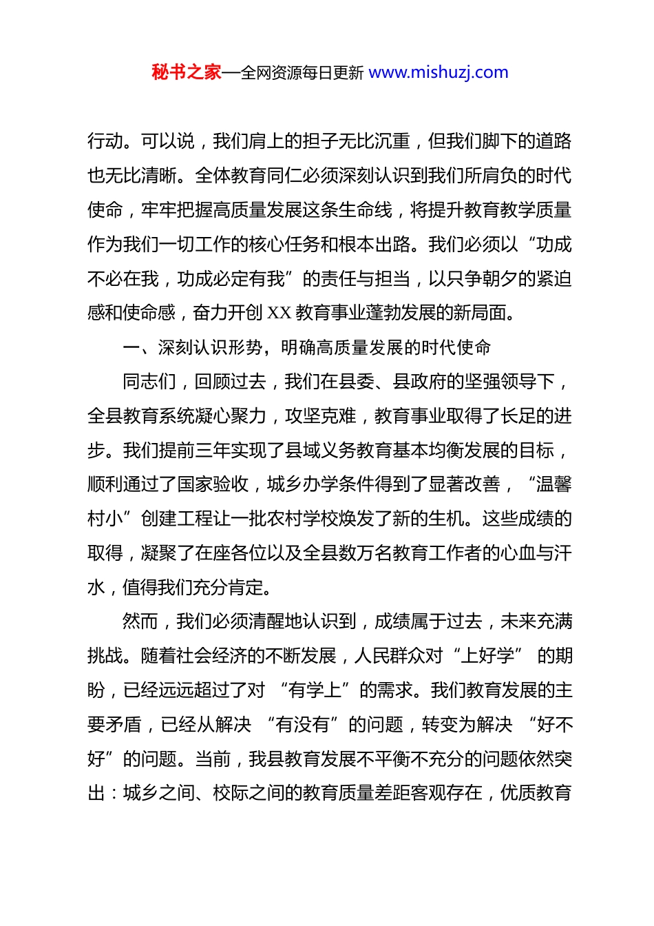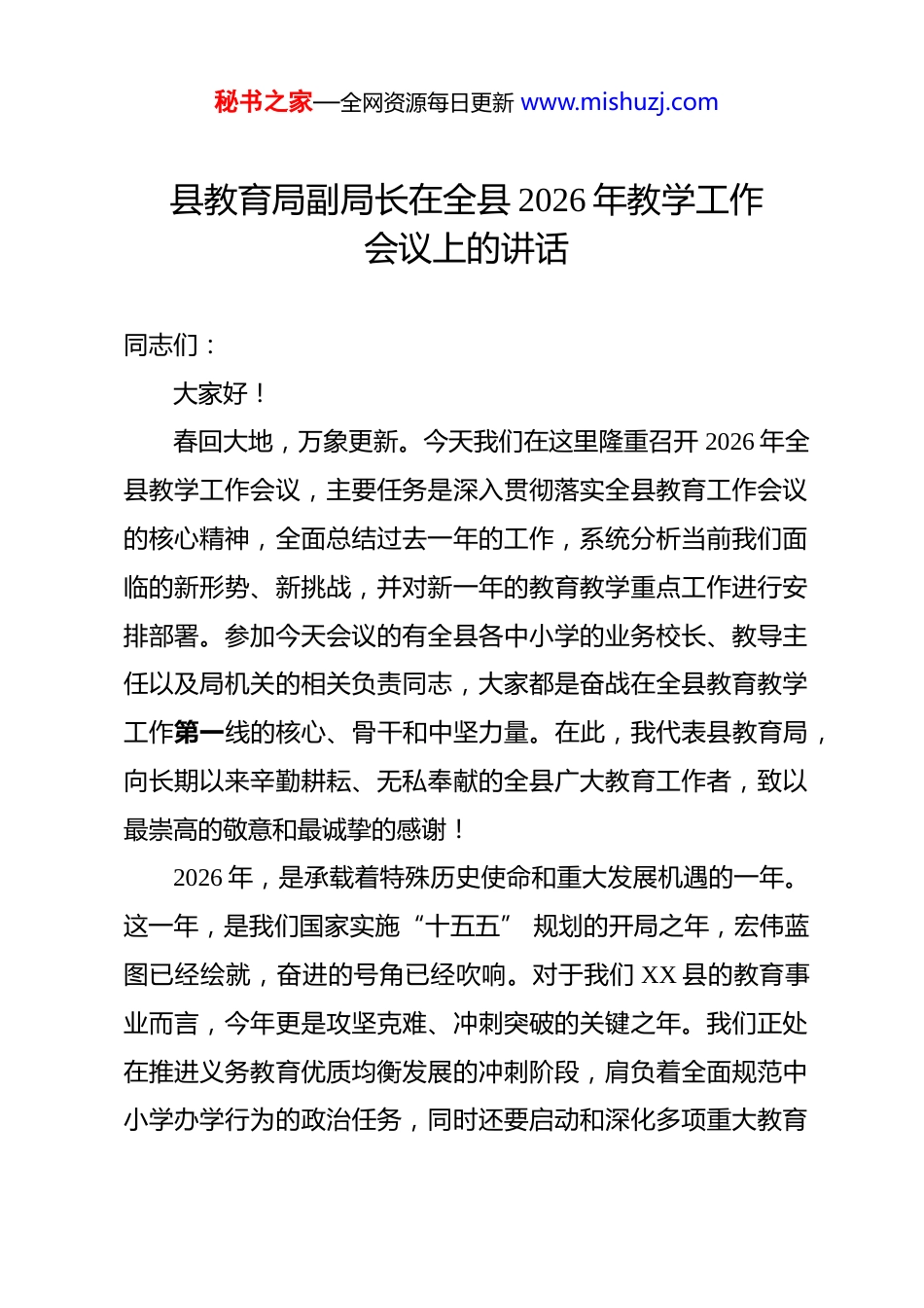 秘书之家—全网资源每日更新 www.mishuzj.com县教育局副局长在全县 2026 年教学工作会议上的讲话 同志们:大家好!春回大地,万象更新。今天我们在这里隆重召开 2026 年全县教学工作会议,主要任务是深入贯彻落实全县教育工作会议的核心精神,全面总结过去一年的工作,系统分析当前我们面临的新形势、新挑战,并对新一年的教育教学重点工作进行安排部署。参加今天会议的有全县各中小学的业务校长、教导主任以及局机关的相关负责同志,大家都是奋战在全县教育教学工作第一线的核心、骨干和中坚力量。在此,我代表县教育局,向长期以来辛勤耕耘、无私奉献的全县广大教育工作者,致以最崇高的敬意和最诚挚的感谢!2026 年,是承载着特殊历史使命和重大发展机遇的一年。这一年,是我们国家实施“十五五” 规划的开局之年,宏伟蓝图已经绘就,奋进的号角已经吹响。对于我们 XX 县的教育事业而言,今年更是攻坚克难、冲刺突破的关键之年。我们正处在推进义务教育优质均衡发展的冲刺阶段,肩负着全面规范中小学办学行为的政治任务,同时还要启动和深化多项重大教育秘书之家—全网资源每日更新 www.mishuzj.com行动。可以说,我们肩上的担子无比沉重,但我们脚下的道路也无比清晰。全体教育同仁必须深刻认识到我们所肩负的时代使命,牢牢把握高质量发展这条生命线,将提升教育教学质量作为我们一切工作的核心任务和根本出路。我们必须以“功成不必在我,功成必定有我”的责任与担当,以只争朝夕的紧迫感和使命感,奋力开创 XX 教育事业蓬勃发展的新局面。一、深刻认识形势,明确高质量发展的时代使命同志们,回顾过去,我们在县委、县政府的坚强领导下,全县教育系统凝心聚力,攻坚克难,教育事业取得了长足的进步。我们提前三年实现了县域义务教育基本均衡发展的目标,顺利通过了国家验收,城乡办学条件得到了显著改善,“温馨村小”创建工程让一批农村学校焕发了新的生机。这些成绩的取得,凝聚了在座各位以及全县数万名教育工作者的心血与汗水,值得我们充分肯定。然而,我们必须清醒地认识到,成绩属于过去,未来充满挑战。随着社会经济的不断发展,人民群众对“上好学” 的期盼,已经远远超过了对 “有学上”的需求。我们教育发展的主要矛盾,已经从解决 “有没有”的问题,转变为解决 “好不好”的问题。当前,我县教育发展不平衡不充分的问题依然突出:城乡之间、校际之间的教育质量差距客观存在,优质教育秘书之家—全网资源每日更新 www.mishuzj.com资源总量不足、配置不均的矛盾依然尖锐;部分学校的办学理念、教学模式和管理水平,还不能完全适应新时代发展的要求;教师队伍的专业素养和创新能力,还有待进一步提升。面对这些挑战,我们别无选择,唯有将高质量发展作为我们教育工作的生命线。质量是教育的灵魂,是学校的立身之本,更是我们回应人民期盼、实现教育现代化的根本出路。全县上下必须统一思想,凝聚共识,把全部的精力、资源和智慧都聚焦到提升教育教学质量这个核心任务上来,以质量求生存,以质量谋发展,以质量铸品牌。二、锚定质量核心,实施学段精准攻坚提升质量不能是一句空洞的口号,必须转化为具体、精准可操作的行动策略。我们要坚持系统观念,加强顶层设计,针对不同学段的特点和面临的核心问题,开出精准的“药方”,实施靶向攻坚。一是高中教育要重在转型破局,创新发展。一个全国性的难题,我县高中教育同样面临着生源、师资和发展模式的多重挑战。我们必须拿出壮士断腕的勇气和决心,推动高中教育实现转型升级。首先,要积极对接国家《县域普通高中振兴行动计划》的宏观部署,结合我县实际,制定出符合自身发展的振兴方案。秘书之家—全网资源每日更新 www.mishuzj.com一要改善办学条件,优化育人环境。要持续加大投入,完善硬件设施,同时更要筑巢引凤,通过优化待遇、搭建平台等方式,吸引和留住一批高水平的教师队伍,这是高中教育振兴的根本保障。二要深化课程教学改革。要紧跟高考综合改革的步伐,不能再用老办法应对新高考。必须在开足开齐国家课程的基础上,积极开发具有本校特色的校本课程,推动教学方式从“教师为中心” ...