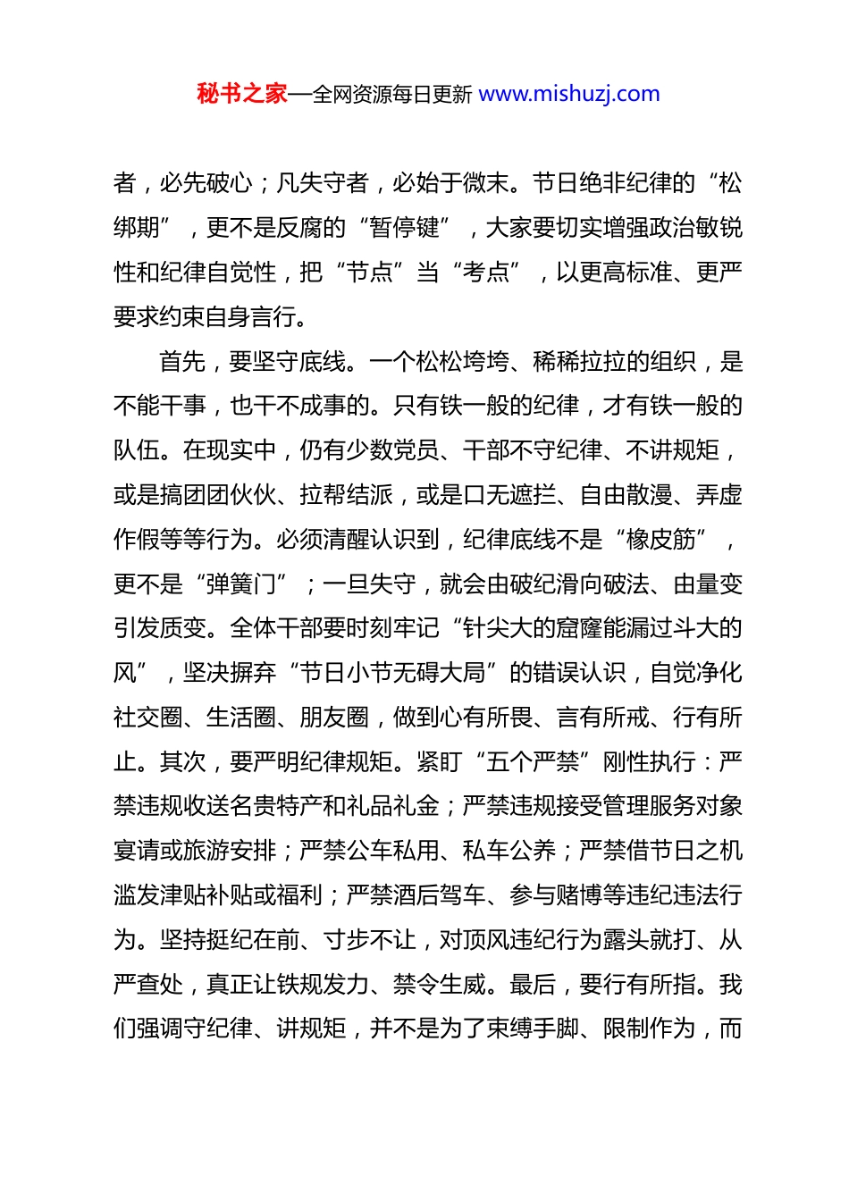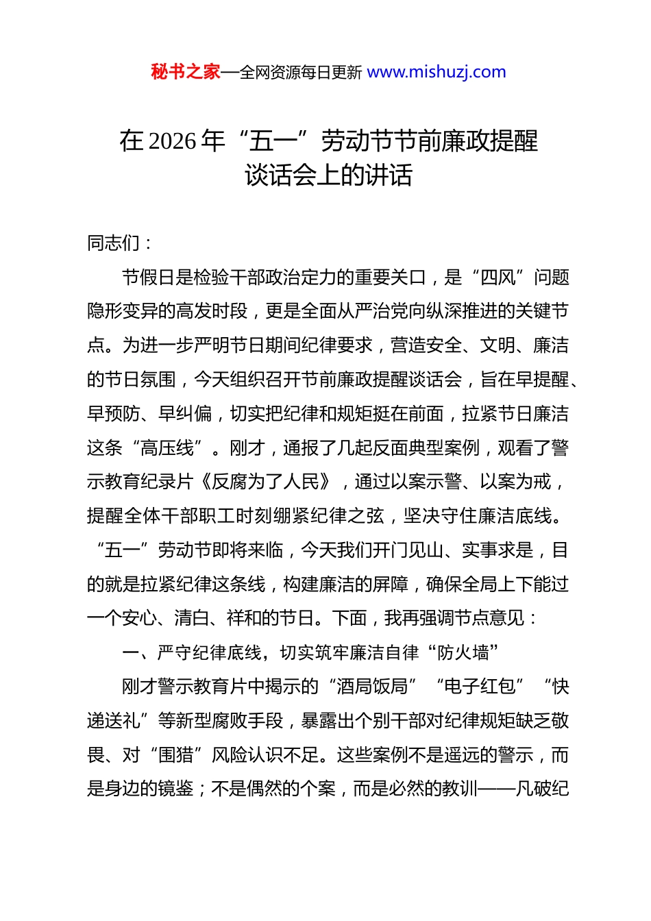 秘书之家—全网资源每日更新 www.mishuzj.com在 2026 年“五一”劳动节节前廉政提醒谈话会上的讲话 同志们:节假日是检验干部政治定力的重要关口,是“四风”问题隐形变异的高发时段,更是全面从严治党向纵深推进的关键节点。为进一步严明节日期间纪律要求,营造安全、文明、廉洁的节日氛围,今天组织召开节前廉政提醒谈话会,旨在早提醒、早预防、早纠偏,切实把纪律和规矩挺在前面,拉紧节日廉洁这条“高压线”。刚才,通报了几起反面典型案例,观看了警示教育纪录片《反腐为了人民》,通过以案示警、以案为戒,提醒全体干部职工时刻绷紧纪律之弦,坚决守住廉洁底线。“五一”劳动节即将来临,今天我们开门见山、实事求是,目的就是拉紧纪律这条线,构建廉洁的屏障,确保全局上下能过一个安心、清白、祥和的节日。下面,我再强调节点意见:一、严守纪律底线,切实筑牢廉洁自律“防火墙”刚才警示教育片中揭示的“酒局饭局”“电子红包”“快递送礼”等新型腐败手段,暴露出个别干部对纪律规矩缺乏敬畏、对“围猎”风险认识不足。这些案例不是遥远的警示,而是身边的镜鉴;不是偶然的个案,而是必然的教训——凡破纪秘书之家—全网资源每日更新 www.mishuzj.com者,必先破心;凡失守者,必始于微末。节日绝非纪律的“松绑期”,更不是反腐的“暂停键”,大家要切实增强政治敏锐性和纪律自觉性,把“节点”当“考点”,以更高标准、更严要求约束自身言行。首先,要坚守底线。一个松松垮垮、稀稀拉拉的组织,是不能干事,也干不成事的。只有铁一般的纪律,才有铁一般的队伍。在现实中,仍有少数党员、干部不守纪律、不讲规矩,或是搞团团伙伙、拉帮结派,或是口无遮拦、自由散漫、弄虚作假等等行为。必须清醒认识到,纪律底线不是“橡皮筋”,更不是“弹簧门”;一旦失守,就会由破纪滑向破法、由量变引发质变。全体干部要时刻牢记“针尖大的窟窿能漏过斗大的风”,坚决摒弃“节日小节无碍大局”的错误认识,自觉净化社交圈、生活圈、朋友圈,做到心有所畏、言有所戒、行有所止。其次,要严明纪律规矩。紧盯“五个严禁”刚性执行:严禁违规收送名贵特产和礼品礼金;严禁违规接受管理服务对象宴请或旅游安排;严禁公车私用、私车公养;严禁借节日之机滥发津贴补贴或福利;严禁酒后驾车、参与赌博等违纪违法行为。坚持挺纪在前、寸步不让,对顶风违纪行为露头就打、从严查处,真正让铁规发力、禁令生威。最后,要行有所指。我们强调守纪律、讲规矩,并不是为了束缚手脚、限制作为,而秘书之家—全网资源每日更新 www.mishuzj.com是为干事创业划清边界、校准方向、提供保障;不是捆住发展的绳索,而是护航前行的护栏。唯有把纪律规矩内化为日用而不觉的行为准则,才能在纷繁复杂的诱惑面前稳住心神、守住气节、把住操守,真正让清正廉洁成为我们最鲜明的政治底色和最牢固的职业基石。二、筑牢廉洁防线,守住廉洁从政“底线”作为党员干部,要始终牢记,手中的权利是人民赋予的,只能用来为人民服务,绝不能成为谋取私利的工具;要时刻自重自省自警自励,慎独慎微慎始慎终,自觉接受组织监督、群众监督、舆论监督,习惯在受监督和约束的环境中工作生活。要带头树立良好家风,不利用职务影响力谋取私利,以清廉家风涵养党风政风。要严格落实《关于进一步贯彻落实中央八项规定精神的实施办法》各项要求,尤其对照第十八条、第十九条、第二十条等条款,逐条检视自身行为,务必严防“四风”隐形变异问题反弹回潮。要切实把节日期间廉洁自律要求,融入日常管理、嵌入工作细节,放到清廉机关建设大局中统筹推进,真正做到思想上高度重视、行动上坚决落实、作风上务实过硬,以节日廉洁成效护航各项工作高质量开展。首先,要坚守根本,把准前行方向。讲规矩,首先要讲政治规矩;守纪律,首先要守政治纪律。在这个问题上,每名党秘书之家—全网资源每日更新 www.mishuzj.com员干部都要十分明确地强调,十分坚定地执行,不能语焉不详、闪烁其词,不能只是嘴上说说、纸上写写,必须时刻绷紧旗帜鲜明讲政治这根弦,始终对党忠诚老实、言行一致、表里如一,确保在任何时候任何情况下都做到政治...