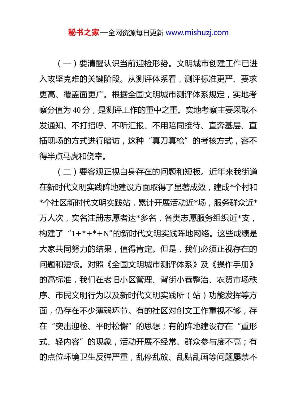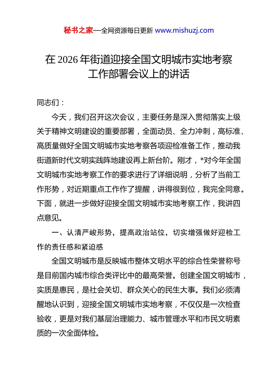 秘书之家—全网资源每日更新 www.mishuzj.com在 2026 年街道迎接全国文明城市实地考察工作部署会议上的讲话 同志们:今天,我们召开这次会议,主要任务是深入贯彻落实上级关于精神文明建设的重要部署,全面动员、全力冲刺,高标准、高质量做好全国文明城市实地考察各项迎检准备工作,推动我街道新时代文明实践阵地建设再上新台阶。刚才,*对今年全国文明城市实地考察工作的要求进行了详细说明,分析了当前工作形势,对近期重点工作作了提醒,讲得很到位,我完全同意。下面,就进一步做好迎接全国文明城市实地考察工作,我讲四点意见。一、认清严峻形势,提高政治站位,切实增强做好迎检工作的责任感和紧迫感全国文明城市是反映城市整体文明水平的综合性荣誉称号是目前国内城市综合类评比中的最高荣誉。创建全国文明城市,实质是惠民,是社会关切、群众关心的民生大事。我们必须清醒地认识到,迎接全国文明城市实地考察,不仅仅是一次检查验收,更是对我们基层治理能力、城市管理水平和市民文明素质的一次全面体检。秘书之家—全网资源每日更新 www.mishuzj.com(一)要清醒认识当前迎检形势。文明城市创建工作已进入攻坚克难的关键阶段。从测评体系看,测评标准更严、要求更高、覆盖面更广。根据全国文明城市测评体系规定,实地考察分值为 40 分,是测评工作的重中之重。实地考察主要采取不发通知、不打招呼、不听汇报、不用陪同接待、直奔基层、直插现场的方式进行暗访,这种“真刀真枪”的考核方式,容不得半点马虎和侥幸。(二)要客观正视自身存在的问题和短板。近年来我街道在新时代文明实践阵地建设方面取得了显著成效,建成*个村和*个社区新时代文明实践站,累计开展活动近*场,服务群众近*万人次,实名注册志愿者达*多名,各类志愿服务组织近*支,构建了“1+*+*+N”的新时代文明实践阵地网络。这些成绩是大家共同努力的结果,值得肯定。但是,我们必须正视存在的问题和短板。对照《全国文明城市测评体系》及《操作手册》的高标准,我们在老旧小区管理、背街小巷整治、农贸市场秩序、市民文明行为以及新时代文明实践所(站)功能发挥等方面,仍存在不少薄弱环节。有的社区对创文工作重视不够,存在“突击迎检、平时松懈”的思想;有的阵地建设存在“重形式、轻内容”的现象,活动开展不经常、群众参与度不高;有的点位环境卫生反弹严重,乱停乱放、乱贴乱画等问题屡禁不秘书之家—全网资源每日更新 www.mishuzj.com止。(三)要切实提高政治站位,以决战决胜的姿态投入迎检工作。建设新时代文明实践中心,是深入宣传习近平新时代中国特色社会主义思想的重要载体,是打通宣传群众、教育群众、关心群众、服务群众“最后一公里”的重要举措。我们要把迎接实地考察作为当前一项重大政治任务来抓,坚决克服麻痹思想、厌战情绪、侥幸心理和松劲心态,以决战决胜的姿态、善作善成的作风,全力以赴投入到迎检工作中去,确保实地考察不丢分、得高分,向全街道人民交出一份满意的答卷。二、聚焦测评重点,坚持对标对表,全面提升新时代文明实践阵地建设水平新时代文明实践所(站)是文明城市创建的重要阵地,也是实地考察的重点内容。我们要对照测评标准,坚持问题导向,精准发力,全面提升阵地建设水平。(一)要高标准完善阵地功能。严格按照“有场所、有队伍、有内容、有活动、有保障”的“五有”标准,对辖区内所有新时代文明实践所(站)进行全面排查和提升。要在显著位置设置标识标牌和公益广告,合理规划理论宣讲、市民教育、文化活动、科普宣传、健身活动等功能室,确保设施设备齐全、功能完备。对于功能室被挪用、挤占或挂牌不规范的问题,要秘书之家—全网资源每日更新 www.mishuzj.com立即整改,确保阵地资源整合到位、体制机制健全到位、服务群众精准到位。要依托党群服务中心、文化礼堂、农家书屋等现有资源,打造特色新时代文明实践点,延伸文明实践触角,构建点多面广、互联互通、便民利民的文明实践服务圈。(二)要高质量充实活动内容。阵地建好是基础,用好是关键。要避免出现阵地“空心化”、活动“形式化”的问题。要紧密结合群众需求,常态化开展学习实...