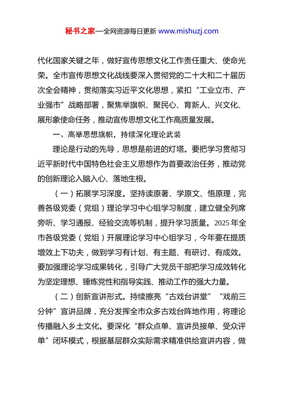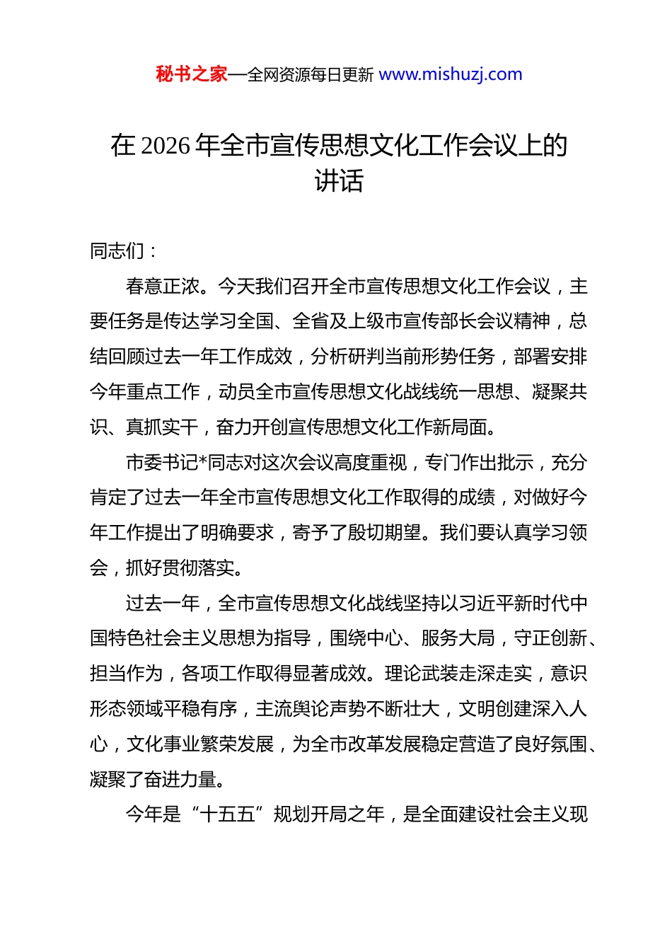 秘书之家—全网资源每日更新 www.mishuzj.com在 2026 年全市宣传思想文化工作会议上的讲话 同志们:春意正浓。今天我们召开全市宣传思想文化工作会议,主要任务是传达学习全国、全省及上级市宣传部长会议精神,总结回顾过去一年工作成效,分析研判当前形势任务,部署安排今年重点工作,动员全市宣传思想文化战线统一思想、凝聚共识、真抓实干,奋力开创宣传思想文化工作新局面。市委书记*同志对这次会议高度重视,专门作出批示,充分肯定了过去一年全市宣传思想文化工作取得的成绩,对做好今年工作提出了明确要求,寄予了殷切期望。我们要认真学习领会,抓好贯彻落实。过去一年,全市宣传思想文化战线坚持以习近平新时代中国特色社会主义思想为指导,围绕中心、服务大局,守正创新、担当作为,各项工作取得显著成效。理论武装走深走实,意识形态领域平稳有序,主流舆论声势不断壮大,文明创建深入人心,文化事业繁荣发展,为全市改革发展稳定营造了良好氛围、凝聚了奋进力量。今年是“十五五”规划开局之年,是全面建设社会主义现秘书之家—全网资源每日更新 www.mishuzj.com代化国家关键之年,做好宣传思想文化工作责任重大、使命光荣。全市宣传思想文化战线要深入贯彻党的二十大和二十届历次全会精神,贯彻落实习近平文化思想,紧扣“工业立市、产业强市”战略部署,聚焦举旗帜、聚民心、育新人、兴文化、展形象使命任务,推动宣传思想文化工作高质量发展。一、高举思想旗帜,持续深化理论武装理论是行动的先导,思想是前进的灯塔。要把学习贯彻习近平新时代中国特色社会主义思想作为首要政治任务,推动党的创新理论入脑入心、落地生根。(一)拓展学习深度。坚持读原著、学原文、悟原理,完善各级党委(党组)理论学习中心组学习制度,建立健全列席旁听、学习通报、经验交流等机制,提升学习质量。2025 年全市各级党委(党组)开展理论学习中心组学习,今年要在提质增效上下功夫,做到学习有计划、有主题、有研讨、有成效。要加强理论学习成果转化,引导广大党员干部把学习成效转化为坚定理想、锤炼党性和指导实践、推动工作的强大力量。(二)创新宣讲形式。持续擦亮“古戏台讲堂”“戏前三分钟”宣讲品牌,充分发挥全市众多古戏台阵地作用,将理论传播融入乡土文化。要深化“群众点单、宣讲员接单、受众评单”闭环模式,根据基层群众实际需求精准供给宣讲内容,做秘书之家—全网资源每日更新 www.mishuzj.com到有的放矢、因人施教。“戏前三分钟”文明实践微宣讲活动要进一步扩大覆盖面、提升影响力,让党的创新理论“飞入寻常百姓家”。(三)加强理论研究。整合党校、高校、社科研究机构等资源力量,围绕党的二十大精神、习近平文化思想、“十五五”规划等重大主题,推出一批有深度、有分量、有影响的理论研究成果。二、服务发展大局,做强主流舆论引导围绕中心、服务大局是宣传思想工作的基本职责。要聚焦“工业立市、产业强市”战略部署,讲好*故事,传播*声音,展示*形象。(一)做强主题宣传。紧扣市委、市政府中心工作,精心策划重大主题宣传活动,深入宣传全市上下贯彻落实党的二十大精神的生动实践,宣传“十五五”规划开局起步的积极进展,宣传工业强市、产业兴市的显著成效。2025 年举办重大主题宣传活动,今年要围绕“十五五”开局、项目建设、乡村振兴等重点,统筹内宣外宣、网上网下,形成强大宣传声势,营造干事创业浓厚氛围。(二)推进媒体变革。加快推进融媒体中心建设提质增效推动内容、技术、平台深度融合,打造新型主流媒体。要顺应秘书之家—全网资源每日更新 www.mishuzj.com移动互联网发展趋势,创新传播方式,提升内容生产能力,增强吸引力感染力。2025 年*市融媒体中心在全省县级融媒体中心综合排名中稳居前列,今年要继续对标先进、争创一流,打造具有地方特色的全媒体传播矩阵。要拓展对外传播渠道,加强与中央、省、市主流媒体合作,讲好*故事、传播*形象。(三)讲好发展故事。深入挖掘全市改革发展稳定的典型案例和先进事迹,围绕重点项目建设、招商引资成果、营商环境优化、乡村振兴进展等,推出一批沾泥土、带露珠、冒热气的新闻...