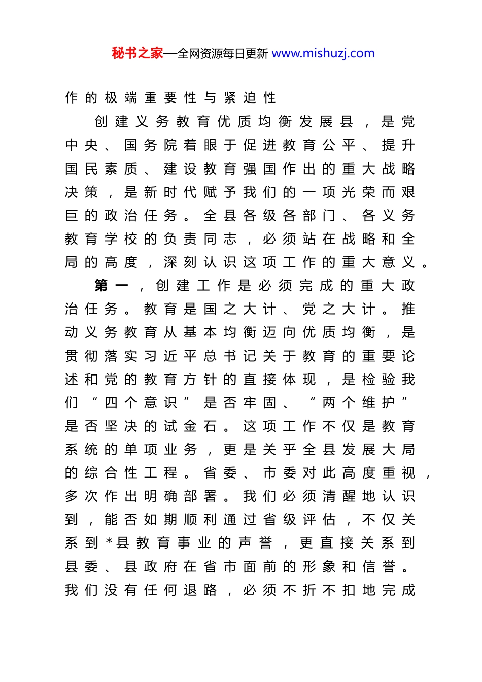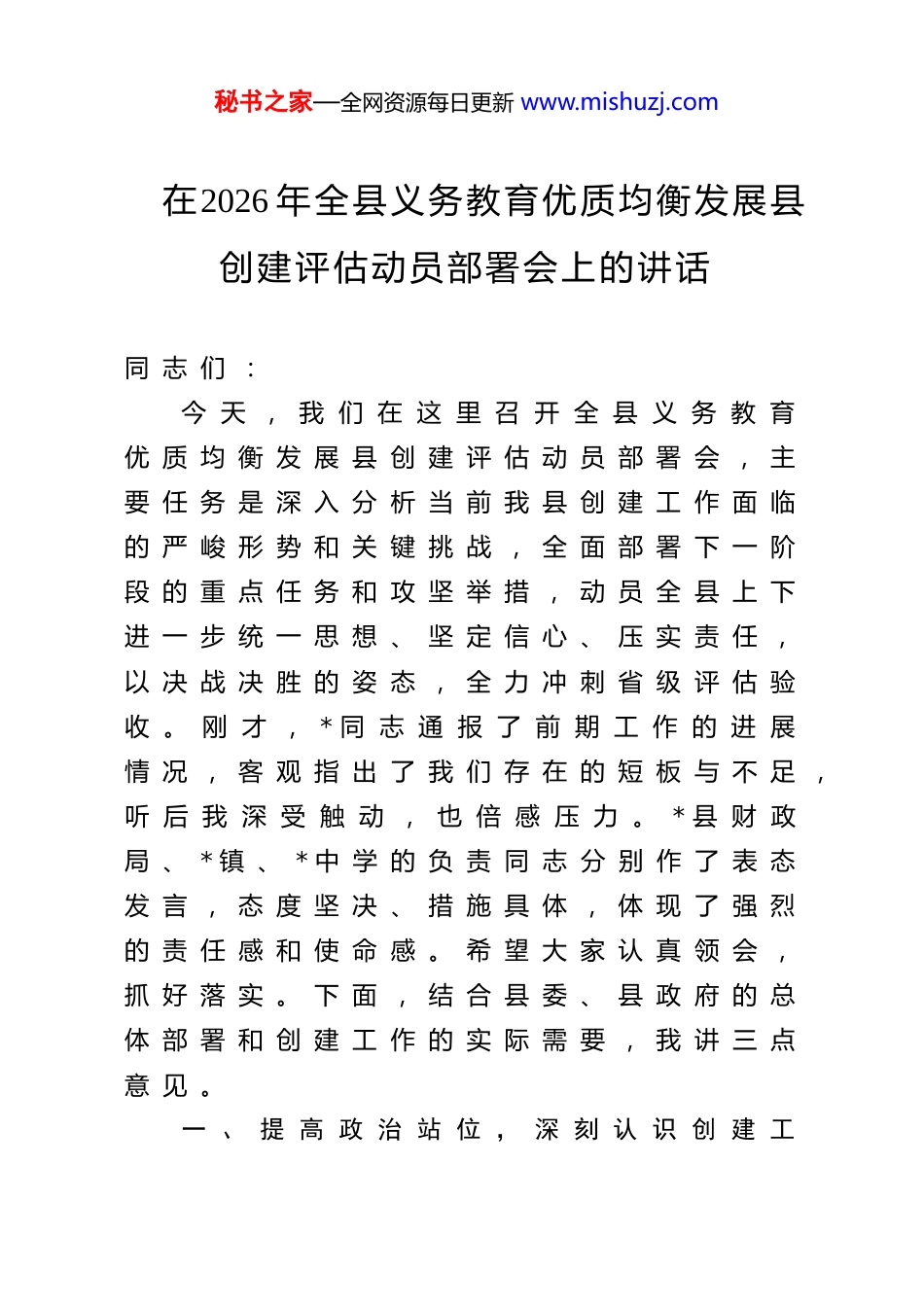 秘书之家—全网资源每日更新 www.mishuzj.com在2026 年全县义务教育优质均衡发展县创建评估动员部署会上的讲话 同 志 们 :今 天 , 我 们 在 这 里 召 开 全 县 义 务 教 育优 质 均 衡 发 展 县 创 建 评 估 动 员 部 署 会 , 主要 任 务 是 深 入 分 析 当 前 我 县 创 建 工 作 面 临的 严 峻 形 势 和 关 键 挑 战 , 全 面 部 署 下 一 阶段 的 重 点 任 务 和 攻 坚 举 措 , 动 员 全 县 上 下进 一 步 统 一 思 想 、 坚 定 信 心 、 压 实 责 任 ,以 决 战 决 胜 的 姿 态 , 全 力 冲 刺 省 级 评 估 验收 。 刚 才 , * 同 志 通 报 了 前 期 工 作 的 进 展情 况 , 客 观 指 出 了 我 们 存 在 的 短 板 与 不 足 ,听 后 我 深 受 触 动 , 也 倍 感 压 力 。 * 县 财 政局 、 * 镇 、 * 中 学 的 负 责 同 志 分 别 作 了 表 态发 言 , 态 度 坚 决 、 措 施 具 体 , 体 现 了 强 烈的 责 任 感 和 使 命 感 。 希 望 大 家 认 真 领 会 ,抓 好 落 实 。 下 面 , 结 合 县 委 、 县 政 府 的 总体 部 署 和 创 建 工 作 的 实 际 需 要 , 我 讲 三 点意 见 。一 、 提 高 政 治 站 位 , 深 刻 认 识 创 建 工秘书之家—全网资源每日更新 www.mishuzj.com作 的 极 端 重 要 性 与 紧 迫 性创 建 义 务 教 育 优 质 均 衡 发 展 县 , 是 党中 央 、 国 务 院 着 眼 于 促 进 教 育 公 平 、 提 升国 民 素 质 、 建 设 教 育 强 国 作 出 的 重 大 战 略决 策 , 是 新 时 代 赋 予 我 们 的 一 项 光 荣 而 艰巨 的 政 治 任 务 。 全 县 各 级 各 部 门 、 各 义 务教 育 学 校 的 负 责 同 志 , 必 须 站 在 战 略 和 全局 的 高 度 , 深 刻 认 识 这 项 工 作 的 重 大 意 义 。第 一 , 创 建 工 作 是 必 须 完 成 的 重 大 政治 任 务 。 教 育 是 国 之 大 计 、 党 之 大 计 。 推动 义 务 教 育 从 基 本 均 衡 迈 向 优 质 均 衡 , 是贯 彻 落 实 习 近 平 总 书 记 关 于 教 育 的 重 要 论述 和 党 的 教 育 方 针 的 直 接 体 现 , 是 检 验 我们 “ 四 个 意 识 ” 是 否 牢 固 、 “ 两 个 维 护 ”是 否 坚 决 的 试 金 石 。 这 项 工 作 不 仅 是 教 育系 统 的 单 项 业 务 , 更 是 关 乎 全 县 发 展 大 局的 综 合 性 工 程 。 省 委 、 市 委 对 此 高 度 重 视 ,多 次 作 出 明 确 部 署 。 我 们 必 须 清 醒 地 认 识到 , 能 否 如 期 顺 利 通 过 省 级 评 估 , 不 仅 关系 到 * 县 教 育 事 业 的 声 誉 , 更 直 接 关 系 到县 委 、 县 政 府 在 省 市 面 前 的 形 象 和 信 誉 。我 们 没 有 任 何 退 路 , 必 须 不 折 不 扣 地 完 成秘书之家—全网资源每日更新 www.mishuzj.com这 项 硬 任 务 , 向 县 委 、 县 政 府 和 全 县 人 民交 上 一 份 满 意 的 答 卷 。第 二 , 创 建 工 作 是 惠 及 千 家 万 户 的 民生 实 事 。 教 育 寄 托 着 万 千 家 庭 对 美 好 生 活的 期 盼 , 关 系 着 每 个 孩 子 的 健 康 成 长 和 未来 发 展 。 随 着 社 会 经 济 水 平 的 不 断 提 高 ,人 民 群 众 对 教 育 的 需 求 已 经 从 “ 有 学 上 ”转 变 为 “ 上 好 学 ” 。 他 们 期 盼 ...