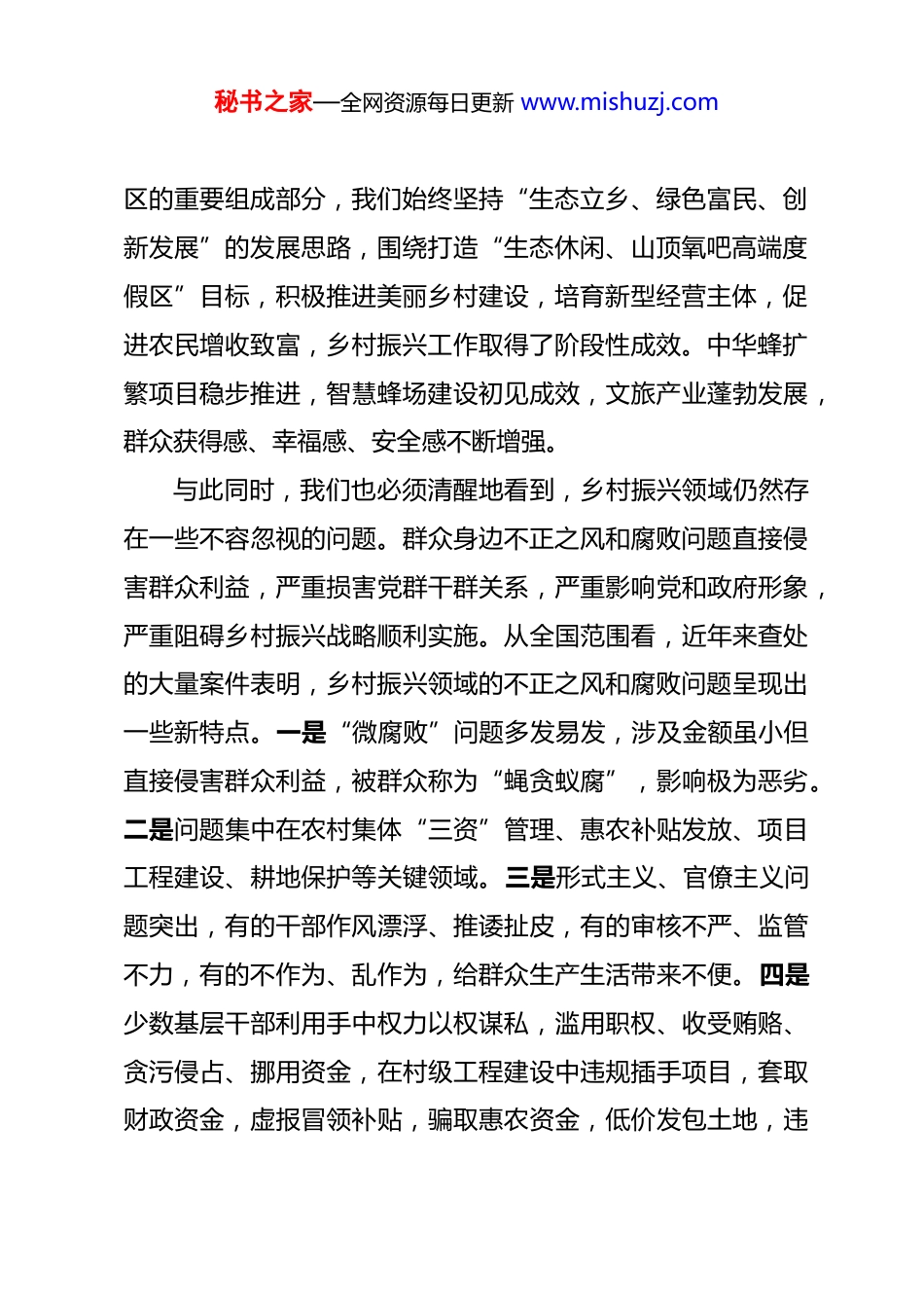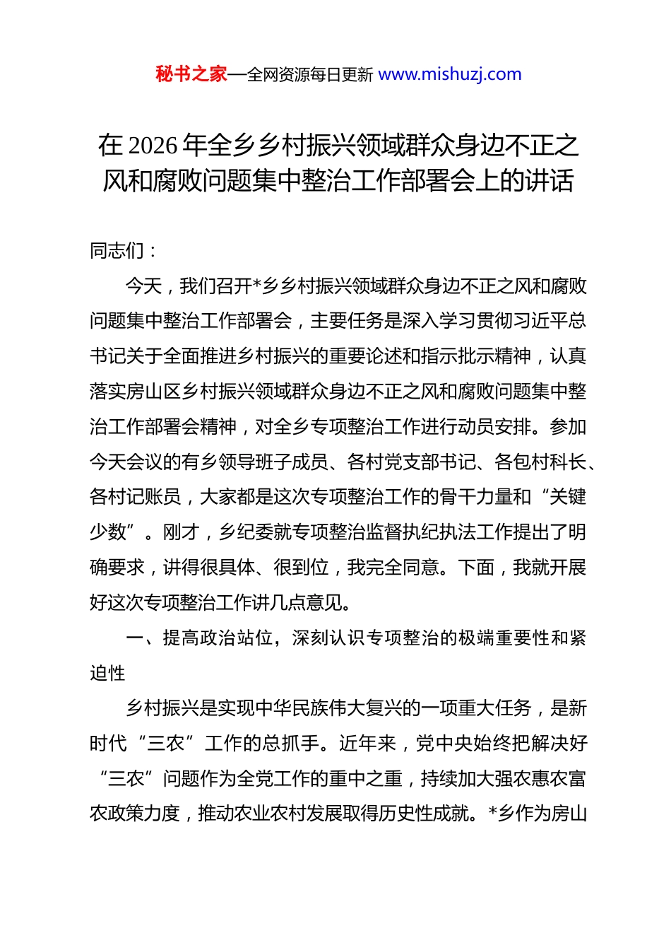 秘书之家—全网资源每日更新 www.mishuzj.com在 2026 年全乡乡村振兴领域群众身边不正之风和腐败问题集中整治工作部署会上的讲话 同志们:今天,我们召开*乡乡村振兴领域群众身边不正之风和腐败问题集中整治工作部署会,主要任务是深入学习贯彻习近平总书记关于全面推进乡村振兴的重要论述和指示批示精神,认真落实房山区乡村振兴领域群众身边不正之风和腐败问题集中整治工作部署会精神,对全乡专项整治工作进行动员安排。参加今天会议的有乡领导班子成员、各村党支部书记、各包村科长、各村记账员,大家都是这次专项整治工作的骨干力量和“关键少数”。刚才,乡纪委就专项整治监督执纪执法工作提出了明确要求,讲得很具体、很到位,我完全同意。下面,我就开展好这次专项整治工作讲几点意见。一、提高政治站位,深刻认识专项整治的极端重要性和紧迫性乡村振兴是实现中华民族伟大复兴的一项重大任务,是新时代“三农”工作的总抓手。近年来,党中央始终把解决好“三农”问题作为全党工作的重中之重,持续加大强农惠农富农政策力度,推动农业农村发展取得历史性成就。*乡作为房山秘书之家—全网资源每日更新 www.mishuzj.com区的重要组成部分,我们始终坚持“生态立乡、绿色富民、创新发展”的发展思路,围绕打造“生态休闲、山顶氧吧高端度假区”目标,积极推进美丽乡村建设,培育新型经营主体,促进农民增收致富,乡村振兴工作取得了阶段性成效。中华蜂扩繁项目稳步推进,智慧蜂场建设初见成效,文旅产业蓬勃发展,群众获得感、幸福感、安全感不断增强。与此同时,我们也必须清醒地看到,乡村振兴领域仍然存在一些不容忽视的问题。群众身边不正之风和腐败问题直接侵害群众利益,严重损害党群干群关系,严重影响党和政府形象,严重阻碍乡村振兴战略顺利实施。从全国范围看,近年来查处的大量案件表明,乡村振兴领域的不正之风和腐败问题呈现出一些新特点。一是“微腐败”问题多发易发,涉及金额虽小但直接侵害群众利益,被群众称为“蝇贪蚁腐”,影响极为恶劣。二是问题集中在农村集体“三资”管理、惠农补贴发放、项目工程建设、耕地保护等关键领域。三是形式主义、官僚主义问题突出,有的干部作风漂浮、推诿扯皮,有的审核不严、监管不力,有的不作为、乱作为,给群众生产生活带来不便。四是少数基层干部利用手中权力以权谋私,滥用职权、收受贿赂、贪污侵占、挪用资金,在村级工程建设中违规插手项目,套取财政资金,虚报冒领补贴,骗取惠农资金,低价发包土地,违秘书之家—全网资源每日更新 www.mishuzj.com规决定重大事项,侵害集体利益。就我乡而言,虽然整体情况是好的,但也要看到在农村集体“三资”管理和高标准农田建设等领域还存在一些薄弱环节。农村集体“三资”管理方面,个别村存在台账登记不全、家底不清的问题,资产资源漏登、权属不清、管理混乱的情况时有发生;财务制度执行不够严格,个别村开支不经集体研究,大额支出不讨论,民主理财形同虚设;集体资产出租、出借、处置程序不够规范,合同签订不及时或条款不清,存在资产流失风险;资源开发利用不充分,有的闲置或低效利用,存在权属争议;监督机制不够健全,民主监督作用发挥不充分。高标准农田建设方面,存在重建设轻管护的问题,项目后续管护不到位,资金管理不够规范,协调推进难度较大。这些问题如果不及时解决,就会严重影响乡村振兴战略的实施效果,严重影响群众的切身利益,严重影响基层政权的公信力。因此,我们必须从政治高度、全局高度来认识这次专项整治工作的重要性。一是要深刻认识到开展专项整治是践行以人民为中心的发展思想的具体体现。人民对美好生活的向往就是我们的奋斗目标。乡村振兴各项政策措施最终要落实到千家万户,要让群众真正得到实惠。如果乡村振兴领域存在不正之风和腐败问题,群众就会对我们的工作产生质疑,对我们的政策失去信心。我们必秘书之家—全网资源每日更新 www.mishuzj.com须以零容忍的态度整治这些问题,用实际行动维护群众利益。二是要深刻认识到开展专项整治是推动乡村振兴战略落地见效的重要保障。乡村振兴是一项系统工程,需要大量资金投入、项目支撑...