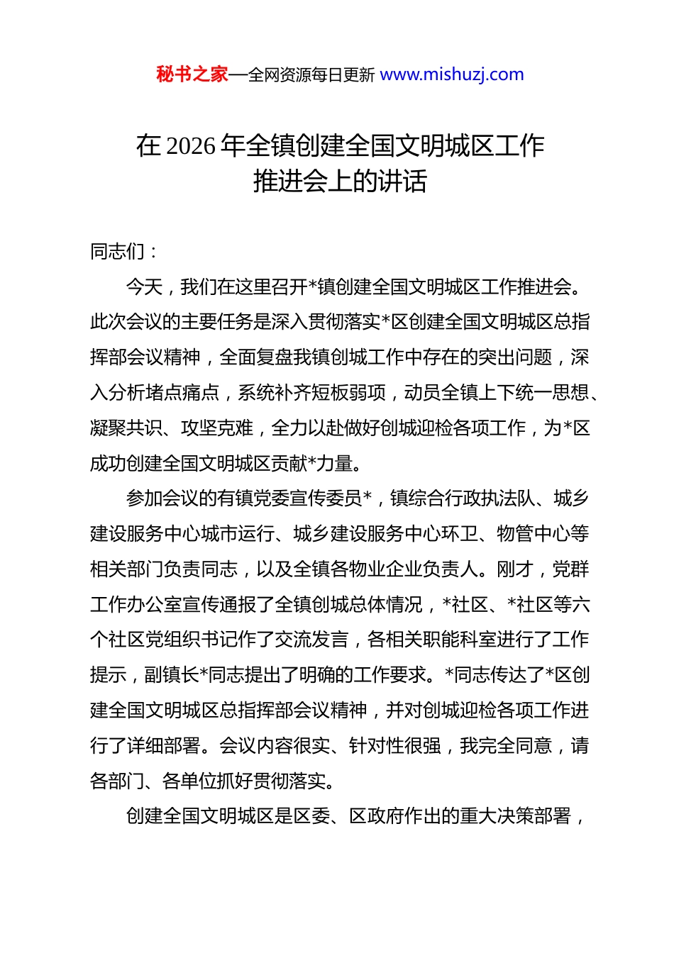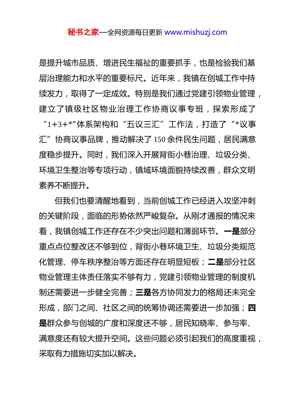 秘书之家—全网资源每日更新 www.mishuzj.com在 2026 年全镇创建全国文明城区工作推进会上的讲话 同志们:今天,我们在这里召开*镇创建全国文明城区工作推进会。此次会议的主要任务是深入贯彻落实*区创建全国文明城区总指挥部会议精神,全面复盘我镇创城工作中存在的突出问题,深入分析堵点痛点,系统补齐短板弱项,动员全镇上下统一思想、凝聚共识、攻坚克难,全力以赴做好创城迎检各项工作,为*区成功创建全国文明城区贡献*力量。参加会议的有镇党委宣传委员*,镇综合行政执法队、城乡建设服务中心城市运行、城乡建设服务中心环卫、物管中心等相关部门负责同志,以及全镇各物业企业负责人。刚才,党群工作办公室宣传通报了全镇创城总体情况,*社区、*社区等六个社区党组织书记作了交流发言,各相关职能科室进行了工作提示,副镇长*同志提出了明确的工作要求。*同志传达了*区创建全国文明城区总指挥部会议精神,并对创城迎检各项工作进行了详细部署。会议内容很实、针对性很强,我完全同意,请各部门、各单位抓好贯彻落实。创建全国文明城区是区委、区政府作出的重大决策部署,秘书之家—全网资源每日更新 www.mishuzj.com是提升城市品质、增进民生福祉的重要抓手,也是检验我们基层治理能力和水平的重要标尺。近年来,我镇在创城工作中持续发力,取得了一定成效。特别是我们通过党建引领物业管理,建立了镇级社区物业治理工作协商议事专班,探索形成了“1+3+*”体系架构和“五议三汇”工作法,打造了“*议事汇”协商议事品牌,推动解决了 150 余件民生问题,居民满意度稳步提升。同时,我们深入开展背街小巷治理、垃圾分类、环境卫生整治等专项行动,镇域环境面貌持续改善,群众文明素养不断提升。但我们也要清醒地看到,当前创城工作已经进入攻坚冲刺的关键阶段,面临的形势依然严峻复杂。从刚才通报的情况来看,我镇创城工作还存在不少突出问题和薄弱环节。一是部分重点点位整改还不够到位,背街小巷环境卫生、垃圾分类规范化管理、停车秩序整治等方面还存在明显短板;二是部分社区物业管理主体责任落实不够有力,党建引领物业管理的制度机制还需要进一步健全完善;三是各方协同发力的格局还未完全形成,部门之间、社区之间的统筹协调还需要进一步加强;四是群众参与创城的广度和深度还不够,居民知晓率、参与率、满意度还有较大提升空间。这些问题必须引起我们的高度重视,采取有力措施切实加以解决。秘书之家—全网资源每日更新 www.mishuzj.com下面,围绕创城迎检工作,我讲四点意见。第一,锚定目标,重点发力,全面排查整改各类问题。创建全国文明城区是一项系统工程,涉及面广、标准高、要求严,必须精准对标、靶向施策。我们要紧紧围绕实地评估重点,对各类不文明乱象开展全覆盖、地毯式排查,建立问题台账,实行销号管理,确保不留死角、不留盲区。一是要把环境秩序问题作为排查重点。重点排查乱堆乱放、垃圾处理不当、占道经营、违规摆摊、乱贴乱画、环境卫生脏乱差等问题,特别是背街小巷、老旧小区、城乡接合部等薄弱区域,要做到底数清、情况明、措施实。二是要把分类整改作为核心抓手。对排查出的问题,要按照轻重缓急、难易程度进行分类梳理,建立“一问题一方案”整改台账,明确整改时限、整改措施、责任单位和责任人,实行挂图作战、销号管理,确保问题整改到位。三是要把动态管理作为长效保障。创城工作不是一阵风、运动式,必须建立常态化、长效化机制。要完善日常巡查、定期检查、随机抽查相结合的监督机制,做到问题早发现、早报告、早处置,防止问题反弹回潮。第二,突出重点,集中整治,确保重点点位整改到位。创城迎检工作时间紧、任务重,必须抓住重点、突破难点、打造亮点。要强化党建引领物业管理,压实社区、物业主体责任,秘书之家—全网资源每日更新 www.mishuzj.com确保重点点位整改到位。一是要把党建引领贯穿物业管理全过程。充分发挥社区党组织的领导核心作用,健全完善社区党组织、居委会、业委会、物业公司“四位一体”协调联动机制,推行“双向进入、交叉任职”制度,定期召开联席会议,研究解决物业管理中的突出问题。要深化“*...
