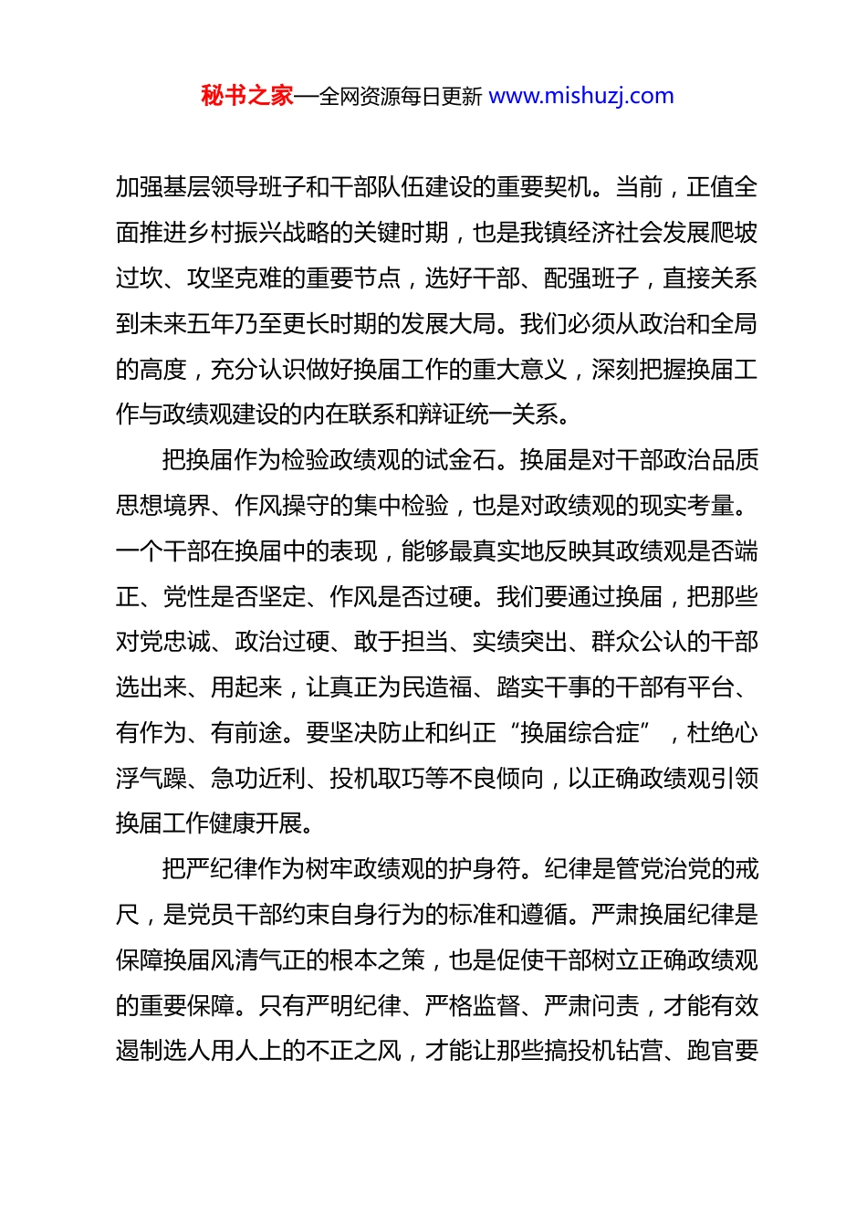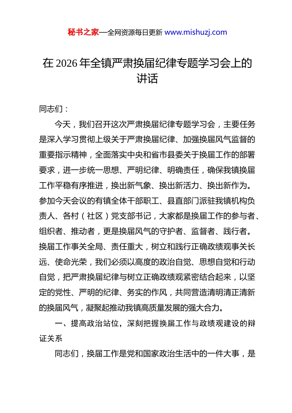 秘书之家—全网资源每日更新 www.mishuzj.com在 2026 年全镇严肃换届纪律专题学习会上的讲话 同志们:今天,我们召开这次严肃换届纪律专题学习会,主要任务是深入学习贯彻上级关于严肃换届纪律、加强换届风气监督的重要指示精神,全面落实中央和省市县委关于换届工作的部署要求,进一步统一思想、严明纪律、明确责任,确保我镇换届工作平稳有序推进,换出新气象、换出新活力、换出新作为。参加今天会议的有镇全体干部职工、县直部门派驻我镇机构负责人、各村(社区)党支部书记,大家都是换届工作的参与者、组织者、推动者,更是换届风气的守护者、监督者、践行者。换届工作事关全局、责任重大,树立和践行正确政绩观事关长远、使命光荣,我们必须以高度的政治自觉、思想自觉和行动自觉,把严肃换届纪律与树立正确政绩观紧密结合起来,以坚定的党性、严明的纪律、务实的作风,共同营造清明清正清新的换届风气,凝聚起推动我镇高质量发展的强大合力。一、提高政治站位,深刻把握换届工作与政绩观建设的辩证关系同志们,换届工作是党和国家政治生活中的一件大事,是秘书之家—全网资源每日更新 www.mishuzj.com加强基层领导班子和干部队伍建设的重要契机。当前,正值全面推进乡村振兴战略的关键时期,也是我镇经济社会发展爬坡过坎、攻坚克难的重要节点,选好干部、配强班子,直接关系到未来五年乃至更长时期的发展大局。我们必须从政治和全局的高度,充分认识做好换届工作的重大意义,深刻把握换届工作与政绩观建设的内在联系和辩证统一关系。把换届作为检验政绩观的试金石。换届是对干部政治品质思想境界、作风操守的集中检验,也是对政绩观的现实考量。一个干部在换届中的表现,能够最真实地反映其政绩观是否端正、党性是否坚定、作风是否过硬。我们要通过换届,把那些对党忠诚、政治过硬、敢于担当、实绩突出、群众公认的干部选出来、用起来,让真正为民造福、踏实干事的干部有平台、有作为、有前途。要坚决防止和纠正“换届综合症”,杜绝心浮气躁、急功近利、投机取巧等不良倾向,以正确政绩观引领换届工作健康开展。把严纪律作为树牢政绩观的护身符。纪律是管党治党的戒尺,是党员干部约束自身行为的标准和遵循。严肃换届纪律是保障换届风清气正的根本之策,也是促使干部树立正确政绩观的重要保障。只有严明纪律、严格监督、严肃问责,才能有效遏制选人用人上的不正之风,才能让那些搞投机钻营、跑官要秘书之家—全网资源每日更新 www.mishuzj.com官、拉票贿选的人无机可乘、无处藏身。要把纪律教育贯穿换届全过程,引导广大干部知敬畏、存戒惧、守底线,以铁的纪律维护换届工作的严肃性和公信力。把强监督作为践行政绩观的导航仪。监督是权力正确运行的根本保证,也是推动干部正确践行政绩观的有效途径。换届期间的监督尤为重要,既要监督选人用人的全过程,又要监督干部的思想行为和作风表现。要充分发挥组织监督、群众监督、舆论监督的作用,形成全覆盖、无死角的监督网络,及时发现和纠正换届中的苗头性、倾向性问题,确保换届工作始终在阳光下运行,确保选出的干部经得起历史和人民的检验。二、严守纪律红线,以铁的规矩护航换届选举风清气正换届纪律是换届工作的生命线,严肃换届纪律是确保换届成功的关键所在。党中央和中央纪委国家监委、中央组织部联合印发的《关于严肃换届纪律加强换届风气监督的通知》,明确提出了“十严禁”纪律要求,这是我们做好换届工作的根本遵循和行动指南。全体与会同志要深入学习领会、坚决贯彻执行,切实把纪律挺在前面,以零容忍的态度正风肃纪。深学细悟“十严禁”要求,筑牢思想防线。思想是行动的先导,认识是落实的前提。要把学习“十严禁”作为当前的重要政治任务,组织党员干部原原本本学、逐条逐项学、联系实秘书之家—全网资源每日更新 www.mishuzj.com际学,真正学深悟透、入脑入心。一要严禁结党营私,绝不允许拉帮结派、搞团团伙伙、培植个人势力,破坏党的团结统一;二要严禁拉票贿选,绝不允许通过宴请、送礼、承诺利益等方式搞非组织活动,扰乱选举秩序;三要严禁买官卖官,绝不允许以贿赂手段谋取职务,搞权钱交易...