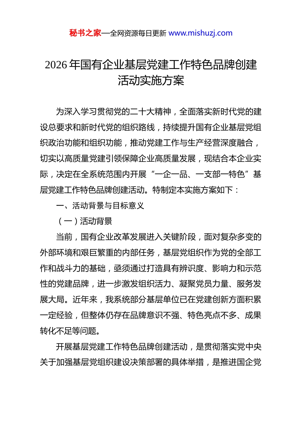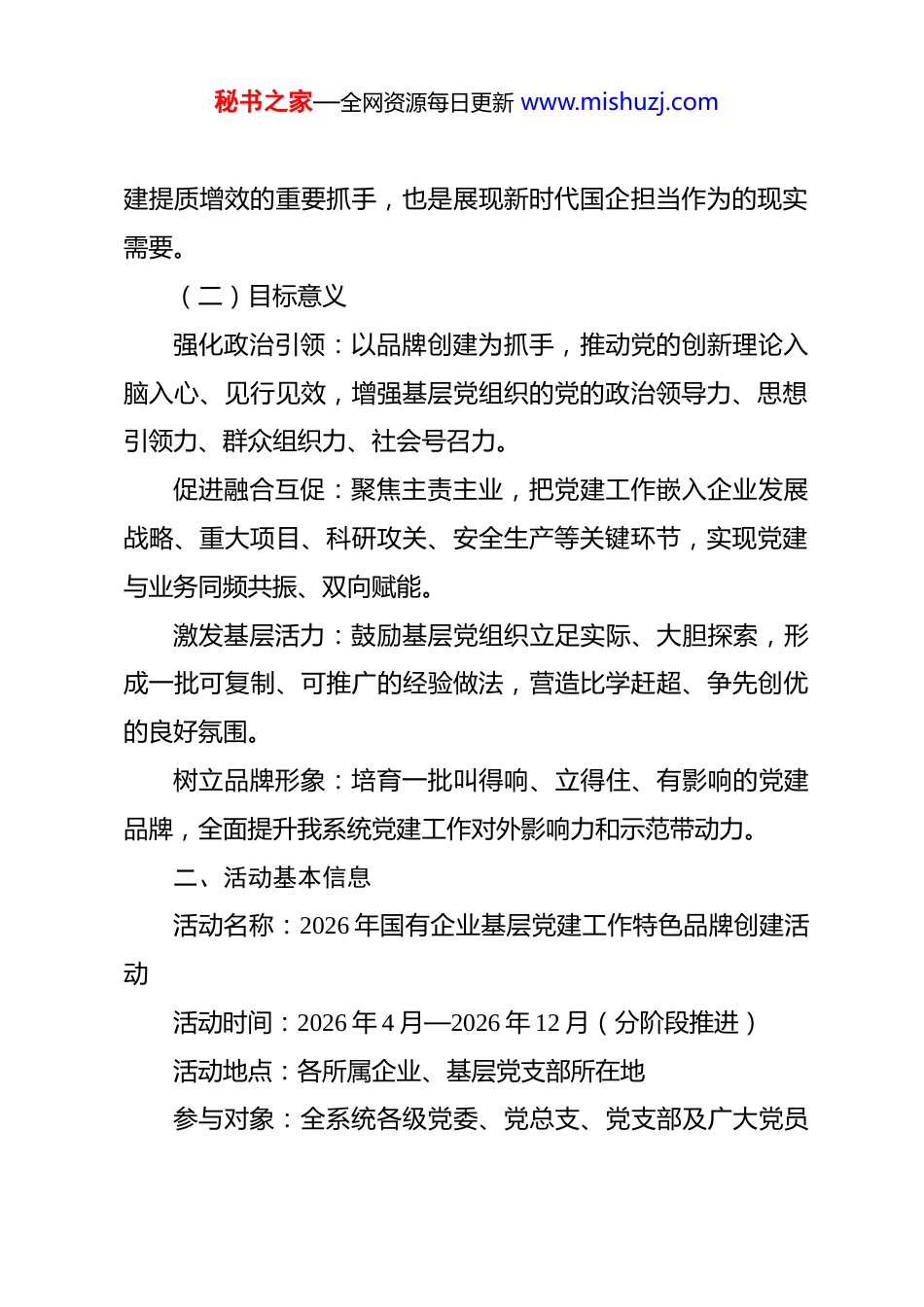 秘书之家—全网资源每日更新 www.mishuzj.com2026 年国有企业基层党建工作特色品牌创建活动实施方案 为深入学习贯彻党的二十大精神,全面落实新时代党的建设总要求和新时代党的组织路线,持续提升国有企业基层党组织政治功能和组织功能,推动党建工作与生产经营深度融合,切实以高质量党建引领保障企业高质量发展,现结合本企业实际,决定在全系统范围内开展“一企一品、一支部一特色”基层党建工作特色品牌创建活动。特制定本实施方案如下:一、活动背景与目标意义(一)活动背景当前,国有企业改革发展进入关键阶段,面对复杂多变的外部环境和艰巨繁重的内部任务,基层党组织作为党的全部工作和战斗力的基础,亟须通过打造具有辨识度、影响力和示范性的党建品牌,进一步激发组织活力、凝聚党员力量、服务发展大局。近年来,我系统部分基层单位已在党建创新方面积累一定经验,但整体仍存在品牌意识不强、特色亮点不多、成果转化不足等问题。开展基层党建工作特色品牌创建活动,是贯彻落实党中央关于加强基层党组织建设决策部署的具体举措,是推进国企党秘书之家—全网资源每日更新 www.mishuzj.com建提质增效的重要抓手,也是展现新时代国企担当作为的现实需要。(二)目标意义强化政治引领:以品牌创建为抓手,推动党的创新理论入脑入心、见行见效,增强基层党组织的党的政治领导力、思想引领力、群众组织力、社会号召力。促进融合互促:聚焦主责主业,把党建工作嵌入企业发展战略、重大项目、科研攻关、安全生产等关键环节,实现党建与业务同频共振、双向赋能。激发基层活力:鼓励基层党组织立足实际、大胆探索,形成一批可复制、可推广的经验做法,营造比学赶超、争先创优的良好氛围。树立品牌形象:培育一批叫得响、立得住、有影响的党建品牌,全面提升我系统党建工作对外影响力和示范带动力。二、活动基本信息活动名称:2026 年国有企业基层党建工作特色品牌创建活动活动时间:2026 年 4 月—2026 年 12 月(分阶段推进)活动地点:各所属企业、基层党支部所在地参与对象:全系统各级党委、党总支、党支部及广大党员秘书之家—全网资源每日更新 www.mishuzj.com干部职工主办单位:集团公司党委办公室协办单位:各二级企业党委、党群工作部三、主要内容与实施步骤本次活动按照“统筹部署、分级实施、分类指导、有序推进”的原则,分为四个阶段组织实施:(一)动员部署阶段(2026 年 4 月 1 日—4 月 15 日)制定印发《实施方案》,召开专题动员会,统一思想、明确任务。各二级企业结合实际制定细化方案,于 4 月 10 日前报集团公司党委办备案。开展宣传引导,利用企业内刊、OA 平台、党建公众号等渠道广泛宣传品牌创建的重要意义和基本要求。责任单位:集团公司党委办公室;完成时限:4 月 15 日前(二)申报立项阶段(2026 年 4 月 16 日—5 月 15 日)基层党支部围绕“服务中心、建设队伍”核心职能,聚焦以下方向自主申报品牌项目:党建+科技创新(如“红色引擎·智创先锋”)党建+安全生产(如“党员身边无事故”)党建+优质服务(如“阳光窗口·红色驿站”)秘书之家—全网资源每日更新 www.mishuzj.com党建+人才培养(如“青蓝工程·薪火相传”)党建+社会责任(如“国企为民·志愿同行”)申报材料包括:品牌名称、内涵阐释、创建思路、预期成效、支撑载体等内容,填写《党建品牌创建申报表》。各二级企业党委组织初审,择优推荐 2—3 个候选品牌项目上报集团公司。责任单位:各基层党支部、二级企业党委;完成时限:5月 15 日前(三)培育创建阶段(2026 年 5 月 16 日—10 月 31 日)集团公司党委对申报项目进行评审,确定首批 10 个重点培育品牌和 20 个一般创建品牌,并予以公示。各创建单位制定详细推进计划,建立工作台账,定期报送进展情况。推行“项目化管理、清单式推进”,实行季度调度机制,由党委办公室牵头召开品牌创建进展交流会。组织专家指导组深入一线调研指导,帮助解决创建过程中遇到的实际问题。加强过程跟踪与动态评估,对推进不力、成效不明显的项目及时提醒或调整。责任单位:集团公司...
