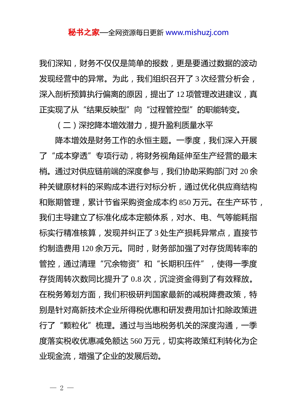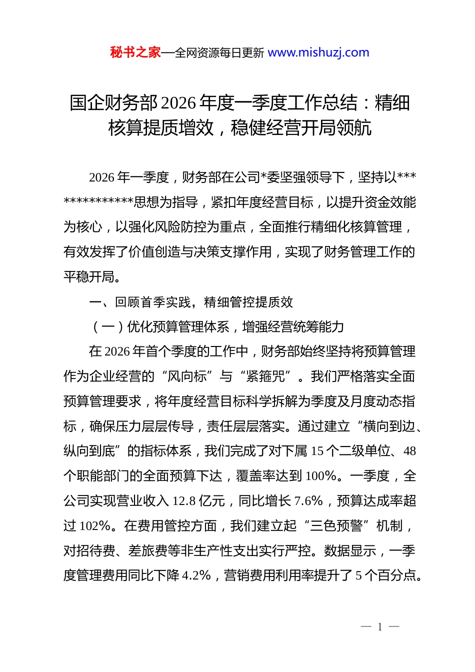 秘书之家—全网资源每日更新 www.mishuzj.com国企财务部 2026 年度一季度工作总结:精细核算提质增效,稳健经营开局领航2026 年一季度,财务部在公司*委坚强领导下,坚持以**************思想为指导,紧扣年度经营目标,以提升资金效能为核心,以强化风险防控为重点,全面推行精细化核算管理,有效发挥了价值创造与决策支撑作用,实现了财务管理工作的平稳开局。一、回顾首季实践,精细管控提质效(一)优化预算管理体系,增强经营统筹能力在 2026 年首个季度的工作中,财务部始终坚持将预算管理作为企业经营的“风向标”与“紧箍咒”。我们严格落实全面预算管理要求,将年度经营目标科学拆解为季度及月度动态指标,确保压力层层传导,责任层层落实。通过建立“横向到边、纵向到底”的指标体系,我们完成了对下属 15 个二级单位、48个职能部门的全面预算下达,覆盖率达到 100%。一季度,全公司实现营业收入 12.8 亿元,同比增长 7.6%,预算达成率超过 102%。在费用管控方面,我们建立起“三色预警”机制,对招待费、差旅费等非生产性支出实行严控。数据显示,一季度管理费用同比下降 4.2%,营销费用利用率提升了 5 个百分点。— 1 —秘书之家—全网资源每日更新 www.mishuzj.com我们深知,财务不仅仅是简单的报数,更是要通过数据的波动发现经营中的异常。为此,我们组织召开了 3 次经营分析会,深入剖析预算执行偏离的原因,提出了 12 项管理改进建议,真正实现了从“结果反映型”向“过程管控型”的职能转变。(二)深挖降本增效潜力,提升盈利质量水平降本增效是财务工作的永恒主题。一季度,我们深入开展了“成本穿透”专项行动,将财务视角延伸至生产经营的最末梢。通过对供应链前端的深度参与,我们协助采购部门对 20 余种关键原材料的采购成本进行对标分析,通过优化供应商结构和账期管理,累计节省采购资金成本约 850 万元。在生产环节,我们主导建立了标准化成本定额体系,对水、电、气等能耗指标实行精准核算,发现并纠正了 3 处生产损耗异常点,直接节约制造费用 120 余万元。同时,财务部加强了对存货周转率的管控,通过清理“冗余物资”和“长期积压件”,使得一季度存货周转次数同比提升了 0.8 次,沉淀资金得到了有效释放。在税务筹划方面,我们积极研判国家最新的减税降费政策,特别是针对高新技术企业所得税优惠和研发费用加计扣除政策进行了“颗粒化”梳理。通过与当地税务机关的深度沟通,一季度落实税收优惠减免额达 560 万元,切实将政策红利转化为企业现金流,增强了企业的发展后劲。— 2 —秘书之家—全网资源每日更新 www.mishuzj.com(三)驱动财务数智转型,赋能管理决策支撑数字化转型是财务管理现代化的必由之路。一季度,我们加快推进了业财融合信息系统的升级迭代,成功上线了“智能费控”和“电子会计档案”两大核心模块。目前,全公司范围内的差旅报销和日常办公费报销已实现全流程在线办理,报销周期从以往的平均 7 个工作日缩短至 1.5 个工作日,极大提升了员工的满意度和财务处理效率。在数据资产挖掘方面,我们搭建了可视化财务大屏,实时呈现资金头寸、收入分布、毛利波动等核心经营指标,为公司领导层决策提供了“秒级”数据支持。一季度,我们利用大数据分析模型,对华东市场的盈利模型进行了深度测算,为公司后续的市场战略调整提供了详实的财务依据。此外,我们积极推行“机器人自动核算”(rpa)技术在银行对账、工资分摊等重复性工作中的应用。据测算,rpa的应用使财务基础核算的自动化率提升了 40%,将财务人员从繁琐的凭证录入中解放出来,投入到更有价值的财务分析与风险控制工作中去,实现了人力资源的结构性优化。(四)构筑风险防控堤坝,保障资产运行安全安全是发展的基石。一季度,财务部始终绷紧风险防控这根弦,构建了多层次的风险防范体系。针对资金风险,我们进一步完善了资金集中管理平台,实现了资金上划率 98%以上,— 3 —秘书之家—全网资源每日更新 www.mishuzj.com确保了资金的高效周转与安全可控。面对国际结算中的汇率波动,我们灵活运用远期结售汇等金融工具,...