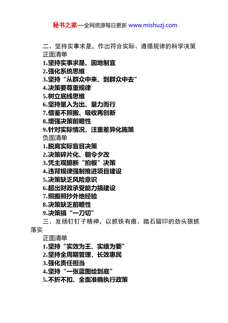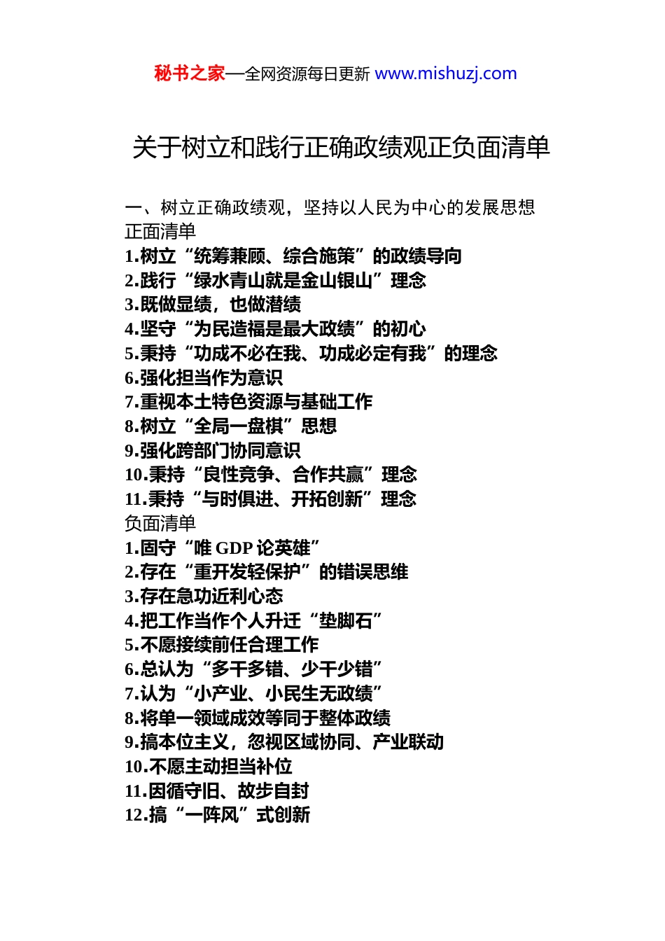 秘书之家—全网资源每日更新 www.mishuzj.com关于树立和践行正确政绩观正负面清单 一、树立正确政绩观,坚持以人民为中心的发展思想正面清单1.树立“统筹兼顾、综合施策”的政绩导向2.践行“绿水青山就是金山银山”理念3.既做显绩,也做潜绩4.坚守“为民造福是最大政绩”的初心5.秉持“功成不必在我、功成必定有我”的理念6.强化担当作为意识7.重视本土特色资源与基础工作8.树立“全局一盘棋”思想9.强化跨部门协同意识10.秉持“良性竞争、合作共赢”理念11.秉持“与时俱进、开拓创新”理念负面清单1.固守“唯 GDP 论英雄”2.存在“重开发轻保护”的错误思维3.存在急功近利心态4.把工作当作个人升迁“垫脚石”5.不愿接续前任合理工作6.总认为“多干多错、少干少错”7.认为“小产业、小民生无政绩”8.将单一领域成效等同于整体政绩9.搞本位主义,忽视区域协同、产业联动10.不愿主动担当补位11.因循守旧、故步自封12.搞“一阵风”式创新秘书之家—全网资源每日更新 www.mishuzj.com二、坚持实事求是,作出符合实际、遵循规律的科学决策正面清单1.坚持实事求是、因地制宜2.强化系统思维3.坚持“从群众中来、到群众中去”4.决策要尊重规律5.树立底线思维6.坚持量入为出、量力而行7.借鉴不照搬、吸收再创新8.增强决策前瞻性9.针对实际情况,注重差异化施策负面清单1.脱离实际盲目决策2.决策碎片化、朝令夕改3.凭主观臆断“拍板”决策4.违背规律强制推进项目建设5.决策缺乏风险意识6.超出财政承受能力搞建设7.照搬照抄外地经验8.决策缺乏前瞻性9.决策搞“一刀切”三、发扬钉钉子精神,以抓铁有痕、踏石留印的劲头狠抓落实正面清单1.坚持“实效为王、实绩为要”2.坚持全周期管理,长效惠民3.强化责任担当4.坚持“一张蓝图绘到底”5.不折不扣、全面准确执行政策秘书之家—全网资源每日更新 www.mishuzj.com6.坚持常态化、长效化推进工作7.平衡显绩与潜绩8.做到令行禁止、落地见效9.加强工作跟踪问效10.服从上级部署、主动协同配合11.注重产学研深度协同12.健全跨层级协作机制13.创新举措聚焦实际问题解决14.立足实际需求开展创新15.建立长效创新机制16.优化创新资源配置17.强化创新全链条管理18.保持创新耐心与定力负面清单1.重形式轻实效2.重引进轻培育、重建设轻管护3.推诿扯皮、敷衍塞责4.“新官不理旧账”5.落实政策打折扣、搞变通6.治理举措“一阵风”7.重显绩轻潜绩8.执行力度不足,“虎头蛇尾”9.重部署轻督查10.跨部门协作中各自为政11.对待上级部署选择性执行12.区域发展中搞恶性竞争13.忽视产学研协同14.创新搞“花架子”15.创新脱离实际需求秘书之家—全网资源每日更新 www.mishuzj.com16.创新资源配置失衡17.忽视创新成果转化18.创新中急于求成四、严守纪律规矩,弘扬良好作风,永葆清正廉洁的政治本色正面清单1.坚决贯彻党中央决策部署2.公平公正考核评价干部3.规范资金使用管理4.严格执行产业准入与环保标准5.主动接受监督6.以真实数据反映工作实绩7.树立质量优先、效益至上的竞争导向8.简化流程,减轻基层负担9.坚持民主集中制10.正视工作中的问题与短板11.在项目建设与公务活动中厉行节约12.多到一线调研走访13.坚持“低调务实、少说多干”负面清单1.搞“上有政策、下有对策”2.在干部考核中搞“人情评分”3.在工作中搞特殊化、特权化4.在项目建设中搞暗箱操作5.违规挪用民生资金用于“形象工程”6.纵容高污染、高耗能企业生产7.拒绝、阻挠监督8.搞“数字造假”“虚假政绩”9.搞“内卷式”竞争秘书之家—全网资源每日更新 www.mishuzj.com10.搞形式主义,加重基层负担11.决策搞“一言堂”12.弄虚作假、瞒报谎报13.在公务活动中讲排场、比阔气14.急于求成、急于表功15.在跨层级协作中“上推下卸”五、始终把人民放在心中最高位置,用心用情用力解决群众急难愁盼问题正面清单1.坚持“民生无小事”2.秉持“实效优先”推进政务服务创新3.政策承诺与民生福利务必贴合实际4.尊重群众主体地位5.对待群众诉求要及时响应6.推进公共服务精准化7.民生项目坚持因地制宜、分类施策8.依法保障群众合法权益9.建立常态化民生诉求响应机制负面清单1.对群众急难愁盼问题推诿拖延2.政...