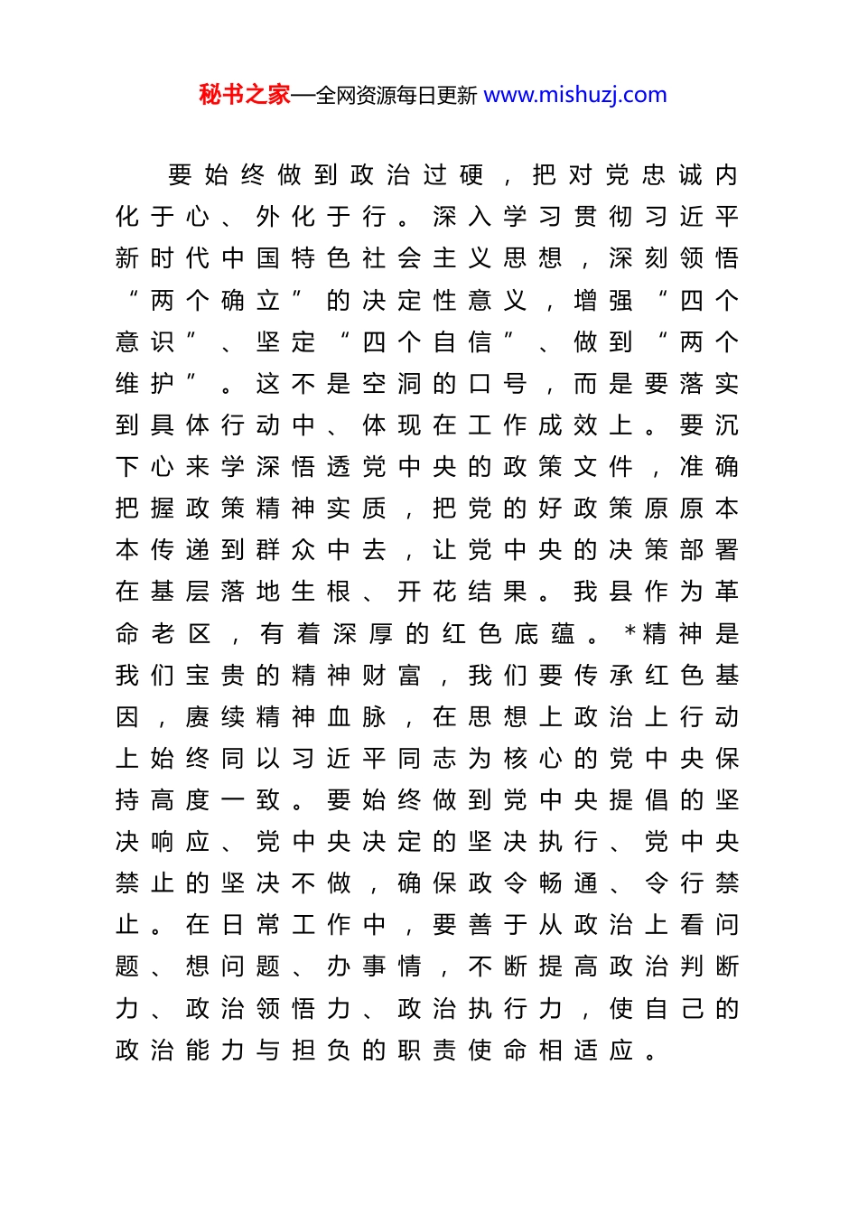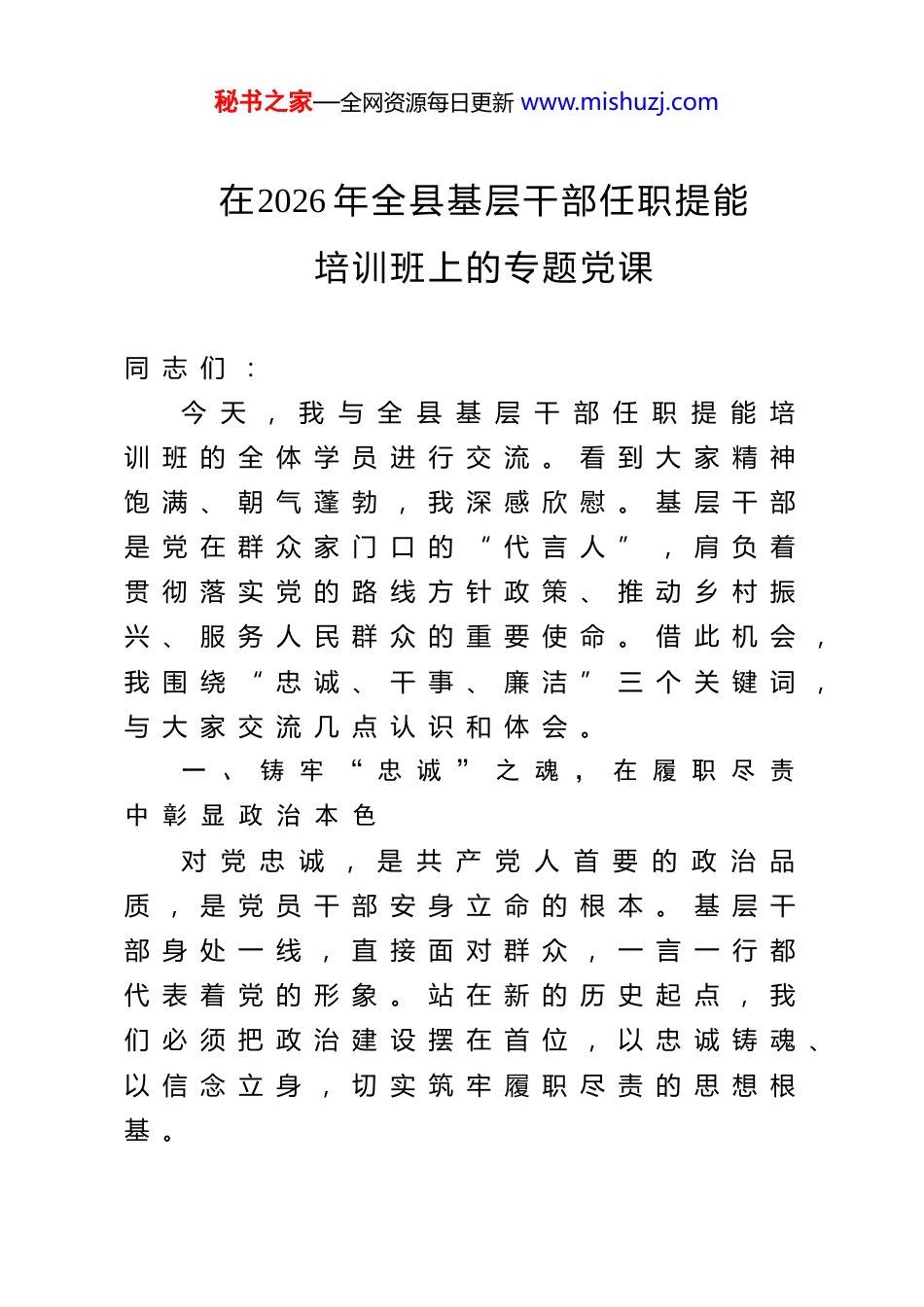 秘书之家—全网资源每日更新 www.mishuzj.com在2026 年全县基层干部任职提能培训班上的专题党课 同 志 们 :今 天 , 我 与 全 县 基 层 干 部 任 职 提 能 培训 班 的 全 体 学 员 进 行 交 流 。 看 到 大 家 精 神饱 满 、 朝 气 蓬 勃 , 我 深 感 欣 慰 。 基 层 干 部是 党 在 群 众 家 门 口 的 “ 代 言 人 ” , 肩 负 着贯 彻 落 实 党 的 路 线 方 针 政 策 、 推 动 乡 村 振兴 、 服 务 人 民 群 众 的 重 要 使 命 。 借 此 机 会 ,我 围 绕 “ 忠 诚 、 干 事 、 廉 洁 ” 三 个 关 键 词 ,与 大 家 交 流 几 点 认 识 和 体 会 。一 、 铸 牢 “ 忠 诚 ” 之 魂 , 在 履 职 尽 责中 彰 显 政 治 本 色对 党 忠 诚 , 是 共 产 党 人 首 要 的 政 治 品质 , 是 党 员 干 部 安 身 立 命 的 根 本 。 基 层 干部 身 处 一 线 , 直 接 面 对 群 众 , 一 言 一 行 都代 表 着 党 的 形 象 。 站 在 新 的 历 史 起 点 , 我们 必 须 把 政 治 建 设 摆 在 首 位 , 以 忠 诚 铸 魂 、以 信 念 立 身 , 切 实 筑 牢 履 职 尽 责 的 思 想 根基 。秘书之家—全网资源每日更新 www.mishuzj.com要 始 终 做 到 政 治 过 硬 , 把 对 党 忠 诚 内化 于 心 、 外 化 于 行 。 深 入 学 习 贯 彻 习 近 平新 时 代 中 国 特 色 社 会 主 义 思 想 , 深 刻 领 悟“ 两 个 确 立 ” 的 决 定 性 意 义 , 增 强 “ 四 个意 识 ” 、 坚 定 “ 四 个 自 信 ” 、 做 到 “ 两 个维 护 ” 。 这 不 是 空 洞 的 口 号 , 而 是 要 落 实到 具 体 行 动 中 、 体 现 在 工 作 成 效 上 。 要 沉下 心 来 学 深 悟 透 党 中 央 的 政 策 文 件 , 准 确把 握 政 策 精 神 实 质 , 把 党 的 好 政 策 原 原 本本 传 递 到 群 众 中 去 , 让 党 中 央 的 决 策 部 署在 基 层 落 地 生 根 、 开 花 结 果 。 我 县 作 为 革命 老 区 , 有 着 深 厚 的 红 色 底 蕴 。 * 精 神 是我 们 宝 贵 的 精 神 财 富 , 我 们 要 传 承 红 色 基因 , 赓 续 精 神 血 脉 , 在 思 想 上 政 治 上 行 动上 始 终 同 以 习 近 平 同 志 为 核 心 的 党 中 央 保持 高 度 一 致 。 要 始 终 做 到 党 中 央 提 倡 的 坚决 响 应 、 党 中 央 决 定 的 坚 决 执 行 、 党 中 央禁 止 的 坚 决 不 做 , 确 保 政 令 畅 通 、 令 行 禁止 。 在 日 常 工 作 中 , 要 善 于 从 政 治 上 看 问题 、 想 问 题 、 办 事 情 , 不 断 提 高 政 治 判 断力 、 政 治 领 悟 力 、 政 治 执 行 力 , 使 自 己 的政 治 能 力 与 担 负 的 职 责 使 命 相 适 应 。秘书之家—全网资源每日更新 www.mishuzj.com要 保 持 头 脑 清 醒 , 在 大 是 大 非 面 前 立场 坚 定 、 态 度 鲜 明 。 基 层 工 作 千 头 万 绪 ,各 种 矛 盾 问 题 错 综 复 杂 , 基 层 干 部 必 须 保持 政 治 定 力 , 增 强 政 治 敏 锐 性 和 政 治 鉴 别力 。 当 前 , 我 们 面 临 的 形 势 依 然 复 杂 严 峻 ,各 种 思 潮 相 互 激 荡 , 各 种 诱 惑 层 出 不 穷 。要 保 持 高 度 警 觉 , 及 时 发 现 问 题 、 分 析 问题 、 解 决 问 题 , 坚 决 同 一 切 错 误 思 想 和 行为 作 ...