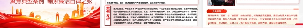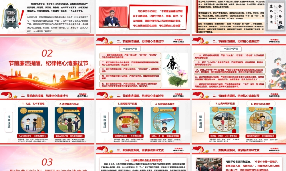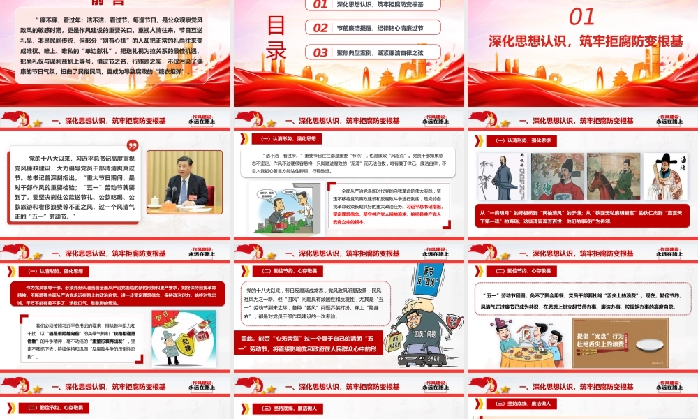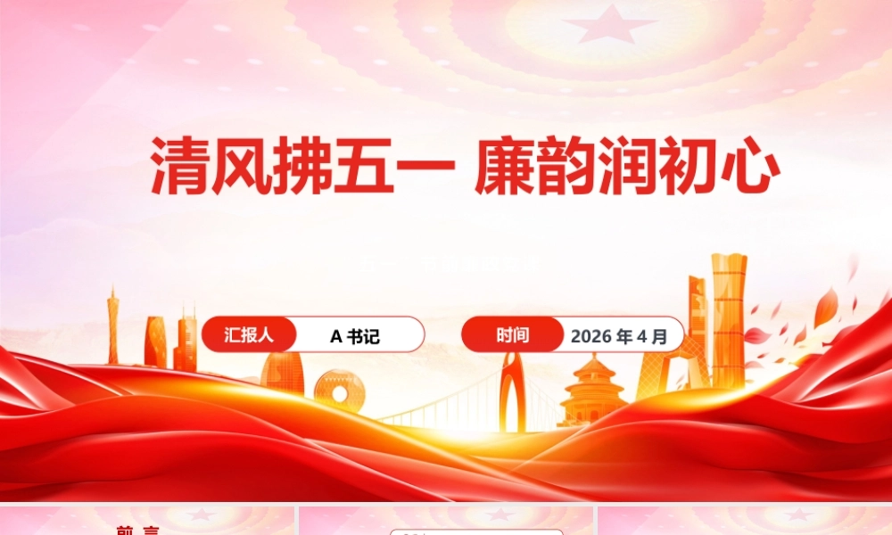 汇报人A 书记时间2026 年 4 月“ 五一”节前廉政党课清风拂五一 廉韵润初心前 言 “ 廉不廉,看过年;洁不洁,看过节。每逢节日,是公众观察党风政风的敏感时期,更是作风建设的重要关口。重视人情往来,节日互送礼品,本是民间传统,但部分“别有心机”的人却把正常的礼尚往来变成唯权、唯上、唯私的“单边献礼”,把送礼视为拉关系的最佳机遇,把尚礼仪与谋利益划上等号,借过节之名,行贿赂之实,不仅污染了健康的节日气氛,扭曲了民俗民风,更成为导致腐败的“糖衣炮弹”。目录深化思想认识,筑牢拒腐防变根基01节前廉洁提醒,纪律铭心清廉过节0203 聚焦典型案例,绷紧廉洁自律之弦01深化思想认识,筑牢拒腐防变根基一、深化思想认识,筑牢拒腐防变根基 党的十八大以来,习近平总书记高度重视党风廉政建设,大力倡导党员干部清清爽爽过节。总书记曾深刻指出,“重大节日期间,是对干部作风的重要检验;“五一”劳动节就要到了,要坚决刹住公款送节礼、公款吃喝、公款旅游和奢侈浪费等不正之风,过一个风清气正的“五一”劳动节。”一、深化思想认识,筑牢拒腐防变根基全面从严治党是新时代党的自我革命的伟大实践,坚定不移将党风廉政建设和反腐败斗争进行到底,是党的自我革命必须长期抓好的重大政治任务。习近平总书记指出,坚定理想信念,坚守共产党人精神追求,始终是共产党人安身立命的根本。“ 洁不洁,看过节。”重要节日往往都是重要“节点”,也是廉政“风险点”。党员干部如果意志不坚定、作风不过硬很容易将一只脚踏进腐败的“泥潭”而无法自拔,唯有廉于律己、廉洁自律,不忘入党初心誓言方能站住脚跟、行稳致远。(一)认清形势,强化思想一、深化思想认识,筑牢拒腐防变根基从“一肩明月”的郑板桥到“两袖清风”的于谦;从“铁面无私廉明断案”的狄仁杰到“直言天下第一疏”的海瑞;这些清官流芳百世,他们的事迹广为传颂。(一)认清形势,强化思想一、深化思想认识,筑牢拒腐防变根基我们必须按照习近平总书记的要求,排除各种阻力和干扰,以“越是艰险越向前”的英雄气概和“狭路相逢勇者胜”的斗争精神,毫不动摇的“重整行装再出发”,坚定不移抓下去,持续保持和巩固“反腐败斗争的压倒性态势”。作为党员领导干部,必须充分认清当前全面从严治党面临的新的形势和更严要求,始终保持自我革命精神,不断增强全面从严治党永远在路上的政治自觉,进一步坚定理想信念,保持政治定力,始终对党忠诚,千万不能有差不多了,该松口气、歇歇脚的想法。(一)认清形势,强化思想一、深化思想认识,筑牢拒腐防变根基(二)勤俭节约,心存敬畏 党的十八大以来,节日反腐渐成常态,党风政风明显改善,民风社风为之一新。但“四风”问题具有顽固性和反复性,尤其是“五一”劳动节到来之际,各种“四风”问题乔装打扮、穿上“隐身衣”,都是对党员干部作风建设的一次考验。因此,能否“心无旁骛”过一个属于自己的清朗“五一”劳动节,将直接影响党和政府在人民群众心中的形象。一、深化思想认识,筑牢拒腐防变根基“ 五一”劳动节团圆,免不了聚会用餐,党员干部要杜绝“舌尖上的浪费”。现在,勤俭节约、风清气正过廉节已成为共识,在思想上树立起节俭办事、廉洁办事、按规矩办事的高度自觉。(二)勤俭节约,心存敬畏一、深化思想认识,筑牢拒腐防变根基(二)勤俭节约,心存敬畏我们要高度警觉,要珍惜自己的岗位和前途,在如何对待权力这个重要问题上想清楚、想正确、有敬畏,始终怀有如履薄冰、如临深渊的敬畏之心,审慎用好权力,不能因为一念之差,一失足成千古恨。以明月为镜,时刻提醒自身应该具备廉洁奉公的品质,时刻保持廉洁之心,不能让传统节日蒙上灰色“外衣”,成为一些居心叵测之人的腐败工具。要在润物细无声的方式中自觉遵守工作纪律和廉洁纪律,争做廉洁过节的宣传者、引领者,发挥榜样的力量,让“廉洁过节”成为人人自觉、人人遵守的“新常态”。一、深化思想认识,筑牢拒腐防变根基(三)坚持底线,廉洁做人党的纪律建设是党的建设的重要内容,廉洁纪律是党的纪律的重要组成部分。《准则》紧扣廉洁自律主题,集中展现了共产党人的...