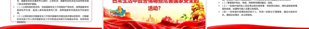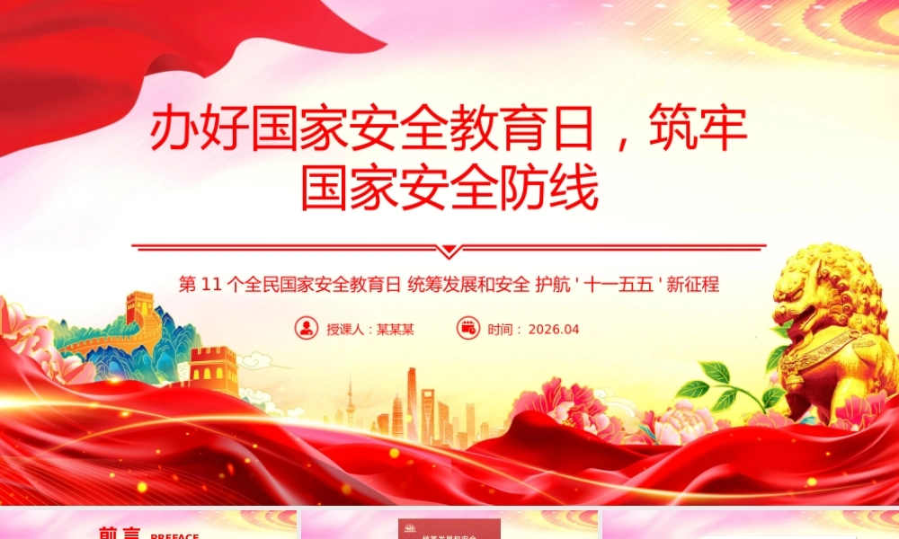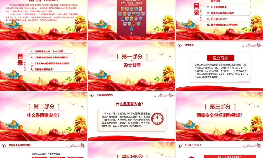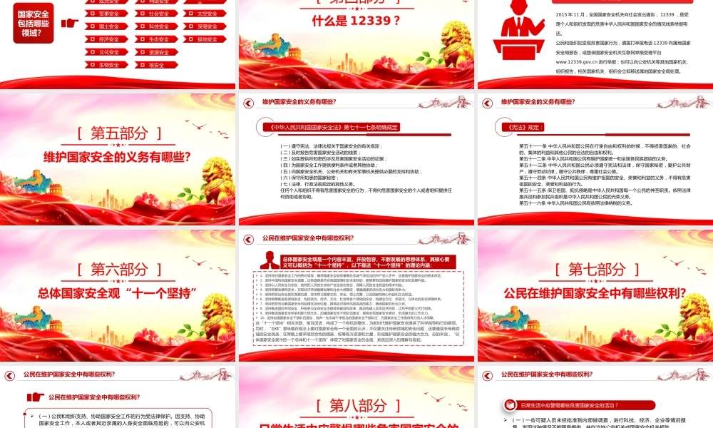 办好国家安全教育日,筑牢国家安全防线授课人:某某某时间: 2026.04第 11 个全民国家安全教育日 统筹发展和安全 护航 ' 十一五五 ' 新征程 你是否认为国家安全只是军人和政府的职责?你是否觉得网络谣言、数据泄露与自己的生活毫无关联?当有人问起“国家安全是什么”,你的脑海中是否只有军事防御与领土完整的画面?实际上,国家安全远不止这些,它涵盖了我们生活的方方面面。 2026 年 4 月 15 日,我们将迎来第十一个全民国家安全教育日,今年的主题是“统筹发展和安全 护航 ' 十一五五 ' 新征程”。国家安全不仅是国家的基石,更与每个人的生活息息相关,让我们共同学习国家安全知识,强化责任意识,用行动守护家园的安宁。前 言 PREFACE目录CONTENTS一、设立背景二、什么是国家安全?三、国家安全包括哪些领域?四、什么是 12339 ?五、维护国家安全的义务有哪些?目录CONTENTS六、总体国家安全观“十一个坚持”七、公民在维护国家安全中有哪些权利?八、日常生活中应警惕哪些危害国家安全的活动?九、如何维护国家安全?设立背景[ 第一部分 ]设立背景全民国家安全教育日是为了增强全民国家安全意识,维护国家安全而设立的节日。 2015 年 7 月 1 日,第十一二届全国人民代表大会常务委员会第十一五次会议通过《中华人民共和国国家安全法》,其中规定每年 4 月 15日为全民国家安全教育日。设立背景什么是国家安全?[ 第二部分 ]什么是国家安全?什么是国家安全?2015 年 7 月 1 日施行的《中华人民共和国国家安全法》明确指出:国家安全是指国家政权、主权统一和领土完整、人民福祉、经济社会可持续发展和国家其他重大利益相对处于没有危险和不受内外威胁的状态,以及保障持续安全状态的能力。国家安全包括哪些领域?[ 第三部分 ]国家安全包括哪些领域?国家安全包括哪些领域?政治安全国家安全涉及的 16 个重点领域包括:军事安全国土安全经济安全网络安全社会安全科技安全生态安全文化安全生物安全资源安全核安全海外利益安全太空安全深海安全极地安全什么是 12339 ?[ 第四部分 ]什么是 12339 ?2015 年 11 月,全国国家安全机关向社会发出通告, 12339 ,是受理个人和组织发现的危害中华人民共和国国家安全的情况线索举报电话。公民和组织如发现危害国家行为,请拨打举报电话 12339 向属地国家安全局报告;或登录国家安全机关互联网举报受理平台www.12339.gov.cn 进行举报;也可以向公安机关等其他国家机关、组织报告,相关国家机关、组织会立即移送属地国家安全局处理。0 5 什 么 是 1 2 3 3 9 ?维护国家安全的义务有哪些?[ 第五部分 ]维护国家安全的义务有哪些?《中华人民共和国国家安全法》第七十一七条明确规定:( 一 ) 遵守宪法、法律法规关于国家安全的有关规定;( 二 ) 及时报告危害国家安全活动的线索;( 三 ) 如实提供所知悉的涉及危害国家安全活动的证据;( 四 ) 为国家安全工作提供便利条件或者其他协助;( 五 ) 向国家安全机关、公安机关和有关军事机关提供必要的支持和协助;( 六 ) 保守所知悉的国家秘密;( 七 ) 法律、行政法规规定的其他义务。任何个人和组织不得有危害国家安全的行为,不得向危害国家安全的个人或者组织提供任何资助或者协助。维护国家安全的义务有哪些?《宪法》规定:第五十一一条 中华人民共和国公民在行使自由和权利的时候,不得损害国家的、社会的、集体的利益和其他公民的合法的自由和权利。第五十一二条 中华人民共和国公民有维护国家统一和全国各民族团结的义务。第五十一三条 中华人民共和国公民必须遵守宪法和法律,保守国家秘密,爱护公共财产,遵守劳动纪律,遵守公共秩序,尊重社会公德。第五十一四条 中华人民共和国公民有维护祖国的安全、荣誉和利益的义务,不得有危害祖国的安全、荣誉和利益的行为。第五十一五条 保卫祖国、抵抗侵略是中华人民共和国每一个公民的神圣职责。依照法律服兵役和参加民兵组织是中华人民共和国公民的光荣义务。第五十一六条 中华人民共和国公民有依...