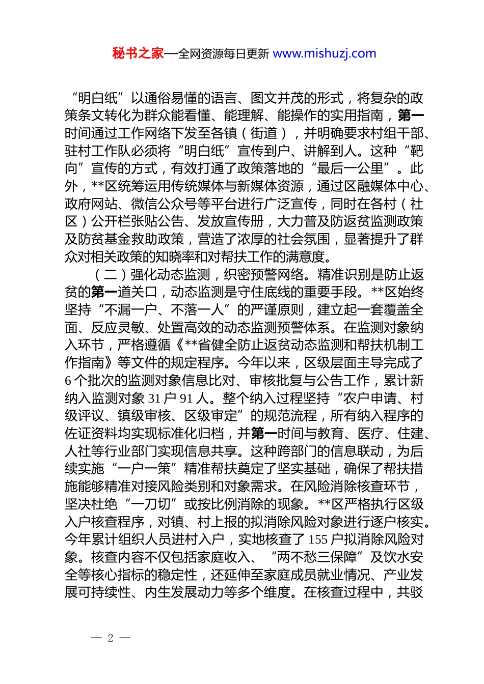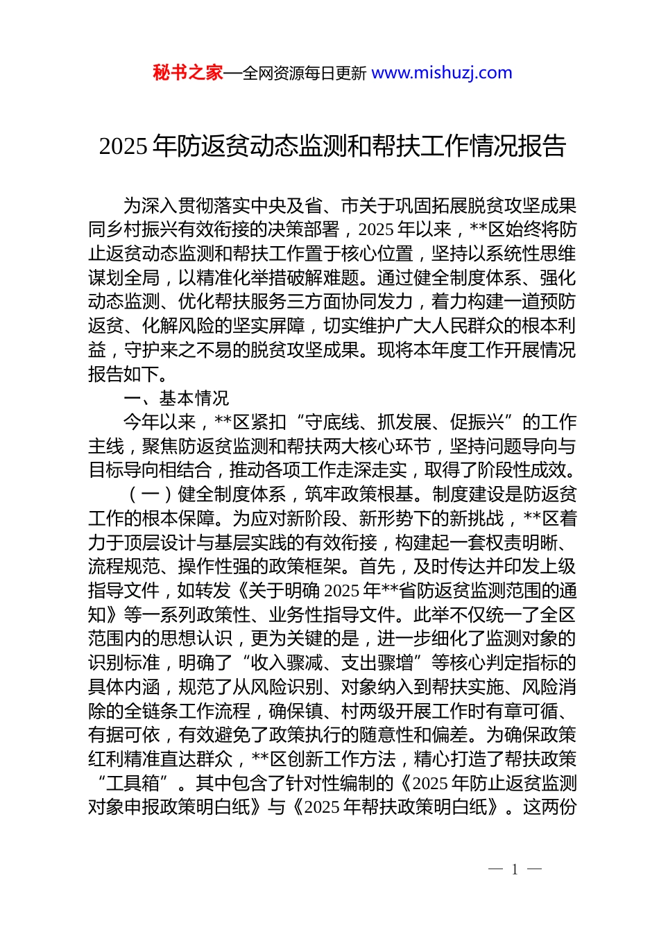 秘书之家—全网资源每日更新 www.mishuzj.com2025 年防返贫动态监测和帮扶工作情况报告为深入贯彻落实中央及省、市关于巩固拓展脱贫攻坚成果同乡村振兴有效衔接的决策部署,2025 年以来,**区始终将防止返贫动态监测和帮扶工作置于核心位置,坚持以系统性思维谋划全局,以精准化举措破解难题。通过健全制度体系、强化动态监测、优化帮扶服务三方面协同发力,着力构建一道预防返贫、化解风险的坚实屏障,切实维护广大人民群众的根本利益,守护来之不易的脱贫攻坚成果。现将本年度工作开展情况报告如下。一、基本情况今年以来,**区紧扣“守底线、抓发展、促振兴”的工作主线,聚焦防返贫监测和帮扶两大核心环节,坚持问题导向与目标导向相结合,推动各项工作走深走实,取得了阶段性成效。(一)健全制度体系,筑牢政策根基。制度建设是防返贫工作的根本保障。为应对新阶段、新形势下的新挑战,**区着力于顶层设计与基层实践的有效衔接,构建起一套权责明晰、流程规范、操作性强的政策框架。首先,及时传达并印发上级指导文件,如转发《关于明确 2025 年**省防返贫监测范围的通知》等一系列政策性、业务性指导文件。此举不仅统一了全区范围内的思想认识,更为关键的是,进一步细化了监测对象的识别标准,明确了“收入骤减、支出骤增”等核心判定指标的具体内涵,规范了从风险识别、对象纳入到帮扶实施、风险消除的全链条工作流程,确保镇、村两级开展工作时有章可循、有据可依,有效避免了政策执行的随意性和偏差。为确保政策红利精准直达群众,**区创新工作方法,精心打造了帮扶政策“工具箱”。其中包含了针对性编制的《2025 年防止返贫监测对象申报政策明白纸》与《2025 年帮扶政策明白纸》。这两份— 1 —秘书之家—全网资源每日更新 www.mishuzj.com“明白纸”以通俗易懂的语言、图文并茂的形式,将复杂的政策条文转化为群众能看懂、能理解、能操作的实用指南,第一时间通过工作网络下发至各镇(街道),并明确要求村组干部、驻村工作队必须将“明白纸”宣传到户、讲解到人。这种“靶向”宣传的方式,有效打通了政策落地的“最后一公里”。此外,**区统筹运用传统媒体与新媒体资源,通过区融媒体中心、政府网站、微信公众号等平台进行广泛宣传,同时在各村(社区)公开栏张贴公告、发放宣传册,大力普及防返贫监测政策及防贫基金救助政策,营造了浓厚的社会氛围,显著提升了群众对相关政策的知晓率和对帮扶工作的满意度。(二)强化动态监测,织密预警网络。精准识别是防止返贫的第一道关口,动态监测是守住底线的重要手段。**区始终坚持“不漏一户、不落一人”的严谨原则,建立起一套覆盖全面、反应灵敏、处置高效的动态监测预警体系。在监测对象纳入环节,严格遵循《**省健全防止返贫动态监测和帮扶机制工作指南》等文件的规定程序。今年以来,区级层面主导完成了6 个批次的监测对象信息比对、审核批复与公告工作,累计新纳入监测对象 31 户 91 人。整个纳入过程坚持“农户申请、村级评议、镇级审核、区级审定”的规范流程,所有纳入程序的佐证资料均实现标准化归档,并第一时间与教育、医疗、住建、人社等行业部门实现信息共享。这种跨部门的信息联动,为后续实施“一户一策”精准帮扶奠定了坚实基础,确保了帮扶措施能够精准对接风险类别和对象需求。在风险消除核查环节,坚决杜绝“一刀切”或按比例消除的现象。**区严格执行区级入户核查程序,对镇、村上报的拟消除风险对象进行逐户核实。今年累计组织人员进村入户,实地核查了 155 户拟消除风险对象。核查内容不仅包括家庭收入、“两不愁三保障”及饮水安全等核心指标的稳定性,还延伸至家庭成员就业情况、产业发展可持续性、内生发展动力等多个维度。在核查过程中,共驳— 2 —秘书之家—全网资源每日更新 www.mishuzj.com回了 9 户因风险尚未稳定消除或基础条件仍不稳固而不符合条件的拟消除风险监测户,牢牢守住了风险消除的质量关口和“最后一道屏障”。为实现风险隐患的早发现、早干预、早化解,**区着力畅通了上下联动、横向互通的监测预警体系。今年以来,通过数据比对,累计收集并处理了市...