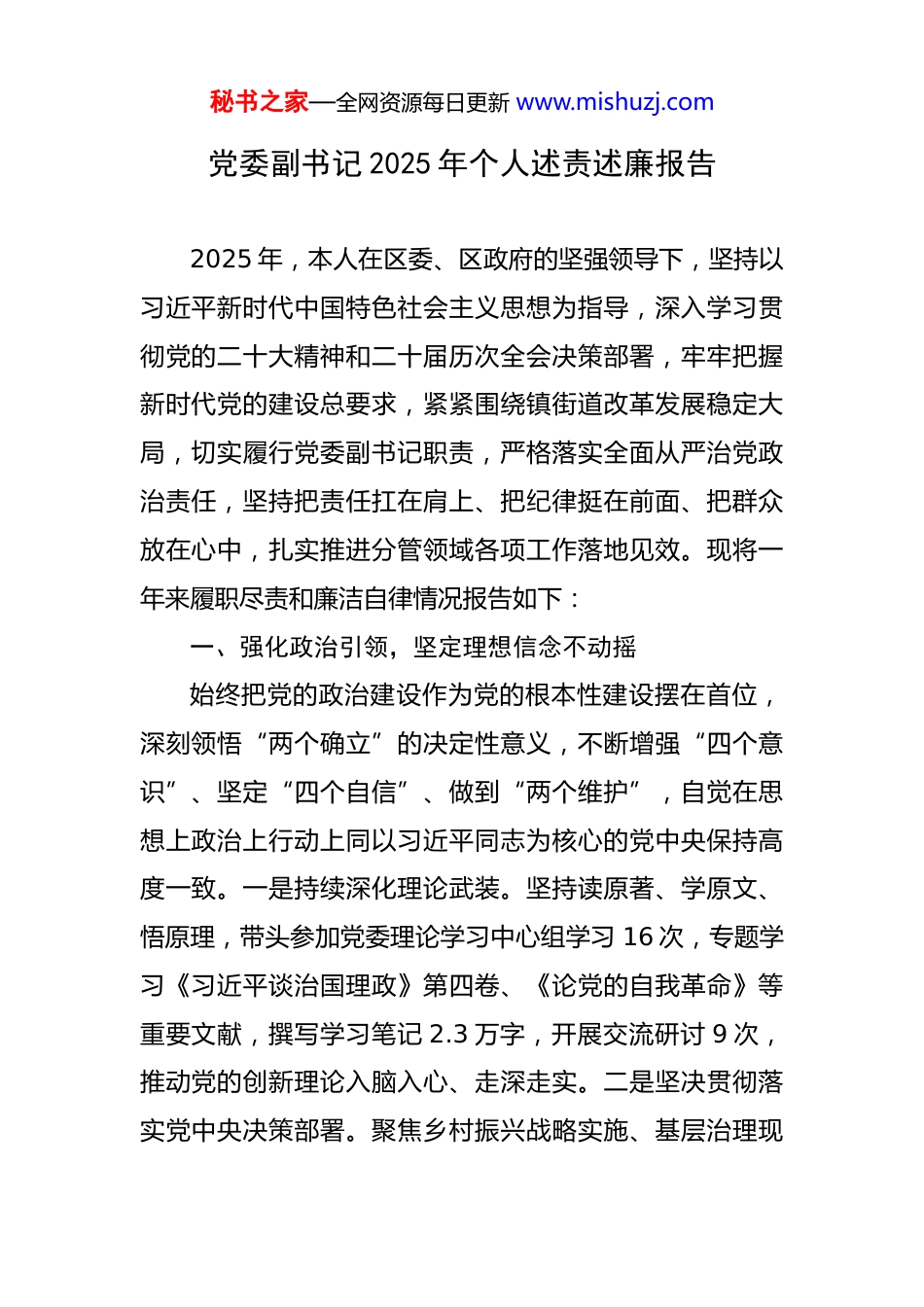 秘书之家—全网资源每日更新 www.mishuzj.com党委副书记 2025 年个人述责述廉报告 2025 年,本人在区委、区政府的坚强领导下,坚持以习近平新时代中国特色社会主义思想为指导,深入学习贯彻党的二十大精神和二十届历次全会决策部署,牢牢把握新时代党的建设总要求,紧紧围绕镇街道改革发展稳定大局,切实履行党委副书记职责,严格落实全面从严治党政治责任,坚持把责任扛在肩上、把纪律挺在前面、把群众放在心中,扎实推进分管领域各项工作落地见效。现将一年来履职尽责和廉洁自律情况报告如下:一、强化政治引领,坚定理想信念不动摇始终把党的政治建设作为党的根本性建设摆在首位,深刻领悟“两个确立”的决定性意义,不断增强“四个意识”、坚定“四个自信”、做到“两个维护”,自觉在思想上政治上行动上同以习近平同志为核心的党中央保持高度一致。一是持续深化理论武装。坚持读原著、学原文、悟原理,带头参加党委理论学习中心组学习 16 次,专题学习《习近平谈治国理政》第四卷、《论党的自我革命》等重要文献,撰写学习笔记 2.3 万字,开展交流研讨 9 次,推动党的创新理论入脑入心、走深走实。二是坚决贯彻落实党中央决策部署。聚焦乡村振兴战略实施、基层治理现秘书之家—全网资源每日更新 www.mishuzj.com代化、民生保障提质增效等重点工作,主动对标对表中央一号文件精神和省委、市委、区委工作安排,牵头制定《镇街道党建引领基层治理三年行动计划》《农村人居环境整治提升实施方案》等政策文件 6 项,组织召开专题推进会 14 次,确保上级各项部署在基层见行见效。三是严守政治纪律和政治规矩。严格执行重大事项请示报告制度,全年向党委会汇报重点工作进展 18 次,涉及干部任免、项目资金、信访维稳等重大事项均按规定程序报批。个人有关事项变化情况及时如实报告,未出现迟报漏报现象,切实做到令行禁止、步调一致。二、聚焦主责主业,全面提升履职效能紧扣镇党委分工安排,立足党委副书记岗位职责,统筹推进党的建设、社会治理、民生服务、平安建设等重点任务,努力实现高质量发展与高效能治理协同并进。(一)在夯实基层组织基础方面下功夫。牢固树立“大抓基层、大抓支部”的鲜明导向,深入实施“红色领航·强基提质”工程。一是推进党支部标准化规范化建设。指导完成辖区 18 个村(社区)党组织换届“回头看”评估工作,针对发现的问题建立整改台账,整顿转化软弱涣散基层党组织 2 个,新建小区党支部 7 个、商圈联合党支部 3个,推动党组织覆盖率提升至 98.6%,实现有形覆盖与有秘书之家—全网资源每日更新 www.mishuzj.com效覆盖相统一。二是深化党建引领基层治理实践。推广“党员楼长+网格员+志愿者”三位一体联动机制,在 32个居民小区设立党员先锋岗,组建党员志愿服务队 45 支,累计开展环境整治、助老扶幼、矛盾调解等服务活动 560余场次,解决群众急难愁盼问题 370 余件,群众获得感、幸福感显著增强。三是加强党员教育管理监督。严格落实“三会一课”、主题党日等制度,全年组织开展集中学习培训 12 轮次,举办入党积极分子和发展对象培训班 2 期,发展党员 23 名,其中 35 岁以下青年占比达 65%,党员队伍结构进一步优化,先锋模范作用更加凸显。(二)在推动重点任务落实方面勇担当。坚持靠前指挥、一线作战,全力保障中心工作有序推进。一是助力乡村振兴战略纵深推进。牵头组织实施农村人居环境整治提升五年行动,完成农村改厕 1200 户,新建村级文化广场 6处、健身步道 3.2 公里,打造美丽乡村示范点 3 个,村容村貌焕然一新。协调争取财政资金 800 余万元用于农田水利设施建设,改善灌溉面积 1.2 万亩,有效提升农业综合生产能力。二是积极参与平安法治建设。健全完善“一站式”矛盾纠纷多元化解平台,整合司法所、派出所、综治办等力量,推动建立“老书记调解室”“乡贤评理堂”等特色品牌,全年调处邻里纠纷、土地争议、家庭矛盾等案秘书之家—全网资源每日更新 www.mishuzj.com件 156 起,调解成功率达 97.4%。辖区信访总量同比下降21%,无进京赴省越级访事件发生,社会大局保持和...