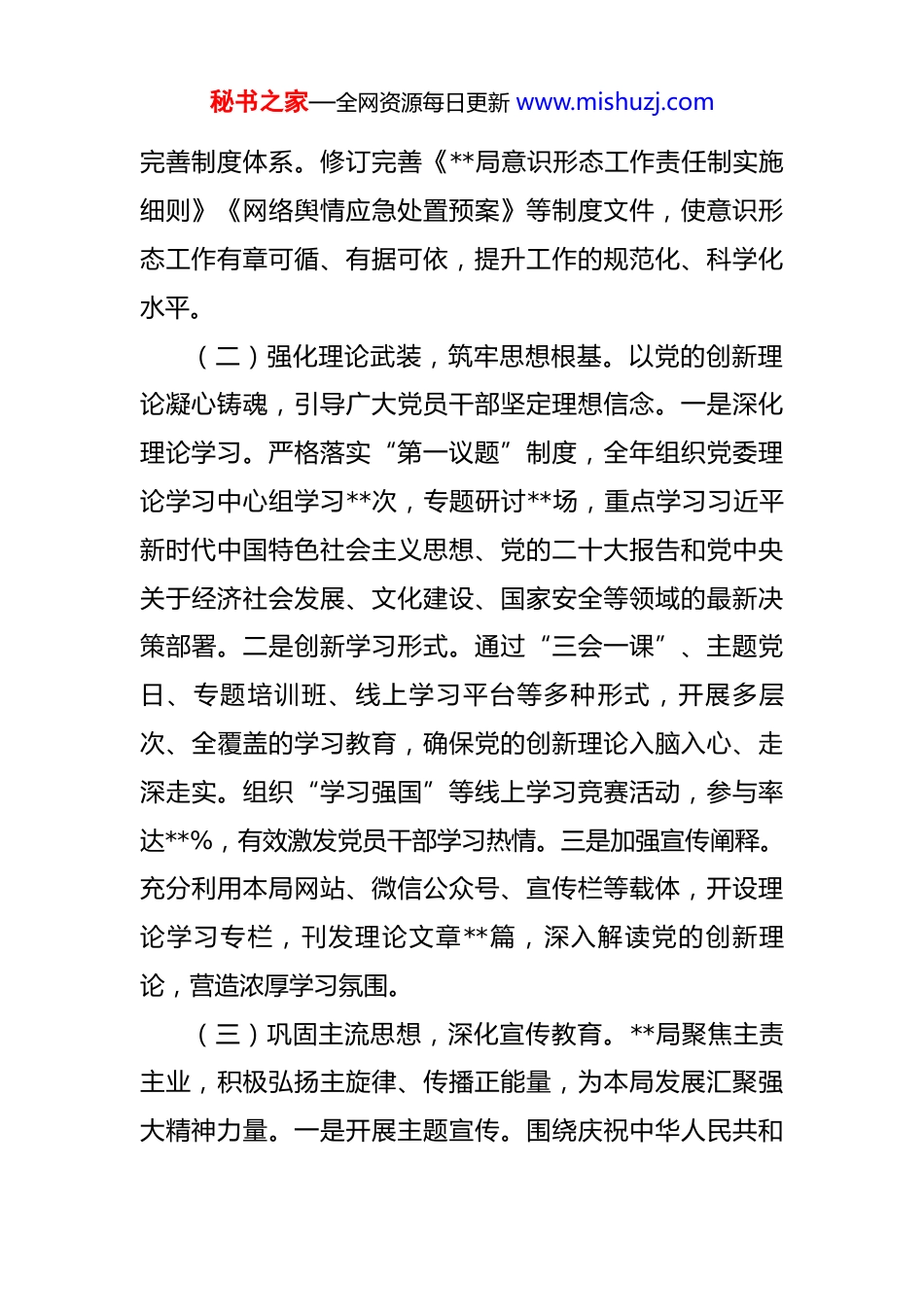 秘书之家—全网资源每日更新 www.mishuzj.com局 2025 年度意识形态和网络意识形态工作情况报告 2025 年,**局坚持以习近平新时代中国特色社会主义思想为指导,全面贯彻落实党的二十大精神和习近平总书记关于意识形态工作的重要论述,牢牢把握党对意识形态工作的领导权和主动权,紧密结合本局职能定位和实际情况,扎实推进意识形态和网络意识形态各项工作。一年来,全局上下思想政治基础不断巩固,主流思想舆论持续壮大,网络空间日益清朗,为本局各项事业高质量发展提供了坚实的思想保障和强大的精神动力。一、工作情况(一)压实主体责任,健全工作机制。**局党委始终将意识形态工作摆在全局工作的重要位置,严格落实意识形态工作责任制。一是健全领导机制。党委定期召开专题会议,研究部署意识形态工作,将意识形态工作纳入年度工作要点、领导班子成员职责清单和干部考核评价体系,做到同部署、同落实、同检查、同考核。二是明确责任分工。建立健全党委统一领导、党政齐抓共管、宣传部门牵头协调、各部门协同配合的工作格局,层层传导压力,确保责任到岗到人,形成全员抓意识形态工作的合力。三是秘书之家—全网资源每日更新 www.mishuzj.com完善制度体系。修订完善《**局意识形态工作责任制实施细则》《网络舆情应急处置预案》等制度文件,使意识形态工作有章可循、有据可依,提升工作的规范化、科学化水平。(二)强化理论武装,筑牢思想根基。以党的创新理论凝心铸魂,引导广大党员干部坚定理想信念。一是深化理论学习。严格落实“第一议题”制度,全年组织党委理论学习中心组学习**次,专题研讨**场,重点学习习近平新时代中国特色社会主义思想、党的二十大报告和党中央关于经济社会发展、文化建设、国家安全等领域的最新决策部署。二是创新学习形式。通过“三会一课”、主题党日、专题培训班、线上学习平台等多种形式,开展多层次、全覆盖的学习教育,确保党的创新理论入脑入心、走深走实。组织“学习强国”等线上学习竞赛活动,参与率达**%,有效激发党员干部学习热情。三是加强宣传阐释。充分利用本局网站、微信公众号、宣传栏等载体,开设理论学习专栏,刊发理论文章**篇,深入解读党的创新理论,营造浓厚学习氛围。(三)巩固主流思想,深化宣传教育。**局聚焦主责主业,积极弘扬主旋律、传播正能量,为本局发展汇聚强大精神力量。一是开展主题宣传。围绕庆祝中华人民共和秘书之家—全网资源每日更新 www.mishuzj.com国成立**周年、学习贯彻党的二十届*中全会精神等重大时间节点和主题,精心组织系列宣传教育活动,举办专题讲座**场次,编印宣传资料**份,唱响时代主旋律。二是加强典型选树。深入挖掘本局在推动高质量发展、服务民生、科技创新等方面的先进典型和感人事迹,评选“**之星”**名,通过局内媒体平台广泛宣传,发挥榜样引领作用,激励干部职工担当作为、奋发有为。三是丰富文化活动。组织开展“翰墨飘香”书画展、“健步走”健身活动、读书分享会等形式多样的文化体育活动**场次,丰富干部职工精神文化生活,增强集体凝聚力和向心力。(四)创新载体形式,提升传播效能。紧跟时代步伐,积极探索意识形态工作的新方法新路径。一是构建全媒体传播格局。充分利用传统媒体和新媒体平台,形成报纸、网站、微信公众号、短视频等多平台协同发力的传播矩阵,提升信息发布和舆论引导能力。本局微信公众号年均发布推文**篇,总阅读量突破**万次。二是运用新科技手段。积极运用大数据、云计算等技术,提升意识形态工作的精准性、实效性。探索利用 VR/AR 技术开展沉浸式党史学习教育,提升学习的趣味性和感染力。三是加强对外交流合作。与**媒体、**智库等机构开展合作,共同策划制作**部宣传片,扩大本局的社会影响力,讲好本局故秘书之家—全网资源每日更新 www.mishuzj.com事、传播本局声音。二、工作特点(一)坚持管网治网,净化网络空间。**局始终将网络意识形态工作作为意识形态工作的重中之重,坚持依法治网、科学管网。一是健全网络管理制度。完善网络信息发布审核机制、网络安全管理制度,对本局所属网站、新媒体平台的内容发布实行严格把关,确保...