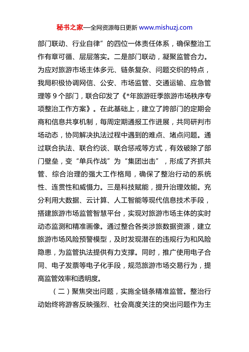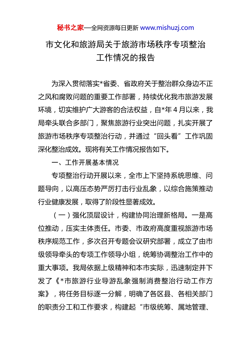 秘书之家—全网资源每日更新 www.mishuzj.com市文化和旅游局关于旅游市场秩序专项整治工作情况的报告 为深入贯彻落实*省委、省政府关于整治群众身边不正之风和腐败问题的重要工作部署,持续优化我市旅游发展环境,切实维护广大游客的合法权益,自*年 4 月以来,我局牵头联合多部门,聚焦旅游行业突出问题,扎实开展了旅游市场秩序专项整治行动,并通过“回头看”工作巩固深化整治成效。现将有关工作情况报告如下。一、工作开展基本情况专项整治行动开展以来,全市上下坚持系统思维、问题导向,以高压态势严厉打击行业乱象,以综合施策推动行业健康发展,取得了阶段性显著成效。(一)强化顶层设计,构建协同治理新格局。一是高位推动,压实主体责任。市委、市政府高度重视旅游市场秩序规范工作,多次召开专题会议研究部署,成立了由市级领导牵头的专项工作领导小组,统筹协调整治工作中的重大事项。我局依据上级精神和本市实际,迅速制定并下发了《*市旅游行业导游乱象强制消费整治行动工作方案》,将任务目标逐一分解,明确了各区县、各相关部门的职责分工和工作要求,构建起“市级统筹、属地管理、秘书之家—全网资源每日更新 www.mishuzj.com部门联动、行业自律”的四位一体责任体系,确保整治工作有章可循、层层落实。二是部门联动,凝聚监管合力。为应对旅游市场主体多元、链条复杂、问题交织的特点,我局积极协调网信、公安、市场监管、交通运输、应急管理等 9 个部门,联合印发了《*年旅游旺季旅游市场秩序专项整治工作方案》。在此基础上,建立了跨部门的定期会商和信息共享机制,每周定期通报工作进展,共同研判市场动态,协同解决执法过程中遇到的难点、堵点问题。通过联合执法、联合约谈、联合惩戒等方式,有效破除了部门壁垒,变“单兵作战”为“集团出击”,形成了齐抓共管、综合治理的强大工作格局,确保了整治行动的系统性、连贯性和威慑力。三是科技赋能,提升治理效能。充分利用大数据、云计算、人工智能等现代信息技术手段,搭建旅游市场监管智慧平台,实现对旅游市场主体的实时动态监测和精准画像。通过整合各类涉旅数据资源,建立旅游市场风险预警模型,及时发现潜在的违规行为和风险隐患,为监管执法提供有力支撑。同时,推广使用电子合同、电子发票等电子化手段,规范旅游市场交易行为,提高监管效率和透明度。(二)聚焦突出问题,实施全链条精准监管。整治行动始终将游客反映强烈、社会高度关注的突出问题作为主秘书之家—全网资源每日更新 www.mishuzj.com攻方向,实施全方位、全链条的精准打击。一是以关键环节为切入点,开展“拉网式”排查。行动期间,组织开展了 5 次大规模的多部门联合执法检查行动。执法队伍深入一线,对全市范围内的旅行社及其分支机构、旅游购物店、签约餐馆、景区景点、涉水旅游船只等关键经营主体进行“过筛式”排查。在排查过程中,共出动执法人员324 人次,检查旅行社 200 余家、导游 65 人。检查内容覆盖了从产品设计、宣传招徕到合同签订、行程安排、导游服务、购物及自费项目等旅游服务的全过程,确保监管无死角、无盲区。二是以核心乱象为打击重点,提升执法精准度。行动重点聚焦“不合理低价游”及其衍生的强制或变相强制消费问题。执法人员通过核查旅游团队电子行程单、检查旅游合同、倒查旅行社财务账目等方式,深挖通过“零负团费”组织旅游活动、未经游客同意安排购物或另行付费项目、导游在执业过程中索要小费、诱导欺骗游客消费等违法违规行为。同时,对导游的执业资质、佩证上岗情况、讲解服务规范性等进行了严格审查,有力震慑了心存侥幸的从业者,从源头上遏制了市场乱象的滋生蔓延。三是以典型案例为警示震慑,强化行业自律意识。针对排查和执法过程中发现的突出问题,及时梳理汇总形成典型案例库,通过召开行业警示教育大会、发布旅游消秘书之家—全网资源每日更新 www.mishuzj.com费提示等方式,公开曝光一批违法违规企业和从业人员名单,详细剖析其违法事实、处罚依据及整改要求。同时,组织全市旅游企业开展自查自纠活动,签订诚信经营承诺书,引导企业自觉遵守法律法规和行业规范,主动...