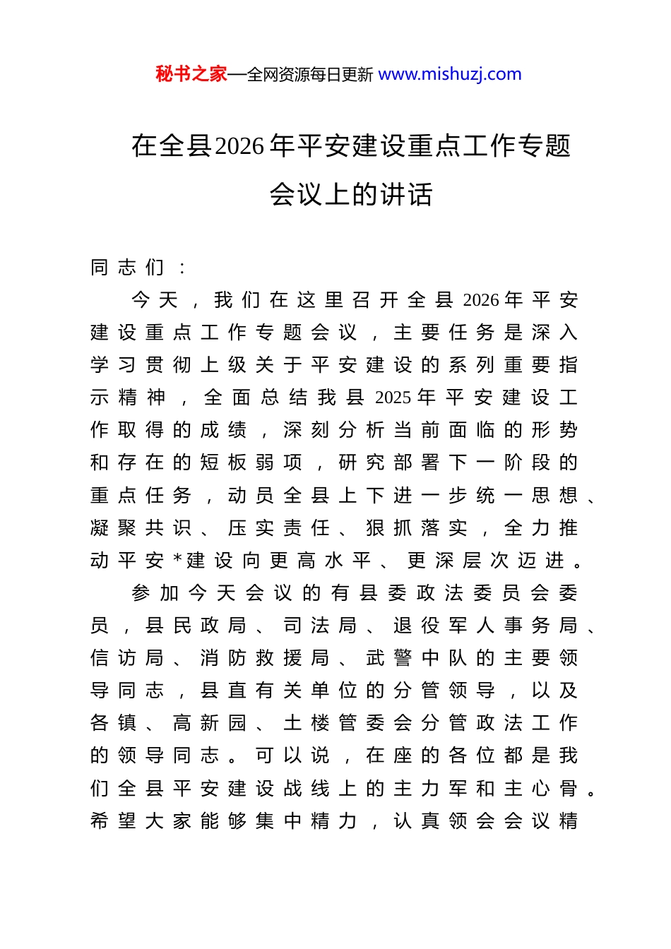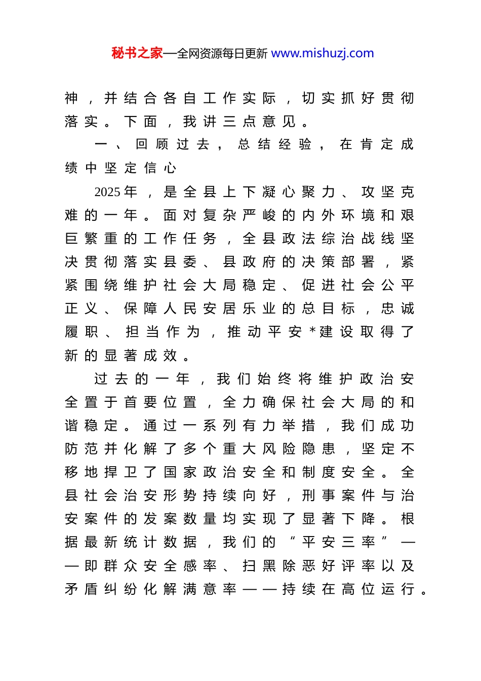 秘书之家—全网资源每日更新 www.mishuzj.com在全县2026 年平安建设重点工作专题会议上的讲话 同 志 们 :今 天 , 我 们 在 这 里 召 开 全 县 2026 年 平 安建 设 重 点 工 作 专 题 会 议 , 主 要 任 务 是 深 入学 习 贯 彻 上 级 关 于 平 安 建 设 的 系 列 重 要 指示 精 神 , 全 面 总 结 我 县 2025 年 平 安 建 设 工作 取 得 的 成 绩 , 深 刻 分 析 当 前 面 临 的 形 势和 存 在 的 短 板 弱 项 , 研 究 部 署 下 一 阶 段 的重 点 任 务 , 动 员 全 县 上 下 进 一 步 统 一 思 想 、凝 聚 共 识 、 压 实 责 任 、 狠 抓 落 实 , 全 力 推动 平 安 * 建 设 向 更 高 水 平 、 更 深 层 次 迈 进 。参 加 今 天 会 议 的 有 县 委 政 法 委 员 会 委员 , 县 民 政 局 、 司 法 局 、 退 役 军 人 事 务 局 、信 访 局 、 消 防 救 援 局 、 武 警 中 队 的 主 要 领导 同 志 , 县 直 有 关 单 位 的 分 管 领 导 , 以 及各 镇 、 高 新 园 、 土 楼 管 委 会 分 管 政 法 工 作的 领 导 同 志 。 可 以 说 , 在 座 的 各 位 都 是 我们 全 县 平 安 建 设 战 线 上 的 主 力 军 和 主 心 骨 。希 望 大 家 能 够 集 中 精 力 , 认 真 领 会 会 议 精秘书之家—全网资源每日更新 www.mishuzj.com神 , 并 结 合 各 自 工 作 实 际 , 切 实 抓 好 贯 彻落 实 。 下 面 , 我 讲 三 点 意 见 。一 、 回 顾 过 去 , 总 结 经 验 , 在 肯 定 成绩 中 坚 定 信 心2025 年 , 是 全 县 上 下 凝 心 聚 力 、 攻 坚 克难 的 一 年 。 面 对 复 杂 严 峻 的 内 外 环 境 和 艰巨 繁 重 的 工 作 任 务 , 全 县 政 法 综 治 战 线 坚决 贯 彻 落 实 县 委 、 县 政 府 的 决 策 部 署 , 紧紧 围 绕 维 护 社 会 大 局 稳 定 、 促 进 社 会 公 平正 义 、 保 障 人 民 安 居 乐 业 的 总 目 标 , 忠 诚履 职 、 担 当 作 为 , 推 动 平 安 * 建 设 取 得 了新 的 显 著 成 效 。过 去 的 一 年 , 我 们 始 终 将 维 护 政 治 安全 置 于 首 要 位 置 , 全 力 确 保 社 会 大 局 的 和谐 稳 定 。 通 过 一 系 列 有 力 举 措 , 我 们 成 功防 范 并 化 解 了 多 个 重 大 风 险 隐 患 , 坚 定 不移 地 捍 卫 了 国 家 政 治 安 全 和 制 度 安 全 。 全县 社 会 治 安 形 势 持 续 向 好 , 刑 事 案 件 与 治安 案 件 的 发 案 数 量 均 实 现 了 显 著 下 降 。 根据 最 新 统 计 数 据 , 我 们 的 “ 平 安 三 率 ” —— 即 群 众 安 全 感 率 、 扫 黑 除 恶 好 评 率 以 及矛 盾 纠 纷 化 解 满 意 率 — — 持 续 在 高 位 运 行 。秘书之家—全网资源每日更新 www.mishuzj.com其 中 , 群 众 安 全 感 率 已 超 过 99% , 这 充 分体 现 了 广 大 人 民 群 众 对 我 们 工 作 的 广 泛 认可 与 高 度 肯 定 。 过 去 的 一 年 , 我 们 聚 焦 于影 响 群 众 安 全 感 的 突 出 问 题 , 推 动 专 项 治理 取 得 了 扎 实 成 效 。 我 们 坚 持 问 题 导 向 ,针 对 人 民 群 众 反 映 强 烈 的 电 信 网 络 诈 骗 、道 路 交 通 安 全 以 及 社 会 矛 盾 纠 纷 等 难 点 ,组 织 开 展 了 多 轮 专 项 整 治 行 动 。...
