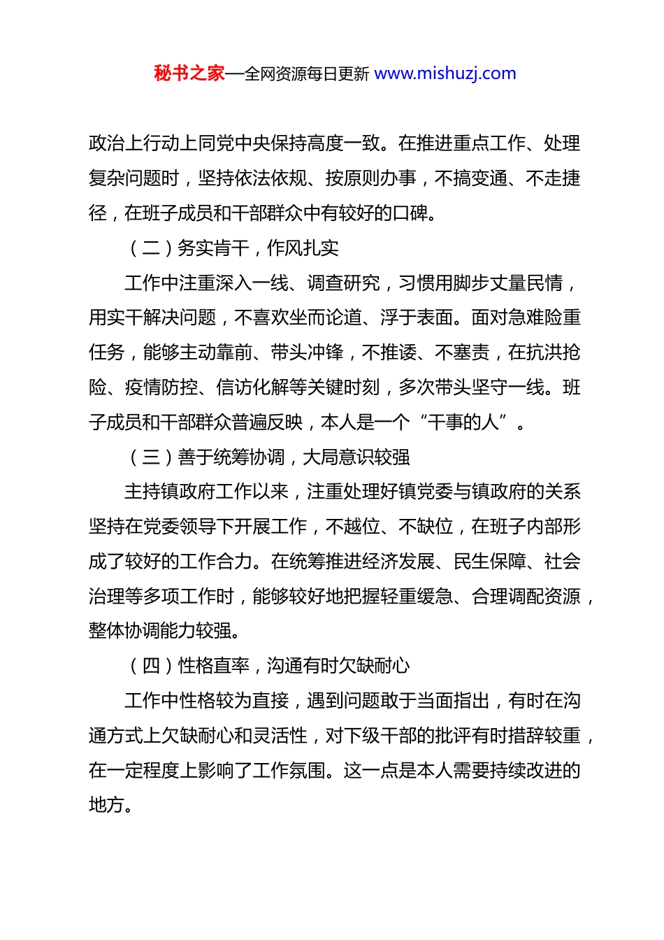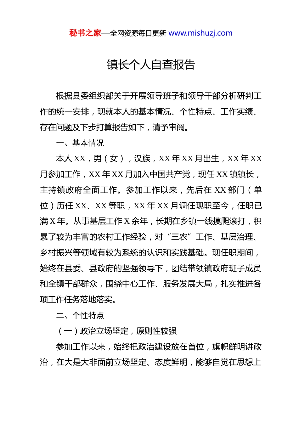 秘书之家—全网资源每日更新 www.mishuzj.com镇长个人自查报告根据县委组织部关于开展领导班子和领导干部分析研判工作的统一安排,现就本人的基本情况、个性特点、工作实绩、存在问题及下步打算报告如下,请予审阅。一、基本情况本人 XX,男(女),汉族,XX 年 XX 月出生,XX 年 XX月参加工作,XX 年 XX 月加入中国共产党,现任 XX 镇镇长,主持镇政府全面工作。参加工作以来,先后在 XX 部门(单位)历任 XX、XX 等职,XX 年 XX 月调任现职至今,任职已满 X 年。从事基层工作 X 余年,长期在乡镇一线摸爬滚打,积累了较为丰富的农村工作经验,对“三农”工作、基层治理、乡村振兴等领域有较为系统的认识和实践基础。现任职期间,始终在县委、县政府的坚强领导下,团结带领镇政府班子成员和全镇干部群众,围绕中心工作、服务发展大局,扎实推进各项工作任务落地落实。二、个性特点(一)政治立场坚定,原则性较强参加工作以来,始终把政治建设放在首位,旗帜鲜明讲政治,在大是大非面前立场坚定、态度鲜明,能够自觉在思想上秘书之家—全网资源每日更新 www.mishuzj.com政治上行动上同党中央保持高度一致。在推进重点工作、处理复杂问题时,坚持依法依规、按原则办事,不搞变通、不走捷径,在班子成员和干部群众中有较好的口碑。(二)务实肯干,作风扎实工作中注重深入一线、调查研究,习惯用脚步丈量民情,用实干解决问题,不喜欢坐而论道、浮于表面。面对急难险重任务,能够主动靠前、带头冲锋,不推诿、不塞责,在抗洪抢险、疫情防控、信访化解等关键时刻,多次带头坚守一线。班子成员和干部群众普遍反映,本人是一个“干事的人”。(三)善于统筹协调,大局意识较强主持镇政府工作以来,注重处理好镇党委与镇政府的关系坚持在党委领导下开展工作,不越位、不缺位,在班子内部形成了较好的工作合力。在统筹推进经济发展、民生保障、社会治理等多项工作时,能够较好地把握轻重缓急、合理调配资源,整体协调能力较强。(四)性格直率,沟通有时欠缺耐心工作中性格较为直接,遇到问题敢于当面指出,有时在沟通方式上欠缺耐心和灵活性,对下级干部的批评有时措辞较重,在一定程度上影响了工作氛围。这一点是本人需要持续改进的地方。秘书之家—全网资源每日更新 www.mishuzj.com三、工作实绩(一)聚焦高质量发展,经济运行总体平稳立足镇域实际,坚持把发展作为第一要务,积极推动产业培育和招商引资。任职以来,全镇地区生产总值年均增长 XX%,固定资产投资年均增长 XX%,一般公共预算收入保持稳定增长。一是大力发展特色产业,立足本镇 XX 资源优势,培育壮大 XX 特色农业产业,新发展 XX 产业基地 XX 亩,培育农业专业合作社 XX 个、家庭农场 XX 个,带动农民增收效果明显。二是积极推进招商引资,共引进项目 XX 个,到位资金 XX亿元,新增规上企业 XX 户,有效充实了镇域经济发展后劲。三是扎实推进乡村振兴,严格落实粮食安全责任制,粮食播种面积稳定在 XX 万亩以上,巩固拓展脱贫攻坚成果,全镇XX 户监测户无一人返贫致贫。(二)着力改善民生,群众获得感持续增强始终坚持以人民为中心的发展思想,把解决群众急难愁盼问题作为工作的出发点和落脚点。一是持续改善农村基础设施,任职以来累计新建改建农村公路 XX 公里,实施农村安全饮水工程受益群众 XX 人,改造农村危房 XX 户,农村生产生活条件明显改善。秘书之家—全网资源每日更新 www.mishuzj.com二是扎实推进美丽乡村建设,深入开展农村人居环境整治,创建省(市)级美丽乡村示范村 XX 个,农村环境面貌发生了显著变化。三是认真办好民生实事,推动解决群众反映的教育、医疗、养老等方面突出问题,年均办理民生实事 XX 件,群众满意度测评连续 X 年位居全县前列。(三)强化基层治理,社会大局和谐稳定把维护社会稳定作为重要政治责任,坚持和发展新时代“枫桥经验”,推动矛盾纠纷化解在基层、解决在萌芽状态。一是深入推进网格化管理,全镇划分综合网格 XX 个,配备专兼职网格员 XX 名,建立健全矛盾纠纷发现、上报、处置闭环机制,基层治理精...