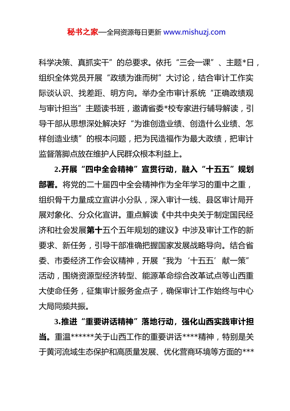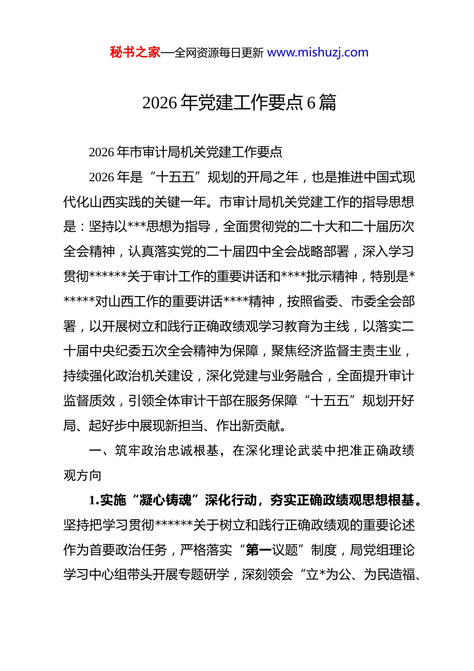 秘书之家—全网资源每日更新 www.mishuzj.com2026 年党建工作要点 6 篇 2026 年市审计局机关党建工作要点2026 年是“十五五”规划的开局之年,也是推进中国式现代化山西实践的关键一年。市审计局机关党建工作的指导思想是:坚持以***思想为指导,全面贯彻党的二十大和二十届历次全会精神,认真落实党的二十届四中全会战略部署,深入学习贯彻******关于审计工作的重要讲话和****批示精神,特别是******对山西工作的重要讲话****精神,按照省委、市委全会部署,以开展树立和践行正确政绩观学习教育为主线,以落实二十届中央纪委五次全会精神为保障,聚焦经济监督主责主业,持续强化政治机关建设,深化党建与业务融合,全面提升审计监督质效,引领全体审计干部在服务保障“十五五”规划开好局、起好步中展现新担当、作出新贡献。一、筑牢政治忠诚根基,在深化理论武装中把准正确政绩观方向1.实施“凝心铸魂”深化行动,夯实正确政绩观思想根基。坚持把学习贯彻******关于树立和践行正确政绩观的重要论述作为首要政治任务,严格落实“第一议题”制度,局党组理论学习中心组带头开展专题研学,深刻领会“立*为公、为民造福、秘书之家—全网资源每日更新 www.mishuzj.com科学决策、真抓实干”的总要求。依托“三会一课”、主题*日,组织全体党员开展“政绩为谁而树”大讨论,结合审计工作实际谈认识、找差距、明方向。举办全市审计系统“正确政绩观与审计担当”主题读书班,邀请省委*校专家进行辅导解读,引导干部从思想深处解决好“为谁创造业绩、创造什么业绩、怎样创造业绩”的根本问题,把为民造福作为最大政绩,把审计监督落脚点放在维护人民群众根本利益上。2.开展“四中全会精神”宣贯行动,融入“十五五”规划部署。将党的二十届四中全会精神作为全年学习的重中之重,组织骨干力量成立宣讲小分队,深入审计一线、县区审计局开展对象化、分众化宣讲。重点解读《中共中央关于制定国民经济和社会发展第十五个五年规划的建议》中涉及审计工作的新要求、新任务,引导干部准确把握国家发展战略导向。结合省委、市委经济工作会议精神,开展“我为‘十五五’献一策”活动,围绕资源型经济转型、能源革命综合改革试点等山西重大使命任务,征集审计服务金点子,确保审计工作始终与中心大局同频共振。3.推进“重要讲话精神”落地行动,强化山西实践审计担当。重温******关于山西工作的重要讲话****精神,特别是关于黄河流域生态保护和高质量发展、优化营商环境等方面的***秘书之家—全网资源每日更新 www.mishuzj.com*,建立学习贯彻台账。开展“沿着领袖足迹学思想”现场教学活动,组织党员干部赴考察点实地感悟,激发干事创业热情。将讲话精神转化为具体审计举措,在项目计划制定中优先安排转型发展、文物保护、生态环保等重点领域审计项目,用审计实践检验学习成效,确保*中央及省委重大决策部署在审计环节不折不扣落实。4.抓实“二十届中央纪委五次全会”精神学习行动,筑牢廉洁从审防线。局党组带头学习领会******关于党的自我革命的重要思想,深刻把握全会对反腐败斗争的形势判断和战略部署。组织全局干部观看警示教育片,通报审计系统违纪违法典型案例,用身边事教育身边人。开展“纪律教育月”活动,逐条学习新修订的纪律处分条例,围绕审计“四严禁”工作要求和“八不准”工作纪律进行对照检查,引导干部知敬畏、存戒惧、守底线,将全面从严治党要求内化于心、外化于行。二、聚焦学习教育主线,在查改贯通中淬炼求真务实优良作风5.精心组织动员部署,压实政绩观学习教育主体责任。春节假期后第一时间召开全局树立和践行正确政绩观学习教育动员大会,制定印发实施方案,成立由局党组书记任组长的学习教育领导小组。明确党组主体责任、书记第一责任人责任和班秘书之家—全网资源每日更新 www.mishuzj.com子成员“一岗双责”,建立局领导联系点制度,每人包联 1-2个县区审计局和 2-3 个业务科室,全程指导、定期调度。把学习教育开展情况纳入年度党建考核和党支部书记述职评议内容,形成一级抓一级、层层抓落实的责任链条,确保学习教育于 7月底前取得扎实成效。6.深入...