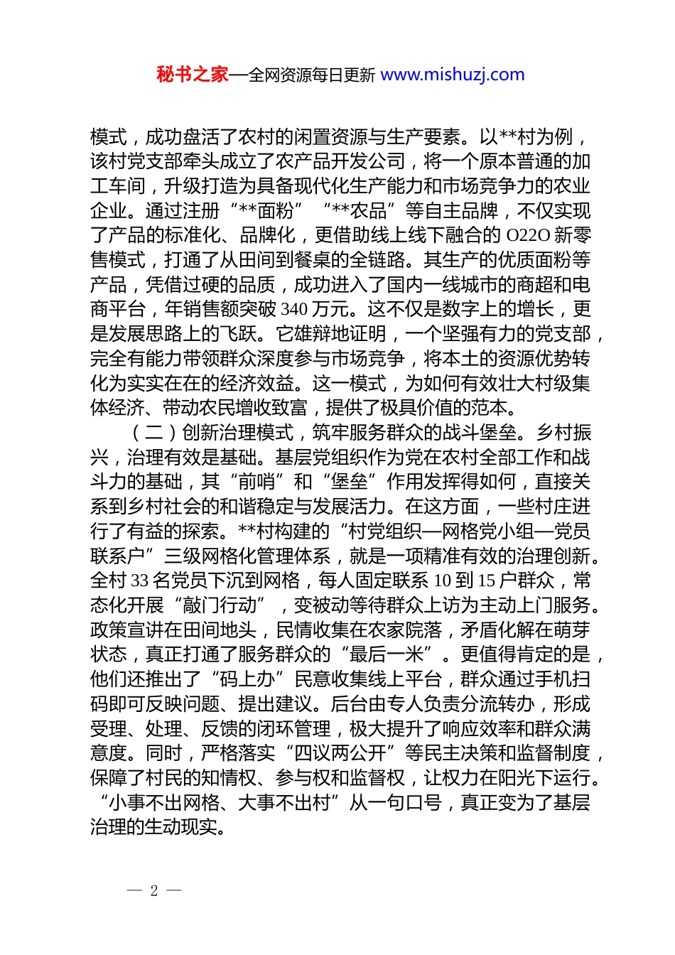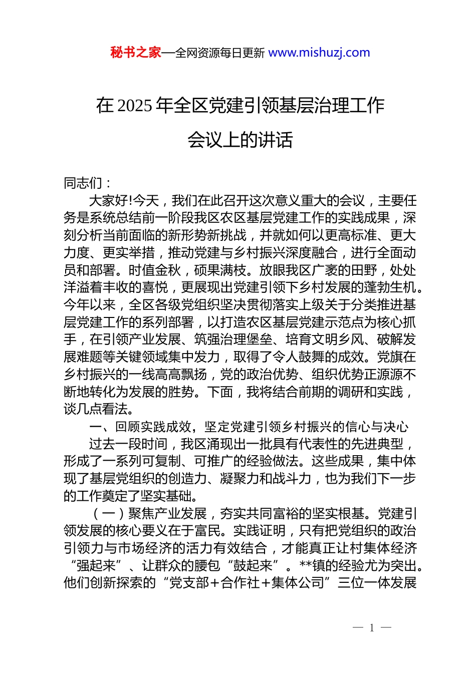 秘书之家—全网资源每日更新 www.mishuzj.com在 2025 年全区党建引领基层治理工作会议上的讲话同志们:大家好!今天,我们在此召开这次意义重大的会议,主要任务是系统总结前一阶段我区农区基层党建工作的实践成果,深刻分析当前面临的新形势新挑战,并就如何以更高标准、更大力度、更实举措,推动党建与乡村振兴深度融合,进行全面动员和部署。时值金秋,硕果满枝。放眼我区广袤的田野,处处洋溢着丰收的喜悦,更展现出党建引领下乡村发展的蓬勃生机。今年以来,全区各级党组织坚决贯彻落实上级关于分类推进基层党建工作的系列部署,以打造农区基层党建示范点为核心抓手,在引领产业发展、筑强治理堡垒、培育文明乡风、破解发展难题等关键领域集中发力,取得了令人鼓舞的成效。党旗在乡村振兴的一线高高飘扬,党的政治优势、组织优势正源源不断地转化为发展的胜势。下面,我将结合前期的调研和实践,谈几点看法。一、回顾实践成效,坚定党建引领乡村振兴的信心与决心过去一段时间,我区涌现出一批具有代表性的先进典型,形成了一系列可复制、可推广的经验做法。这些成果,集中体现了基层党组织的创造力、凝聚力和战斗力,也为我们下一步的工作奠定了坚实基础。(一)聚焦产业发展,夯实共同富裕的坚实根基。党建引领发展的核心要义在于富民。实践证明,只有把党组织的政治引领力与市场经济的活力有效结合,才能真正让村集体经济“强起来”、让群众的腰包“鼓起来”。**镇的经验尤为突出。他们创新探索的“党支部+合作社+集体公司”三位一体发展— 1 —秘书之家—全网资源每日更新 www.mishuzj.com模式,成功盘活了农村的闲置资源与生产要素。以**村为例,该村党支部牵头成立了农产品开发公司,将一个原本普通的加工车间,升级打造为具备现代化生产能力和市场竞争力的农业企业。通过注册“**面粉”“**农品”等自主品牌,不仅实现了产品的标准化、品牌化,更借助线上线下融合的 O22O 新零售模式,打通了从田间到餐桌的全链路。其生产的优质面粉等产品,凭借过硬的品质,成功进入了国内一线城市的商超和电商平台,年销售额突破 340 万元。这不仅是数字上的增长,更是发展思路上的飞跃。它雄辩地证明,一个坚强有力的党支部,完全有能力带领群众深度参与市场竞争,将本土的资源优势转化为实实在在的经济效益。这一模式,为如何有效壮大村级集体经济、带动农民增收致富,提供了极具价值的范本。(二)创新治理模式,筑牢服务群众的战斗堡垒。乡村振兴,治理有效是基础。基层党组织作为党在农村全部工作和战斗力的基础,其“前哨”和“堡垒”作用发挥得如何,直接关系到乡村社会的和谐稳定与发展活力。在这方面,一些村庄进行了有益的探索。**村构建的“村党组织—网格党小组—党员联系户”三级网格化管理体系,就是一项精准有效的治理创新。全村 33 名党员下沉到网格,每人固定联系 10 到 15 户群众,常态化开展“敲门行动”,变被动等待群众上访为主动上门服务。政策宣讲在田间地头,民情收集在农家院落,矛盾化解在萌芽状态,真正打通了服务群众的“最后一米”。更值得肯定的是,他们还推出了“码上办”民意收集线上平台,群众通过手机扫码即可反映问题、提出建议。后台由专人负责分流转办,形成受理、处理、反馈的闭环管理,极大提升了响应效率和群众满意度。同时,严格落实“四议两公开”等民主决策和监督制度,保障了村民的知情权、参与权和监督权,让权力在阳光下运行。“小事不出网格、大事不出村”从一句口号,真正变为了基层治理的生动现实。— 2 —秘书之家—全网资源每日更新 www.mishuzj.com(三)深化移风易俗,涵养乡风文明的时代新貌。乡风文明是乡村振兴之“魂”。一个地方的发展,不仅要看经济指标,更要看精神风貌。我区始终坚持物质文明与精神文明“两手抓、两手硬”,以党建引领为抓手,向高价彩礼、人情攀比、铺张浪费等陈规陋习“宣战”,取得了显著成效。各村党组织积极作为,将移风易俗的要求细化为可操作、能遵守的村规民约。比如,**村等地倡导白事简办、不设宴席;**村等村庄革除了部分不合时宜的旧俗;**村对彩礼设定“限高”标准,有...