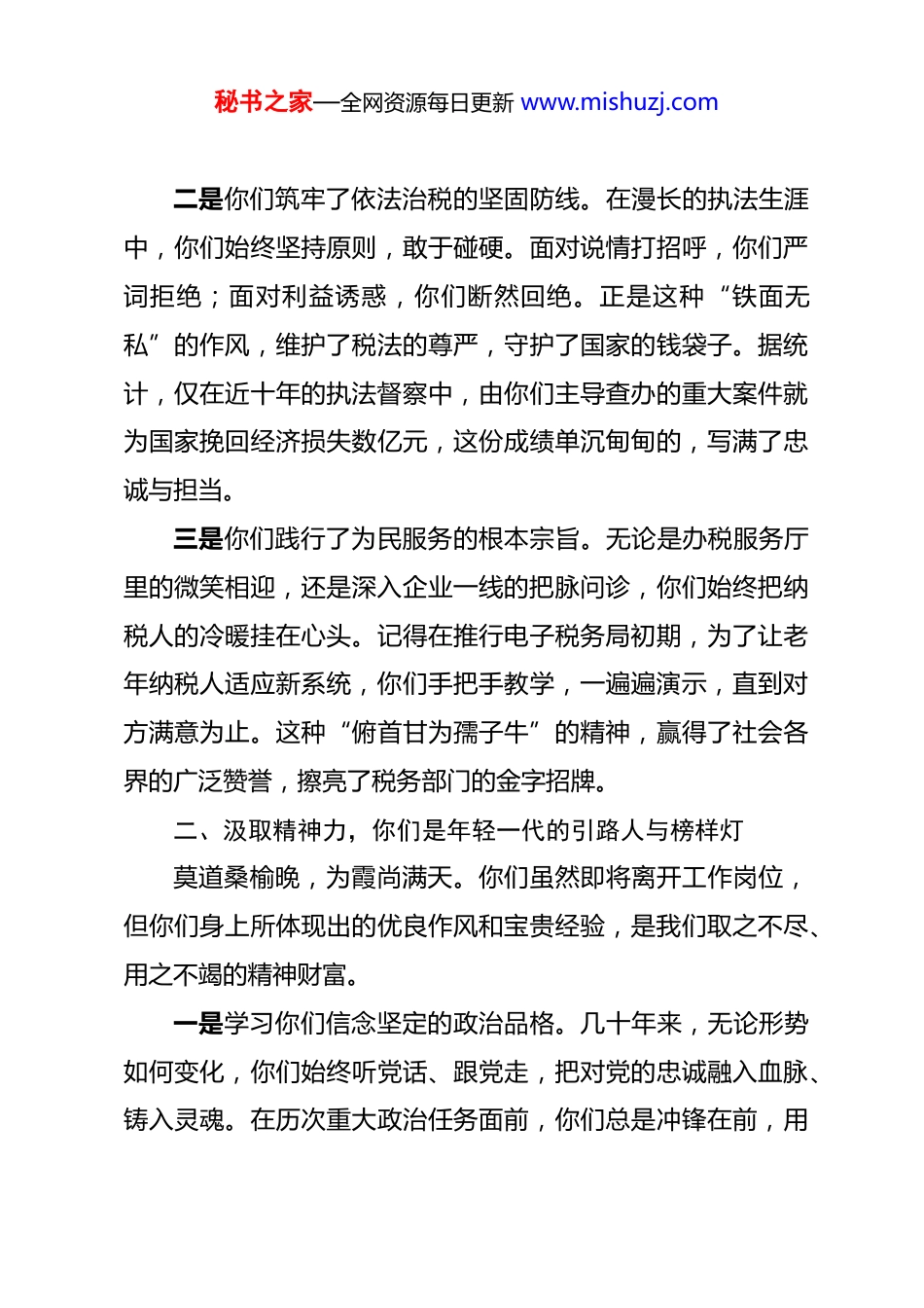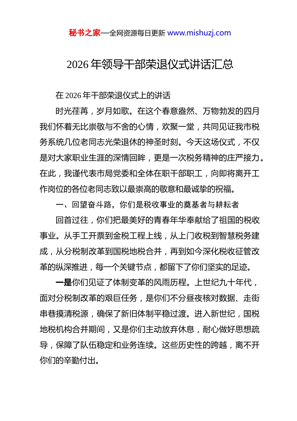 秘书之家—全网资源每日更新 www.mishuzj.com2026 年领导干部荣退仪式讲话汇总 在 2026 年干部荣退仪式上的讲话时光荏苒,岁月如歌。在这个春意盎然、万物勃发的四月我们怀着无比崇敬与不舍的心情,欢聚一堂,共同见证我市税务系统几位老同志光荣退休的神圣时刻。今天这场仪式,不仅是对大家职业生涯的深情回眸,更是一次税务精神的庄严接力。在此,我谨代表市局党委和全体在职干部职工,向即将离开工作岗位的各位老同志致以最崇高的敬意和最诚挚的祝福。一、回望奋斗路,你们是税收事业的奠基者与耕耘者回首过往,你们把最美好的青春年华奉献给了祖国的税收事业。从手工开票到金税工程上线,从上门收税到智慧税务建成,从分税制改革到国税地税合并,再到如今深化税收征管改革的纵深推进,每一个关键节点,都留下了你们坚实的足迹。一是你们见证了体制变革的风雨历程。上世纪九十年代,面对分税制改革的艰巨任务,是你们不分昼夜核对数据、走街串巷摸清税源,确保了新旧体制平稳过渡。进入新世纪,国税地税机构合并期间,又是你们主动放弃休息,耐心做好思想疏导,保障了队伍稳定和业务连续。这些历史性的跨越,离不开你们的辛勤付出。秘书之家—全网资源每日更新 www.mishuzj.com二是你们筑牢了依法治税的坚固防线。在漫长的执法生涯中,你们始终坚持原则,敢于碰硬。面对说情打招呼,你们严词拒绝;面对利益诱惑,你们断然回绝。正是这种“铁面无私”的作风,维护了税法的尊严,守护了国家的钱袋子。据统计,仅在近十年的执法督察中,由你们主导查办的重大案件就为国家挽回经济损失数亿元,这份成绩单沉甸甸的,写满了忠诚与担当。三是你们践行了为民服务的根本宗旨。无论是办税服务厅里的微笑相迎,还是深入企业一线的把脉问诊,你们始终把纳税人的冷暖挂在心头。记得在推行电子税务局初期,为了让老年纳税人适应新系统,你们手把手教学,一遍遍演示,直到对方满意为止。这种“俯首甘为孺子牛”的精神,赢得了社会各界的广泛赞誉,擦亮了税务部门的金字招牌。二、汲取精神力,你们是年轻一代的引路人与榜样灯莫道桑榆晚,为霞尚满天。你们虽然即将离开工作岗位,但你们身上所体现出的优良作风和宝贵经验,是我们取之不尽、用之不竭的精神财富。一是学习你们信念坚定的政治品格。几十年来,无论形势如何变化,你们始终听党话、跟党走,把对党的忠诚融入血脉、铸入灵魂。在历次重大政治任务面前,你们总是冲锋在前,用秘书之家—全网资源每日更新 www.mishuzj.com实际行动诠释了共产党员的初心使命。这种坚定的理想信念,是我们在新时代新征程上战胜一切艰难险阻的根本保证。二是学习你们爱岗敬业的奉献精神。你们把岗位当战位,把职业当事业。有的同志为了核实一笔疑点数据,连续加班半个月;有的同志在身患重病的情况下,依然坚持站好最后一班岗。这种“干一行、爱一行、钻一行”的执着,深深感染着身边的每一个人,激励着我们在平凡的岗位上创造不平凡的业绩。三是学习你们清正廉洁的高尚情操。你们常怀律己之心,常思贪欲之害,清清白白做人、干干净净做事。在你们身上,我们看到了共产党人应有的浩然正气。这种廉洁自律的作风,为我们营造了风清气正的政治生态,是税务队伍行稳致远的重要基石。三、接过接力棒,我们是新时代的奋进者与开拓者前辈栽树,后人乘凉;前辈引路,后人远航。今天,我们在这里举行荣退仪式,既是为了表达感恩,更是为了宣誓接力。年轻的税务干部们,我们要以前辈为标杆,接过历史的接力棒,跑好属于我们这一代人的新征程。一是我们要传承红色基因,做政治上的明白人。要深入学习领会党中央关于税收工作的最新指示精神,不断提高政治判断力、政治领悟力、政治执行力。要把讲政治体现在每一次执秘书之家—全网资源每日更新 www.mishuzj.com法、每一项服务、每一笔税款征收中,确保税收工作始终沿着正确的方向前进。二是我们要勇担时代重任,做业务上的带头人。当前,智慧税务建设正处于攻坚期,税费服务需求日益多元化。我们要发扬前辈们刻苦钻研的精神,加快知识更新,提升专业技能,努力成为懂政策、精业务、善管理的行家里手,为推动税收现...