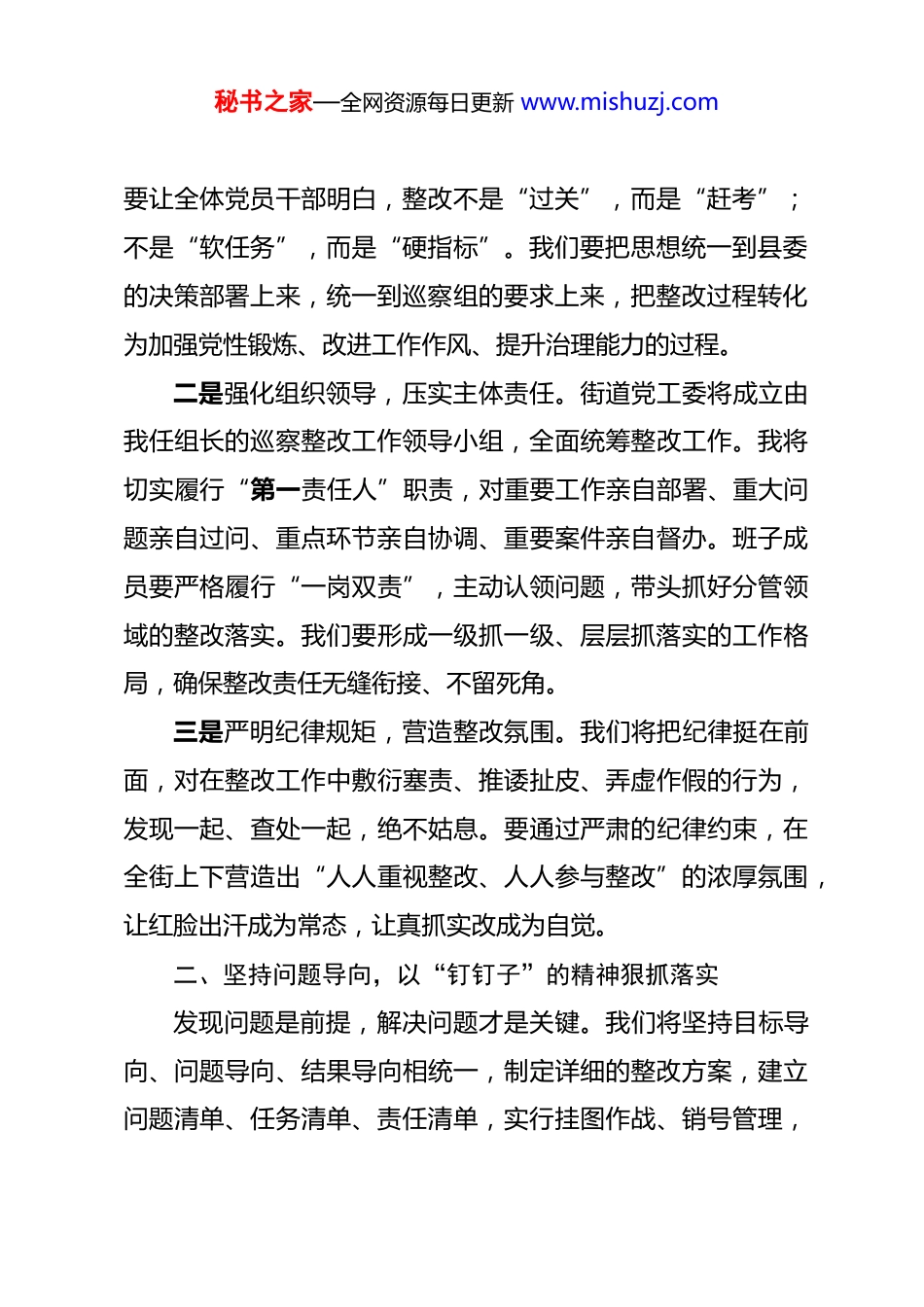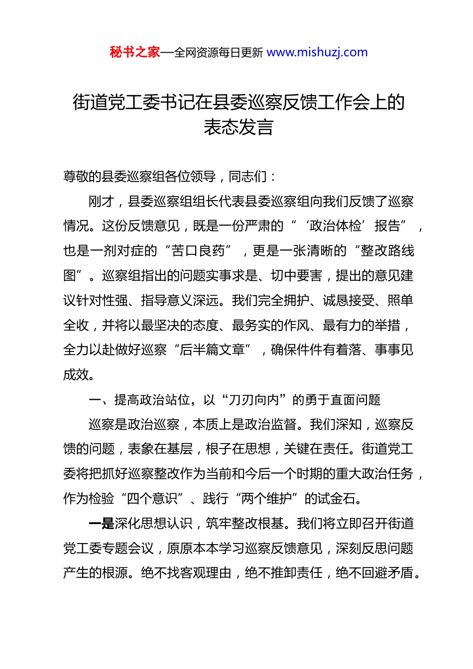 秘书之家—全网资源每日更新 www.mishuzj.com街道党工委书记在县委巡察反馈工作会上的表态发言 尊敬的县委巡察组各位领导,同志们:刚才,县委巡察组组长代表县委巡察组向我们反馈了巡察情况。这份反馈意见,既是一份严肃的“‘政治体检’报告”,也是一剂对症的“苦口良药”,更是一张清晰的“整改路线图”。巡察组指出的问题实事求是、切中要害,提出的意见建议针对性强、指导意义深远。我们完全拥护、诚恳接受、照单全收,并将以最坚决的态度、最务实的作风、最有力的举措,全力以赴做好巡察“后半篇文章”,确保件件有着落、事事见成效。一、提高政治站位,以“刀刃向内”的勇于直面问题巡察是政治巡察,本质上是政治监督。我们深知,巡察反馈的问题,表象在基层,根子在思想,关键在责任。街道党工委将把抓好巡察整改作为当前和今后一个时期的重大政治任务,作为检验“四个意识”、践行“两个维护”的试金石。一是深化思想认识,筑牢整改根基。我们将立即召开街道党工委专题会议,原原本本学习巡察反馈意见,深刻反思问题产生的根源。绝不找客观理由,绝不推卸责任,绝不回避矛盾。秘书之家—全网资源每日更新 www.mishuzj.com要让全体党员干部明白,整改不是“过关”,而是“赶考”;不是“软任务”,而是“硬指标”。我们要把思想统一到县委的决策部署上来,统一到巡察组的要求上来,把整改过程转化为加强党性锻炼、改进工作作风、提升治理能力的过程。二是强化组织领导,压实主体责任。街道党工委将成立由我任组长的巡察整改工作领导小组,全面统筹整改工作。我将切实履行“第一责任人”职责,对重要工作亲自部署、重大问题亲自过问、重点环节亲自协调、重要案件亲自督办。班子成员要严格履行“一岗双责”,主动认领问题,带头抓好分管领域的整改落实。我们要形成一级抓一级、层层抓落实的工作格局,确保整改责任无缝衔接、不留死角。三是严明纪律规矩,营造整改氛围。我们将把纪律挺在前面,对在整改工作中敷衍塞责、推诿扯皮、弄虚作假的行为,发现一起、查处一起,绝不姑息。要通过严肃的纪律约束,在全街上下营造出“人人重视整改、人人参与整改”的浓厚氛围,让红脸出汗成为常态,让真抓实改成为自觉。二、坚持问题导向,以“钉钉子”的精神狠抓落实发现问题是前提,解决问题才是关键。我们将坚持目标导向、问题导向、结果导向相统一,制定详细的整改方案,建立问题清单、任务清单、责任清单,实行挂图作战、销号管理,秘书之家—全网资源每日更新 www.mishuzj.com确保整改工作落地生根。一是分类施策,精准发力。针对巡察组反馈的三个方面十五个具体问题,我们将逐一分析研判,制定切实可行的整改措施。对于能够立即解决的问题,如部分社区服务窗口办事效率不高、个别小区环境卫生整治不到位等,我们立行立改,争取在一周内见到明显变化;对于需要一定时间解决的问题,如老旧小区基础设施改造滞后、集体资产管理制度不够完善等,我们明确时间表、路线图,分阶段推进,确保在规定期限内全面完成;对于涉及体制机制层面的深层次问题,如基层治理体系不够健全、干部队伍建设存在短板等,我们深入研究,举一反三,建章立制,力求从源头上堵塞漏洞。二是聚焦民生,温暖人心。巡察整改的最终落脚点是为民服务。我们将把解决群众急难愁盼问题作为整改的重中之重。针对群众反映强烈的停车难、充电难、养老托幼资源不足等问题,我们将整合辖区资源,盘活闲置空间,加快补齐民生短板。比如,计划利用辖区内两处闲置空地建设便民停车场,新增停车位约八十个;协调辖区企事业单位错时开放内部停车场,缓解夜间停车压力。在养老服务方面,我们将依托社区党群服务中心,新建两个嵌入式养老服务站,为老年人提供助餐、助浴、医疗保健等贴心服务。我们要用实实在在的整改成效,换取群秘书之家—全网资源每日更新 www.mishuzj.com众的满意笑容。三是标本兼治,长效常治。整改不能止步于“治标”,更要致力于“治本”。我们将坚持“当下改”与“长久立”相结合,在解决具体问题的同时,深入查找制度机制上的缺失和薄弱环节。重点围绕党的建设、财务管理、工程项目、民生保障等关键...