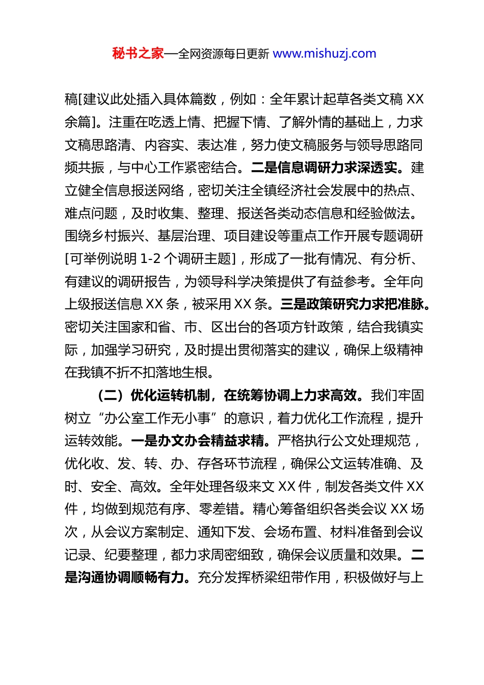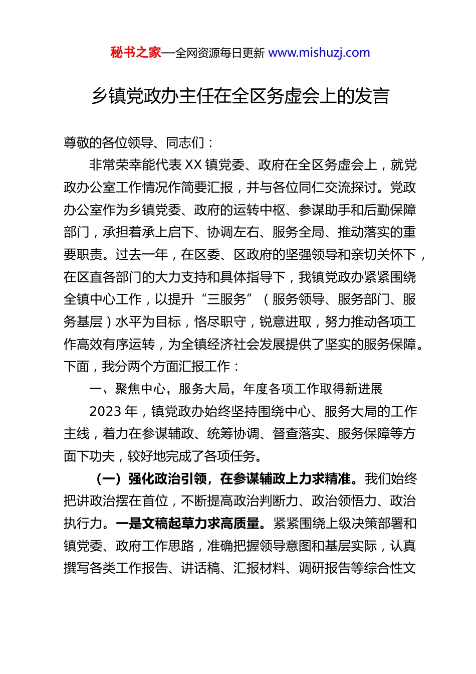 秘书之家—全网资源每日更新 www.mishuzj.com乡镇党政办主任在全区务虚会上的发言尊敬的各位领导、同志们:非常荣幸能代表 XX 镇党委、政府在全区务虚会上,就党政办公室工作情况作简要汇报,并与各位同仁交流探讨。党政办公室作为乡镇党委、政府的运转中枢、参谋助手和后勤保障部门,承担着承上启下、协调左右、服务全局、推动落实的重要职责。过去一年,在区委、区政府的坚强领导和亲切关怀下,在区直各部门的大力支持和具体指导下,我镇党政办紧紧围绕全镇中心工作,以提升“三服务”(服务领导、服务部门、服务基层)水平为目标,恪尽职守,锐意进取,努力推动各项工作高效有序运转,为全镇经济社会发展提供了坚实的服务保障。下面,我分两个方面汇报工作:一、聚焦中心,服务大局,年度各项工作取得新进展2023 年,镇党政办始终坚持围绕中心、服务大局的工作主线,着力在参谋辅政、统筹协调、督查落实、服务保障等方面下功夫,较好地完成了各项任务。(一)强化政治引领,在参谋辅政上力求精准。我们始终把讲政治摆在首位,不断提高政治判断力、政治领悟力、政治执行力。一是文稿起草力求高质量。紧紧围绕上级决策部署和镇党委、政府工作思路,准确把握领导意图和基层实际,认真撰写各类工作报告、讲话稿、汇报材料、调研报告等综合性文秘书之家—全网资源每日更新 www.mishuzj.com稿[建议此处插入具体篇数,例如:全年累计起草各类文稿 XX余篇]。注重在吃透上情、把握下情、了解外情的基础上,力求文稿思路清、内容实、表达准,努力使文稿服务与领导思路同频共振,与中心工作紧密结合。二是信息调研力求深透实。建立健全信息报送网络,密切关注全镇经济社会发展中的热点、难点问题,及时收集、整理、报送各类动态信息和经验做法。围绕乡村振兴、基层治理、项目建设等重点工作开展专题调研[可举例说明 1-2 个调研主题],形成了一批有情况、有分析、有建议的调研报告,为领导科学决策提供了有益参考。全年向上级报送信息 XX 条,被采用 XX 条。三是政策研究力求把准脉。密切关注国家和省、市、区出台的各项方针政策,结合我镇实际,加强学习研究,及时提出贯彻落实的建议,确保上级精神在我镇不折不扣落地生根。(二)优化运转机制,在统筹协调上力求高效。我们牢固树立“办公室工作无小事”的意识,着力优化工作流程,提升运转效能。一是办文办会精益求精。严格执行公文处理规范,优化收、发、转、办、存各环节流程,确保公文运转准确、及时、安全、高效。全年处理各级来文 XX 件,制发各类文件 XX件,均做到规范有序、零差错。精心筹备组织各类会议 XX 场次,从会议方案制定、通知下发、会场布置、材料准备到会议记录、纪要整理,都力求周密细致,确保会议质量和效果。二是沟通协调顺畅有力。充分发挥桥梁纽带作用,积极做好与上秘书之家—全网资源每日更新 www.mishuzj.com级部门、镇内各科室、各村(社区)以及驻镇单位的沟通协调工作。对于重点工作、重大活动,主动上前,加强预判,统筹各方力量,形成工作合力,确保政令畅通、落实到位。妥善处理各类日常事务和临时性、突发性工作,保障了机关正常有序运转。三是机要保密万无一失。严格遵守保密纪律,加强涉密文件、载体的管理,定期开展保密检查和教育,确保国家秘密和工作秘密安全。严格落实 24 小时值班值守制度,保证信息渠道畅通,应急反应迅速。(三)狠抓督办落实,在推动执行上力求到位。我们坚持把抓落实作为办公室工作的关键环节,推动党委、政府各项决策部署落地见效。一是健全督查机制。建立重点工作台账管理制度,对镇党委会、镇长办公会等议定事项以及领导批示交办事项,明确责任单位、责任人和完成时限,实行清单化管理、项目化推进。二是强化跟踪问效。采取定期督查与随机抽查、书面督查与实地检查相结合的方式,及时了解各项工作进展情况,发现存在的问题和困难,提出改进工作的意见建议,并适时向领导汇报督查结果。三是注重结果运用。将督查结果作为评价各部门、各村(社区)工作成效的重要依据,推动形成了层层负责、环环相扣、狠抓落实的工作格局,确保了各项重点工作按时序进...