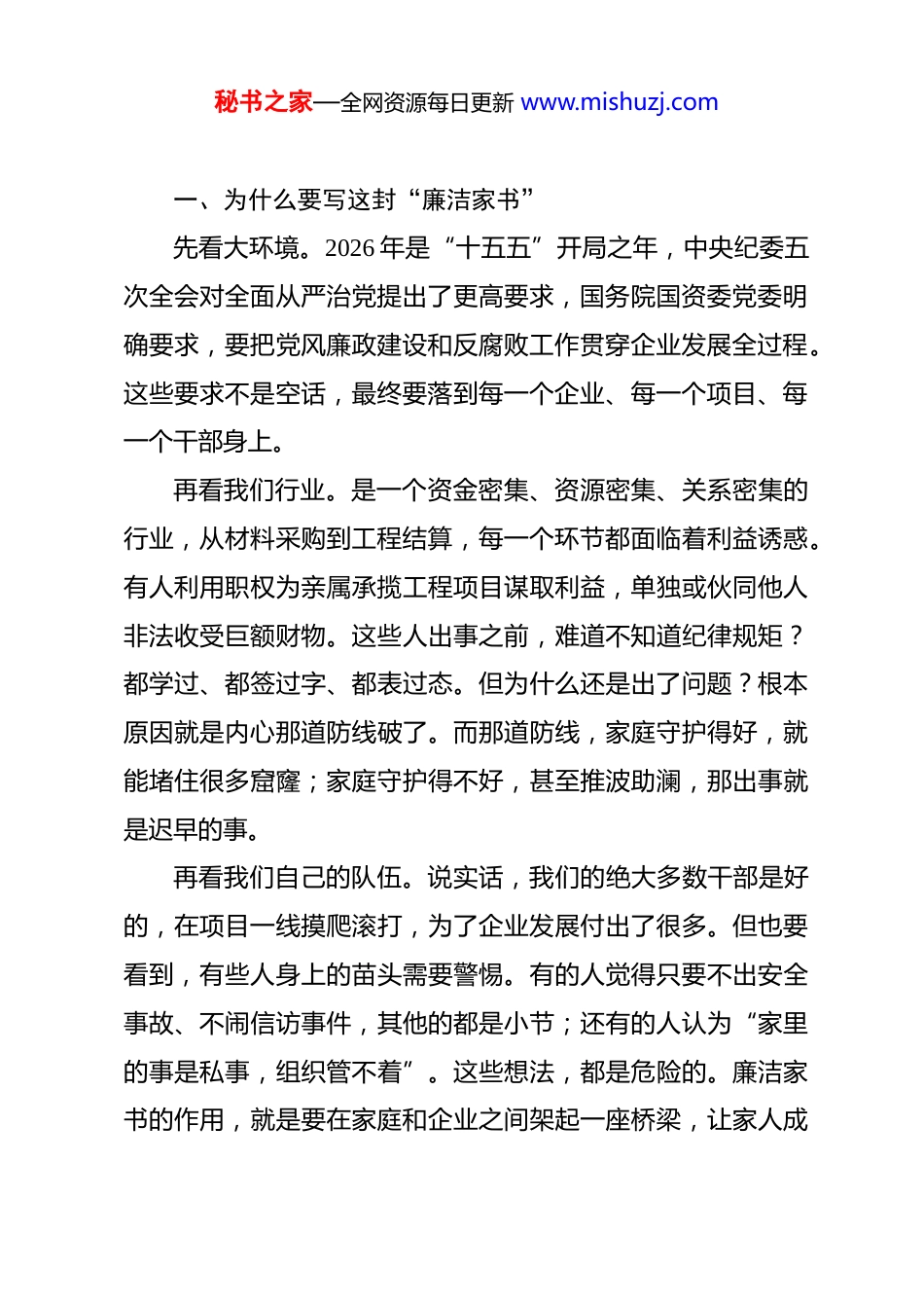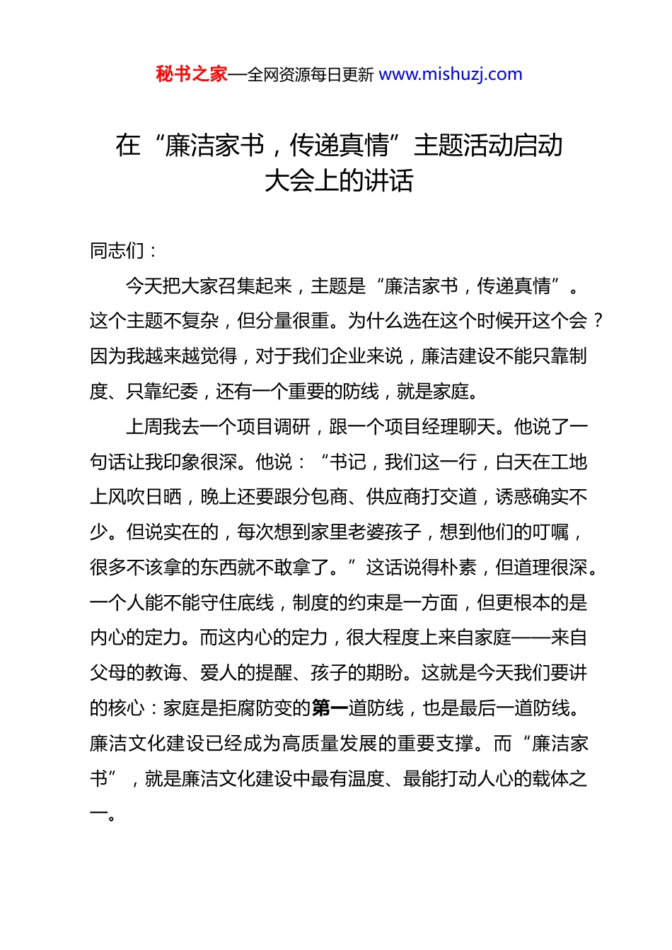 秘书之家—全网资源每日更新 www.mishuzj.com在“廉洁家书,传递真情”主题活动启动大会上的讲话 同志们:今天把大家召集起来,主题是“廉洁家书,传递真情”。这个主题不复杂,但分量很重。为什么选在这个时候开这个会?因为我越来越觉得,对于我们企业来说,廉洁建设不能只靠制度、只靠纪委,还有一个重要的防线,就是家庭。上周我去一个项目调研,跟一个项目经理聊天。他说了一句话让我印象很深。他说:“书记,我们这一行,白天在工地上风吹日晒,晚上还要跟分包商、供应商打交道,诱惑确实不少。但说实在的,每次想到家里老婆孩子,想到他们的叮嘱,很多不该拿的东西就不敢拿了。”这话说得朴素,但道理很深。一个人能不能守住底线,制度的约束是一方面,但更根本的是内心的定力。而这内心的定力,很大程度上来自家庭——来自父母的教诲、爱人的提醒、孩子的期盼。这就是今天我们要讲的核心:家庭是拒腐防变的第一道防线,也是最后一道防线。廉洁文化建设已经成为高质量发展的重要支撑。而“廉洁家书”,就是廉洁文化建设中最有温度、最能打动人心的载体之一。秘书之家—全网资源每日更新 www.mishuzj.com一、为什么要写这封“廉洁家书”先看大环境。2026 年是“十五五”开局之年,中央纪委五次全会对全面从严治党提出了更高要求,国务院国资委党委明确要求,要把党风廉政建设和反腐败工作贯穿企业发展全过程。这些要求不是空话,最终要落到每一个企业、每一个项目、每一个干部身上。再看我们行业。是一个资金密集、资源密集、关系密集的行业,从材料采购到工程结算,每一个环节都面临着利益诱惑。有人利用职权为亲属承揽工程项目谋取利益,单独或伙同他人非法收受巨额财物。这些人出事之前,难道不知道纪律规矩?都学过、都签过字、都表过态。但为什么还是出了问题?根本原因就是内心那道防线破了。而那道防线,家庭守护得好,就能堵住很多窟窿;家庭守护得不好,甚至推波助澜,那出事就是迟早的事。再看我们自己的队伍。说实话,我们的绝大多数干部是好的,在项目一线摸爬滚打,为了企业发展付出了很多。但也要看到,有些人身上的苗头需要警惕。有的人觉得只要不出安全事故、不闹信访事件,其他的都是小节;还有的人认为“家里的事是私事,组织管不着”。这些想法,都是危险的。廉洁家书的作用,就是要在家庭和企业之间架起一座桥梁,让家人成秘书之家—全网资源每日更新 www.mishuzj.com为廉洁的“监督员”和“守门人”,让家庭成为拒腐防变的坚固堡垒。二、这封“廉洁家书”要写什么说到写家书,有些同志可能会问:家书到底怎么写?是不是写几句廉洁口号就完事了?不是。家书贵在真诚,贵在用心。第一,写真情实感,不写官样文章。家书不是工作报告,不需要“一是二是三是”的格式。家书讲的是心里话,是对家人的爱、对家庭的责任。有位项目经理曾经说:“想起家人的叮嘱,我便有了拒绝诱惑的底气。”这句话很朴素,但很打动人。家书就要这样写——想想你的父母最担心什么,你的爱人最期盼什么,你的孩子最需要什么。把这些写下来,就是最好的家书。第二,写具体承诺,不写空洞口号。家书里面,要对自己的家人作出具体承诺。比如:不接受任何影响公正执行公务的礼品礼金;不利用职务之便为亲友承揽工程、推销材料;不在八小时之外与分包商、供应商有不正当交往。这些承诺越具体,约束力就越强。第三,写对家人的嘱托,也写对家人的感恩。廉洁家书是双向的。不仅要写自己怎么做,也要对家人提出希望——希望家人常吹“廉洁枕边风”,常念“廉洁紧箍咒”;也要表达对秘书之家—全网资源每日更新 www.mishuzj.com家人的感恩——感谢家人的支持和理解,感谢家人的付出和包容。“廉洁不仅是职业底线,更是守护家庭幸福的基石。清廉立身,身正方致远,清廉齐家,家和能长圆。”这就是家书应有的温度和厚度。第四,写给自己,也写给家人读。 这封家书不是写完锁进抽屉就完事了,而是要带回家,读给家人听。让家人知道你的工作性质,知道你在面对什么,知道你承诺了什么。只有家人了解了,才能真正发挥监督作用。三、怎么让“廉洁家书”不流于形式我担心一件事。担心这个活...