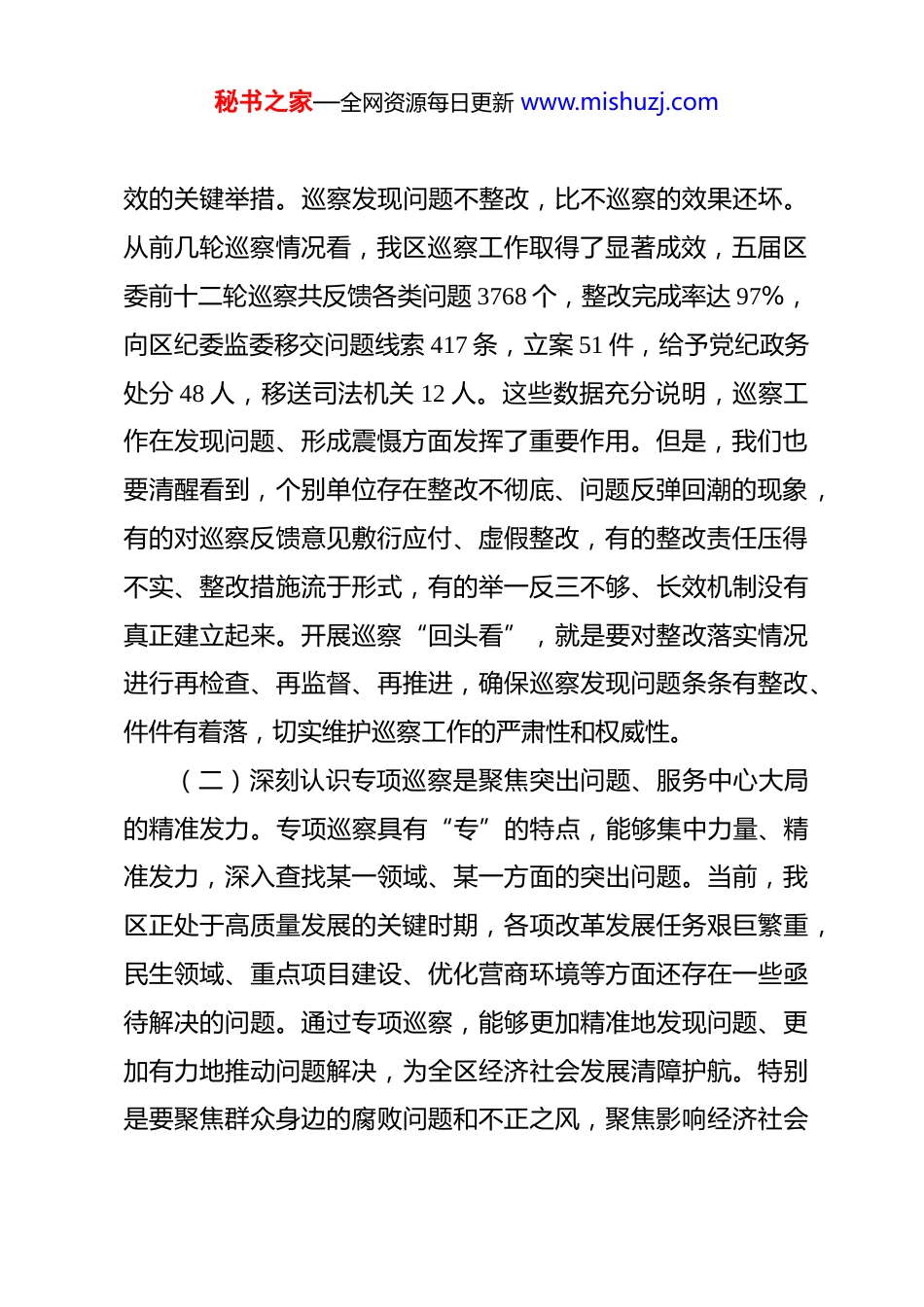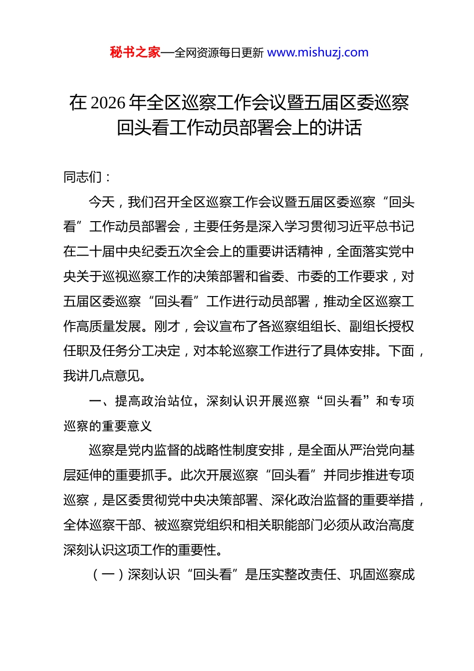 秘书之家—全网资源每日更新 www.mishuzj.com在 2026 年全区巡察工作会议暨五届区委巡察回头看工作动员部署会上的讲话 同志们:今天,我们召开全区巡察工作会议暨五届区委巡察“回头看”工作动员部署会,主要任务是深入学习贯彻习近平总书记在二十届中央纪委五次全会上的重要讲话精神,全面落实党中央关于巡视巡察工作的决策部署和省委、市委的工作要求,对五届区委巡察“回头看”工作进行动员部署,推动全区巡察工作高质量发展。刚才,会议宣布了各巡察组组长、副组长授权任职及任务分工决定,对本轮巡察工作进行了具体安排。下面,我讲几点意见。一、提高政治站位,深刻认识开展巡察“回头看”和专项巡察的重要意义巡察是党内监督的战略性制度安排,是全面从严治党向基层延伸的重要抓手。此次开展巡察“回头看”并同步推进专项巡察,是区委贯彻党中央决策部署、深化政治监督的重要举措,全体巡察干部、被巡察党组织和相关职能部门必须从政治高度深刻认识这项工作的重要性。(一)深刻认识“回头看”是压实整改责任、巩固巡察成秘书之家—全网资源每日更新 www.mishuzj.com效的关键举措。巡察发现问题不整改,比不巡察的效果还坏。从前几轮巡察情况看,我区巡察工作取得了显著成效,五届区委前十二轮巡察共反馈各类问题 3768 个,整改完成率达 97%,向区纪委监委移交问题线索 417 条,立案 51 件,给予党纪政务处分 48 人,移送司法机关 12 人。这些数据充分说明,巡察工作在发现问题、形成震慑方面发挥了重要作用。但是,我们也要清醒看到,个别单位存在整改不彻底、问题反弹回潮的现象,有的对巡察反馈意见敷衍应付、虚假整改,有的整改责任压得不实、整改措施流于形式,有的举一反三不够、长效机制没有真正建立起来。开展巡察“回头看”,就是要对整改落实情况进行再检查、再监督、再推进,确保巡察发现问题条条有整改、件件有着落,切实维护巡察工作的严肃性和权威性。(二)深刻认识专项巡察是聚焦突出问题、服务中心大局的精准发力。专项巡察具有“专”的特点,能够集中力量、精准发力,深入查找某一领域、某一方面的突出问题。当前,我区正处于高质量发展的关键时期,各项改革发展任务艰巨繁重,民生领域、重点项目建设、优化营商环境等方面还存在一些亟待解决的问题。通过专项巡察,能够更加精准地发现问题、更加有力地推动问题解决,为全区经济社会发展清障护航。特别是要聚焦群众身边的腐败问题和不正之风,聚焦影响经济社会秘书之家—全网资源每日更新 www.mishuzj.com发展的体制机制障碍,聚焦落实上级决策部署打折扣、搞变通等问题,以专项巡察的精准发力推动各项工作落地见效。(三)深刻认识本次巡察是深化监督实效、推动高质量发展的重要实践。党的二十大以来,党中央对巡视巡察工作提出了新的更高要求,强调要完善巡视巡察上下联动格局,推动巡察向基层延伸,做到有形覆盖和有效覆盖相统一。今年是“十五五”开局之年,也是我区实现巡察全覆盖目标的收官之年。在这个关键节点开展巡察“回头看”和专项巡察,既是对前几轮巡察成效的检验巩固,也是对巡察工作质量的全面提升,更是推动全面从严治党向纵深发展的重要实践。我们要通过这次巡察,进一步健全完善巡察工作制度机制,推动各类监督贯通融合,不断提升巡察工作的规范化、法治化、正规化水平。二、聚焦工作重点,精准推进巡察“回头看”工作走深走实巡察工作必须坚持问题导向、目标导向、结果导向相统一聚焦重点、精准发力,确保取得实实在在的成效。(一)对乡镇和区直单位的“回头看”要紧扣核心要求。要紧盯整改落实情况,对照巡察反馈问题清单,逐条逐项核查整改是否到位、是否彻底、是否真正解决问题,坚决防止虚假整改、数字整改、纸面整改。要紧盯政治责任履行,检查被巡秘书之家—全网资源每日更新 www.mishuzj.com察党组织是否真正承担起巡察整改主体责任,党组织书记是否履行第一责任人职责,班子成员是否落实“一岗双责”,是否存在把整改责任推给下属单位、推给具体工作人员的现象。要紧盯作风建设情况,深入查找是否存在形式主义、官僚主义问题,是否存在“等靠要”思想,是...