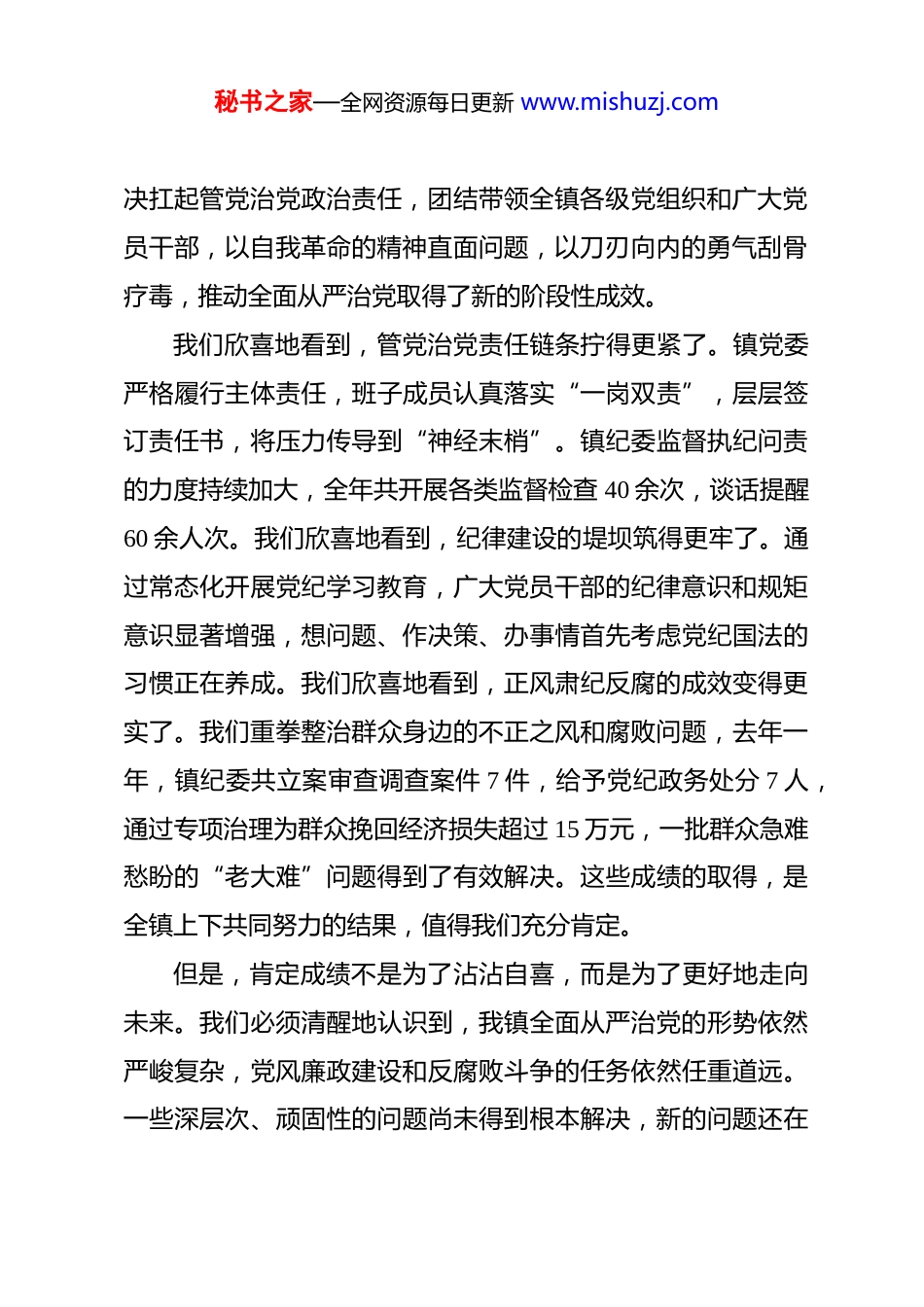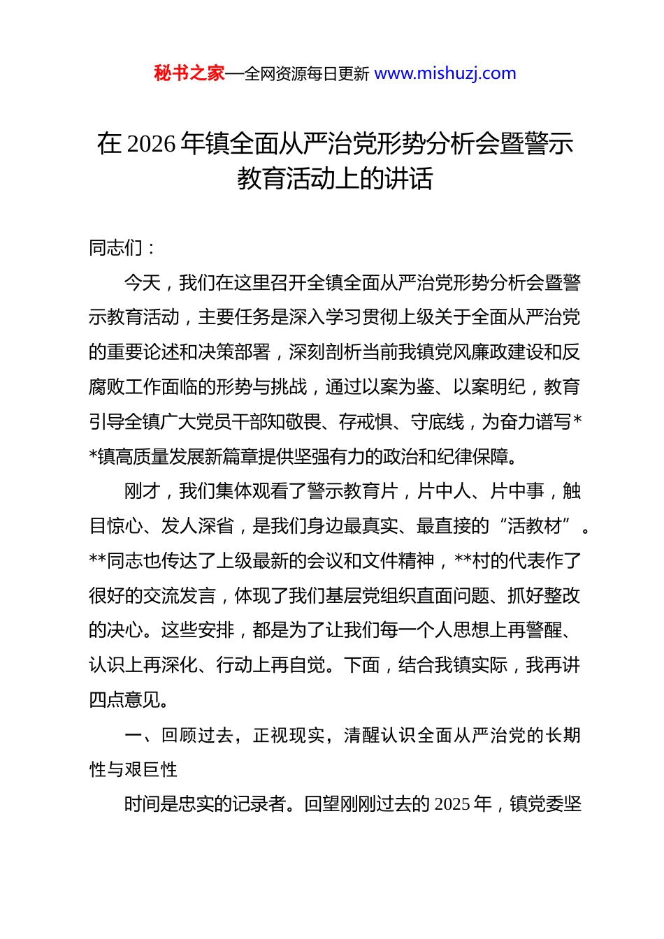 秘书之家—全网资源每日更新 www.mishuzj.com在 2026 年镇全面从严治党形势分析会暨警示教育活动上的讲话 同志们:今天,我们在这里召开全镇全面从严治党形势分析会暨警示教育活动,主要任务是深入学习贯彻上级关于全面从严治党的重要论述和决策部署,深刻剖析当前我镇党风廉政建设和反腐败工作面临的形势与挑战,通过以案为鉴、以案明纪,教育引导全镇广大党员干部知敬畏、存戒惧、守底线,为奋力谱写**镇高质量发展新篇章提供坚强有力的政治和纪律保障。刚才,我们集体观看了警示教育片,片中人、片中事,触目惊心、发人深省,是我们身边最真实、最直接的“活教材”。**同志也传达了上级最新的会议和文件精神,**村的代表作了很好的交流发言,体现了我们基层党组织直面问题、抓好整改的决心。这些安排,都是为了让我们每一个人思想上再警醒、认识上再深化、行动上再自觉。下面,结合我镇实际,我再讲四点意见。一、回顾过去,正视现实,清醒认识全面从严治党的长期性与艰巨性时间是忠实的记录者。回望刚刚过去的 2025 年,镇党委坚秘书之家—全网资源每日更新 www.mishuzj.com决扛起管党治党政治责任,团结带领全镇各级党组织和广大党员干部,以自我革命的精神直面问题,以刀刃向内的勇气刮骨疗毒,推动全面从严治党取得了新的阶段性成效。我们欣喜地看到,管党治党责任链条拧得更紧了。镇党委严格履行主体责任,班子成员认真落实“一岗双责”,层层签订责任书,将压力传导到“神经末梢”。镇纪委监督执纪问责的力度持续加大,全年共开展各类监督检查 40 余次,谈话提醒60 余人次。我们欣喜地看到,纪律建设的堤坝筑得更牢了。通过常态化开展党纪学习教育,广大党员干部的纪律意识和规矩意识显著增强,想问题、作决策、办事情首先考虑党纪国法的习惯正在养成。我们欣喜地看到,正风肃纪反腐的成效变得更实了。我们重拳整治群众身边的不正之风和腐败问题,去年一年,镇纪委共立案审查调查案件 7 件,给予党纪政务处分 7 人,通过专项治理为群众挽回经济损失超过 15 万元,一批群众急难愁盼的“老大难”问题得到了有效解决。这些成绩的取得,是全镇上下共同努力的结果,值得我们充分肯定。但是,肯定成绩不是为了沾沾自喜,而是为了更好地走向未来。我们必须清醒地认识到,我镇全面从严治党的形势依然严峻复杂,党风廉政建设和反腐败斗争的任务依然任重道远。一些深层次、顽固性的问题尚未得到根本解决,新的问题还在秘书之家—全网资源每日更新 www.mishuzj.com不断出现。从我们掌握的情况看,主要体现在几个方面:一是“思想松懈”的苗头依然存在。少数干部认为反腐败已经“抓得差不多了”,产生了“歇歇脚、松口气”的错误念头,对纪律规矩的敬畏之心有所淡化,认为“基层无大错、小节无大碍”的侥幸心理依然有市场。二是“为官不为”的现象依然存在。有的干部担当精神不足,面对矛盾绕道走,面对难题往上推,工作满足于“开会发文、传达部署”,抓落实“雷声大、雨点小”,缺乏攻坚克难的锐气和钉钉子精神。三是“微腐败”的土壤依然存在。在工程项目、惠农补贴、集体“三资”管理等重点领域和关键环节,制度漏洞和监管盲区依然存在,不收敛、不收手的现象在个别干部身上仍有发生,啃食群众获得感的“蝇贪蚁腐”问题禁而未绝。四是“作风顽疾”的根除依然艰难。形式主义、官僚主义问题树倒根存,文山会海、过度留痕等现象时有反弹,增加了基层负担,影响了工作实效。这些问题,虽然发生在少数人身上,但严重损害了党的形象和公信力,侵蚀了党群干群关系。我们必须以高度的政治自觉,正视这些问题,拿出壮士断腕的决心,采取坚决有力的措施,切实加以解决。二、以“敬畏之心”立根固魂,筑牢拒腐防变的思想堤坝古人云:“凡善怕者,必身有所正,言有所规,行有所秘书之家—全网资源每日更新 www.mishuzj.com止。”敬畏是最好的“护身符”。广大党员干部,特别是手握公权力的同志们,必须常怀敬畏之心,时刻保持对党、对人民、对法纪的敬畏,这是我们安身立命的根本,也是拒腐防变的思想基础。要敬畏组织,做到绝对忠诚。要始终牢记自己的第一身份是共产党员,...