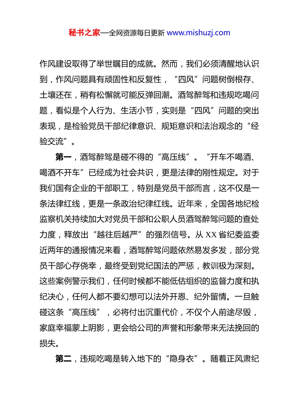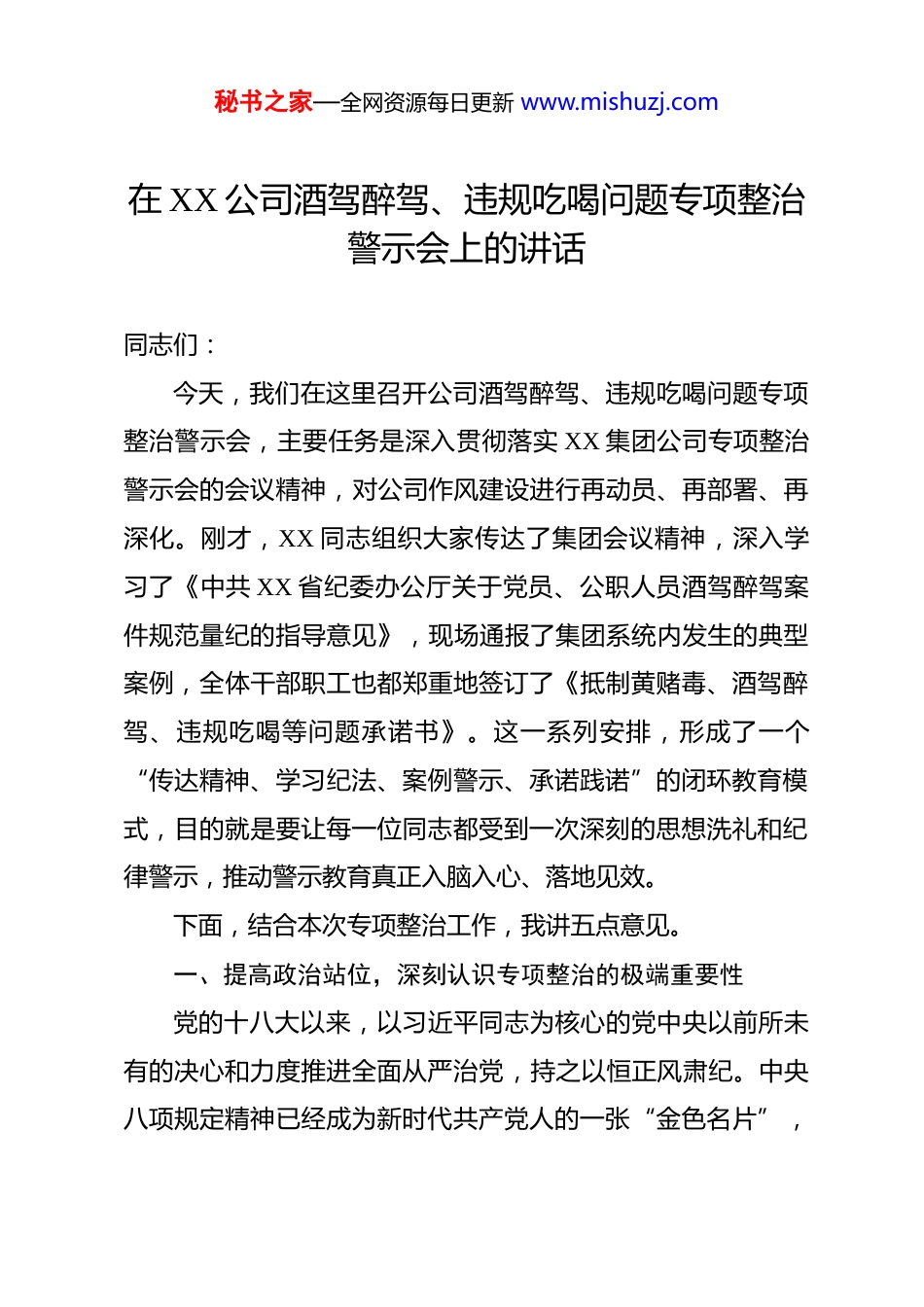 秘书之家—全网资源每日更新 www.mishuzj.com在 XX 公司酒驾醉驾、违规吃喝问题专项整治警示会上的讲话 同志们:今天,我们在这里召开公司酒驾醉驾、违规吃喝问题专项整治警示会,主要任务是深入贯彻落实 XX 集团公司专项整治警示会的会议精神,对公司作风建设进行再动员、再部署、再深化。刚才,XX 同志组织大家传达了集团会议精神,深入学习了《中共 XX 省纪委办公厅关于党员、公职人员酒驾醉驾案件规范量纪的指导意见》,现场通报了集团系统内发生的典型案例,全体干部职工也都郑重地签订了《抵制黄赌毒、酒驾醉驾、违规吃喝等问题承诺书》。这一系列安排,形成了一个“传达精神、学习纪法、案例警示、承诺践诺”的闭环教育模式,目的就是要让每一位同志都受到一次深刻的思想洗礼和纪律警示,推动警示教育真正入脑入心、落地见效。下面,结合本次专项整治工作,我讲五点意见。一、提高政治站位,深刻认识专项整治的极端重要性党的十八大以来,以习近平同志为核心的党中央以前所未有的决心和力度推进全面从严治党,持之以恒正风肃纪。中央八项规定精神已经成为新时代共产党人的一张“金色名片”,秘书之家—全网资源每日更新 www.mishuzj.com作风建设取得了举世瞩目的成就。然而,我们必须清醒地认识到,作风问题具有顽固性和反复性,“四风”问题树倒根存、土壤还在,稍有松懈就可能反弹回潮。酒驾醉驾和违规吃喝问题,看似是个人行为、生活小节,实则是“四风”问题的突出表现,是检验党员干部纪律意识、规矩意识和法治观念的“经验交流”。第一,酒驾醉驾是碰不得的“高压线”。“开车不喝酒、喝酒不开车”已经成为社会共识,更是法律的刚性规定。对于我们国有企业的干部职工,特别是党员干部而言,这不仅是一条法律红线,更是一条政治纪律红线。近年来,全国各地纪检监察机关持续加大对党员干部和公职人员酒驾醉驾问题的查处力度,释放出“越往后越严”的强烈信号。从 XX 省纪委监委近两年的通报情况来看,酒驾醉驾问题依然易发多发,部分党员干部心存侥幸,最终受到党纪国法的严惩,教训极为深刻。这些案例警示我们,任何时候都不能低估组织的监督力度和执纪决心,任何人都不要幻想可以法外开恩、纪外留情。一旦触碰这条“高压线”,必将付出沉重代价,不仅个人前途尽毁,家庭幸福蒙上阴影,更会给公司的声誉和形象带来无法挽回的损失。第二,违规吃喝是转入地下的“隐身衣”。随着正风肃纪秘书之家—全网资源每日更新 www.mishuzj.com的深入,公开的、大规模的公款吃喝问题得到了有效遏制,但一些隐形变异的“四风”问题仍然存在。违规吃喝就是其中最典型的代表,它往往披着“私人聚会”“朋友宴请”的外衣,躲在“不吃公款吃老板”的幌子下,具有极强的隐蔽性和迷惑性。这些饭局、酒局,表面上是人情往来,实际上可能是“围猎”的开始,是腐败的温床。从查处的案件看,很多违纪违法行为都是从一顿饭、一杯酒开始的。更有甚者,酒驾醉驾问题背后往往隐藏着违规接受宴请、公款吃喝等更深层次的作风问题和腐败问题。我们必须高度警惕,深刻认识到违规吃喝的严重危害性,坚决抵制任何可能影响公正执行公务的宴请,决不能在推杯换盏中迷失方向、丧失原则。第三,作风建设是企业发展的“生命线”。我们 XX 公司作为省属重点骨干企业,肩负着推动地方经济社会发展的重要使命。优良的作风是凝聚力、是战斗力,更是推动公司高质量发展的核心竞争力。一支纪律严明、作风过硬的队伍,才能在激烈的市场竞争中攻坚克难、行稳致远。反之,如果纪律松弛、作风涣散,酒驾醉驾、违规吃喝等问题屡禁不止,不仅会败坏企业风气,侵蚀干部职工的奋斗精神,更会影响公司的决策执行力和整体形象,最终损害的是我们全体员工的共同利益。因此,开展此次专项整治,绝非小题大做,而是关系公司生存发秘书之家—全网资源每日更新 www.mishuzj.com展的重大政治任务,是保障公司高质量发展的必然要求。全体干部职工必须从讲政治、顾大局的高度,充分认识其极端重要性和现实紧迫性,切实把思想和行动统一到集团党委和公司党委的决策部署上来。二、聚焦关键环节,以最高标准最严要求抓好贯...