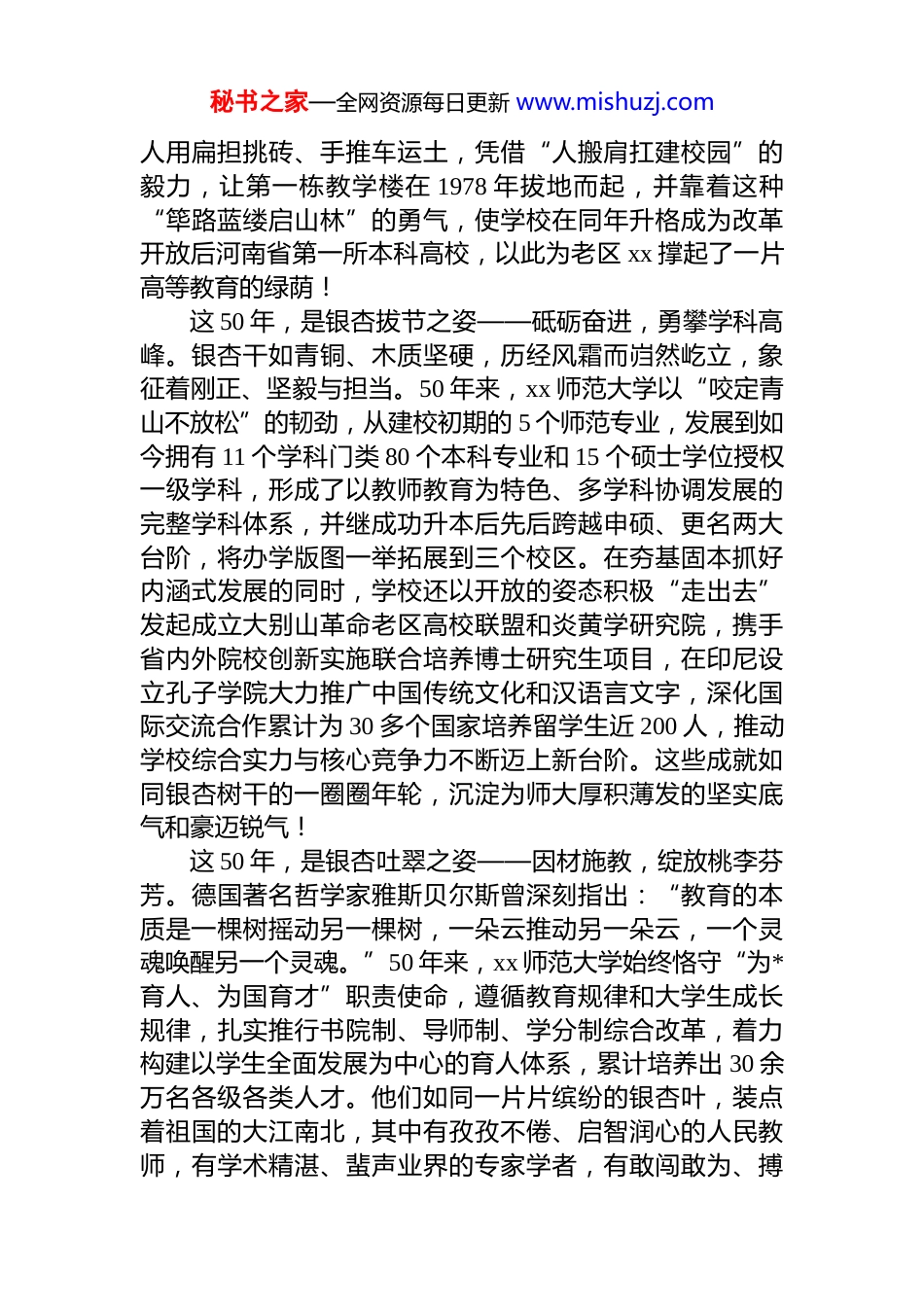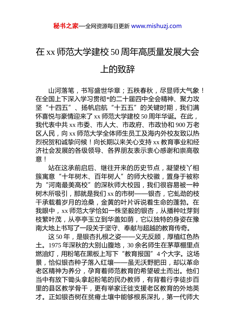 秘书之家—全网资源每日更新 www.mishuzj.com在 xx 师范大学建校 50 周年高质量发展大会上的致辞山河落笔,书写盛世华章;五秩春秋,尽显师大气象!在全国上下深入学习贯彻*的二十届四中全会精神、聚力攻坚“十四五”、扬帆启航“十五五”的关键时期,我们满怀喜悦与豪情迎来了 xx 师范大学建校 50 周年华诞。在此,我代表中共 xx 市委、市人大、市政府、市政协和 900 万老区人民,向 xx 师范大学全体师生员工及海内外校友致以热烈祝贺和诚挚问候!向长期以来关心支持 xx 教育事业和经济社会发展的各级领导、各界朋友表示衷心感谢和崇高敬意!站在这承前启后、继往开来的历史节点,凝望枝丫相簇寓意“十年树木、百年树人”的师大校徽,置身于被称为“河南最美高校”的深秋师大校园,我们很容易被一种树木所吸引,那就是我们 xx 的市树——银杏,它虬劲的枝干承载着岁月的沧桑,金黄的叶片诉说着生命的蓬勃。在我眼中,xx 师范大学恰如一株坚毅的银杏,从播种吐芽到枝繁叶茂,从亭亭玉立到华盖如荫,它以独特的身姿在豫南大地上书写了一段关于坚守、奉献与超越的教育传奇。这 50 年,是银杏扎根之姿——义无反顾,厚植红色热土。1975 年深秋的大别山腹地,30 余名师生在茅草棚里点燃油灯,用粉笔在黑板上写下“教育报国”4 个大字。这场景,恰似银杏种子落入红壤——虽无沃野肥田,却以革命老区精神为养分,孕育着师范教育的希望破土而出。他们当中有放下锄头拿起粉笔的民办教师,有背着行李徒步百里的县区教学骨干,更有举家迁徙支援老区教育的外地英才。正如银杏树在贫瘠土壤中能够根系深扎,第一代师大秘书之家—全网资源每日更新 www.mishuzj.com人用扁担挑砖、手推车运土,凭借“人搬肩扛建校园”的毅力,让第一栋教学楼在 1978 年拔地而起,并靠着这种“筚路蓝缕启山林”的勇气,使学校在同年升格成为改革开放后河南省第一所本科高校,以此为老区 xx 撑起了一片高等教育的绿荫!这 50 年,是银杏拔节之姿——砥砺奋进,勇攀学科高峰。银杏干如青铜、木质坚硬,历经风霜而岿然屹立,象征着刚正、坚毅与担当。50 年来,xx 师范大学以“咬定青山不放松”的韧劲,从建校初期的 5 个师范专业,发展到如今拥有 11 个学科门类 80 个本科专业和 15 个硕士学位授权一级学科,形成了以教师教育为特色、多学科协调发展的完整学科体系,并继成功升本后先后跨越申硕、更名两大台阶,将办学版图一举拓展到三个校区。在夯基固本抓好内涵式发展的同时,学校还以开放的姿态积极“走出去”发起成立大别山革命老区高校联盟和炎黄学研究院,携手省内外院校创新实施联合培养博士研究生项目,在印尼设立孔子学院大力推广中国传统文化和汉语言文字,深化国际交流合作累计为 30 多个国家培养留学生近 200 人,推动学校综合实力与核心竞争力不断迈上新台阶。这些成就如同银杏树干的一圈圈年轮,沉淀为师大厚积薄发的坚实底气和豪迈锐气!这 50 年,是银杏吐翠之姿——因材施教,绽放桃李芬芳。德国著名哲学家雅斯贝尔斯曾深刻指出:“教育的本质是一棵树摇动另一棵树,一朵云推动另一朵云,一个灵魂唤醒另一个灵魂。”50 年来,xx 师范大学始终恪守“为*育人、为国育才”职责使命,遵循教育规律和大学生成长规律,扎实推行书院制、导师制、学分制综合改革,着力构建以学生全面发展为中心的育人体系,累计培养出 30 余万名各级各类人才。他们如同一片片缤纷的银杏叶,装点着祖国的大江南北,其中有孜孜不倦、启智润心的人民教师,有学术精湛、蜚声业界的专家学者,有敢闯敢为、搏秘书之家—全网资源每日更新 www.mishuzj.com击商海的企业精英,有服务基层、勤政为民的*政干部,还有更多在平凡岗位上做出不平凡贡献的普通劳动者。无论身在何方、位居何职,这些师大学子都秉承母校教诲,以“基础扎实、为人诚实、作风朴实、工作务实”的“四实”品质赢得社会广泛赞誉,也当之无愧成为师大 50 年办学价值最有力的体现、育人成果最生动的注脚!这 50 年,是银杏反哺之姿——产教融合,铺陈发展画卷。大学因城市而兴,城市因大学而盛。50 年来,师...