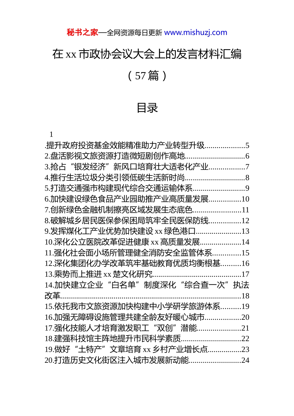 秘书之家—全网资源每日更新 www.mishuzj.com在 xx 市政协会议大会上的发言材料汇编(57 篇)目录1.提升政府投资基金效能精准助力产业转型升级....................52.盘活影视文旅资源打造微短剧创作高地..............................63.抢占“银发经济”新风口培育壮大适老化产业..................74.推行生活垃圾分类引领低碳生活新时尚..............................85.打造交通强市构建现代综合交通运输体系..........................96.加快建设绿色食品产业园助推产业高质量发展................107.创新绿色金融机制擦亮区域发展生态底色........................118.破解城乡居民医保参保困局筑牢全民医保防线................129.发挥煤化工产业优势加快建设 xx 绿色港口.......................1310.深化公立医院改革促进健康 xx 高质量发展.....................1411.强化社会面小场所管理健全消防安全监管体系..............1512.深化集团化办学改革筑牢基础教育优质均衡根基..........1613.乘势而上推进 xx 楚文化研究.............................................1714.加快建立企业“白名单”制度深化“综合查一次”执法改革...........................................................................................1815.依托我市文旅资源加快构建中小学研学旅游体系..........1916.加强无障碍设施管理共建全龄友好暖心城市..................2017.强化技能人才培育激发职工“双创”潜能......................2118.建强科技馆主阵地提升市民科学素质..............................2219.做好“土特产”文章培育 xx 乡村产业增长点.................2320.打造历史文化街区注入城市发展新动能..........................24秘书之家—全网资源每日更新 www.mishuzj.com21.强化政银企协同构建三大金融模式全面激活 xx 高质量发展新动能...................................................................................2522.丰富消费业态提振消费能力..............................................2723.优化民营经济发展环境激发 xx 经济内生动力.................2824.打好产业转型“突围战”全面构建新能源电池产业发展新格局.......................................................................................2925.以“四个农业”为统领推动富硒农业高质量发展..........3126.聚力绿色发展塑强新质优势构筑 xx 钙基产业高质量发展新格局.......................................................................................3227.发挥 xx 国防教育独特优势激发中小学生奋进精神动力.3328.把握政策机遇激活资金效能推动老工业城市更新蝶变. .3429.完善权益保障制度健全协同联动机制推动新就业形态规范健康发展...............................................................................3630.深挖 xx 特色资源打造辐射 xxx 康养基地.........................3731.做强狮脑山红色文旅激活全域发展动能..........................3932.以院士工作站为引领强化人才支撑作用赋能 xx 高质量发展...............................................................................................4133.多措并举优化营商环境推动民营经济发展壮大..............4334.加快建设晋东区域医疗中心进一步提升我市医疗服务能级...............................................................................................4535.强师资赋能科技教育育新人助力 xx 发展.........................4736.把乡村振兴成绩写在云岭大地上......................................4837.推动“旅居 xx”实现高质量发展........................................5038.构建科技人才教育支撑体系..............................................5239.推动县域联动协同发展......................................................5440.以 AI 赋能低空经济高质量发展...........................................